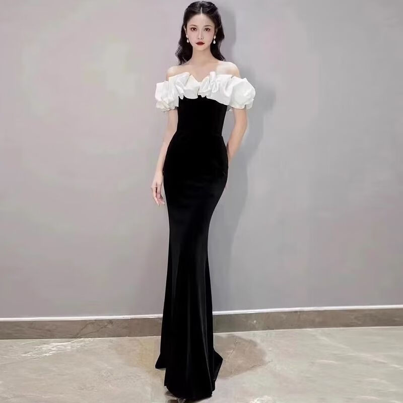婍妡black evening dress 2025 new style French one-shoulder high-end light luxury temperament slimming celebrity host fishtail red S