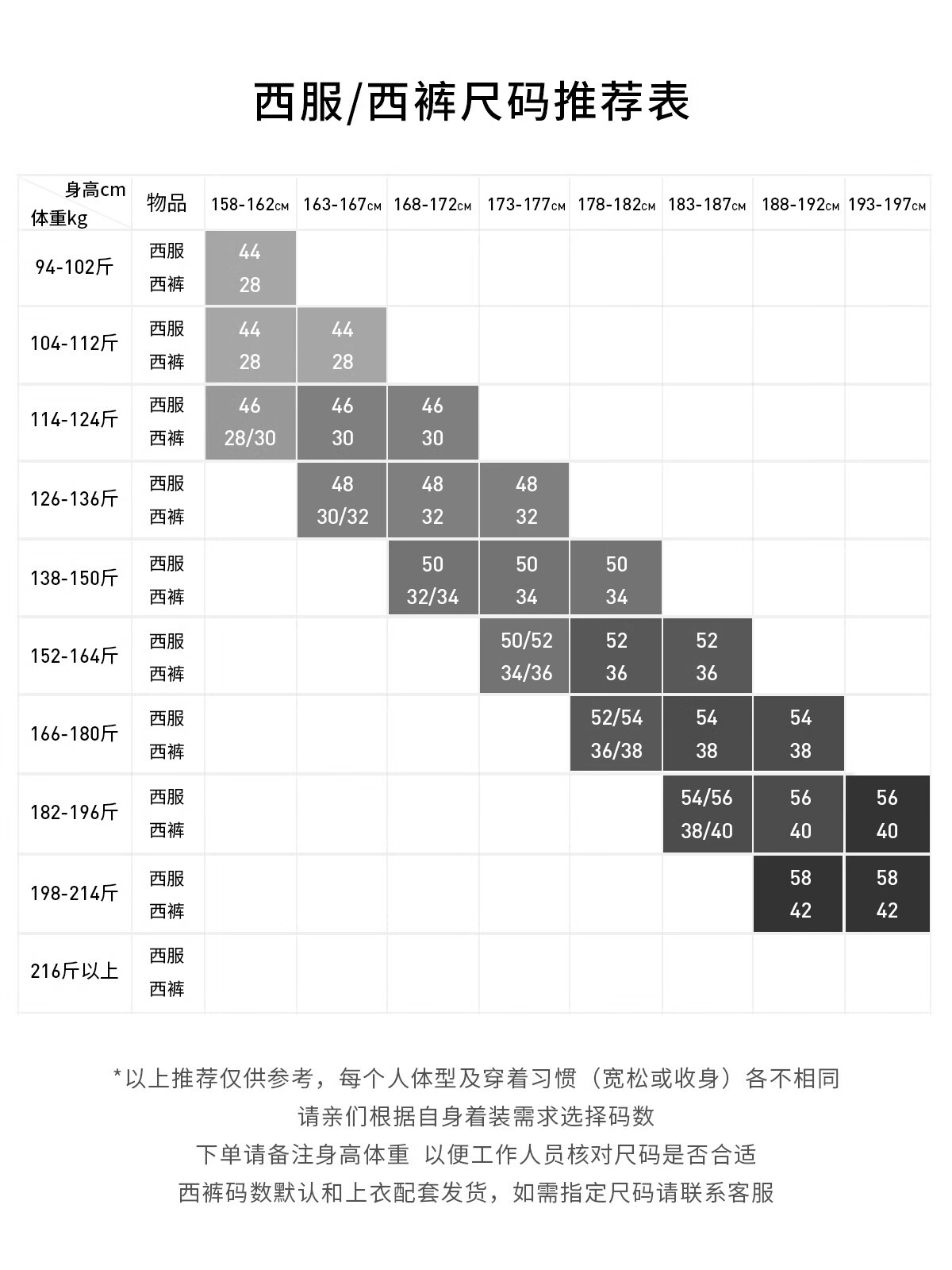 China (cm) 160-165/84-86 165-170 / 88-90 167-172 / 92-96 168-173 / 98-102 170-176 / 106-110
