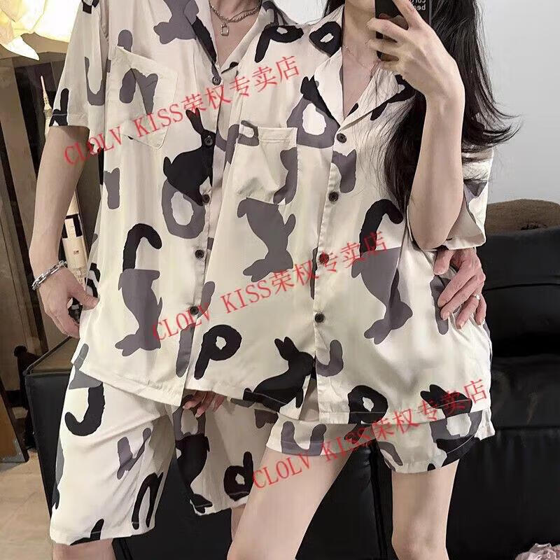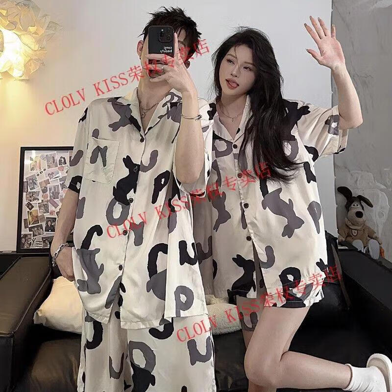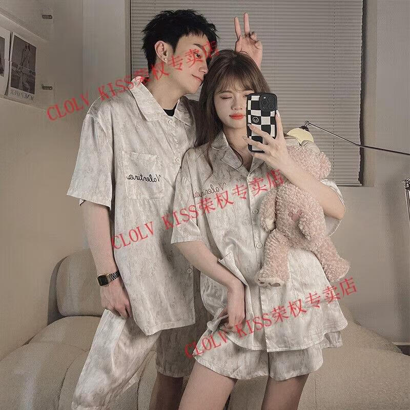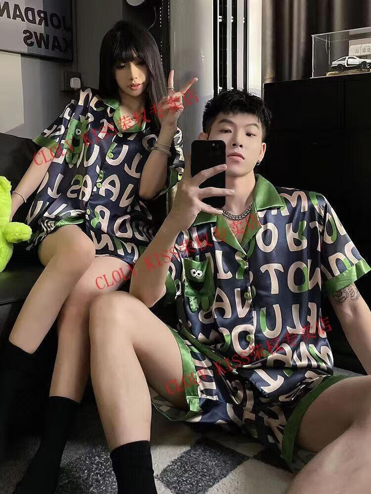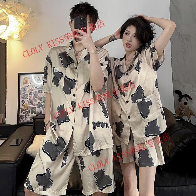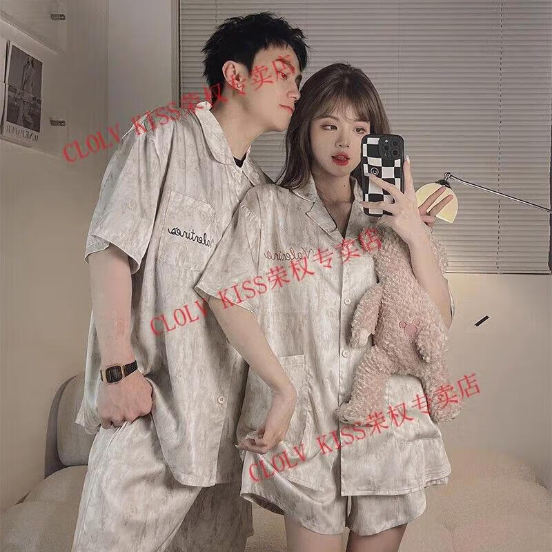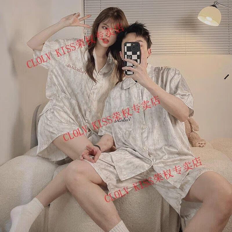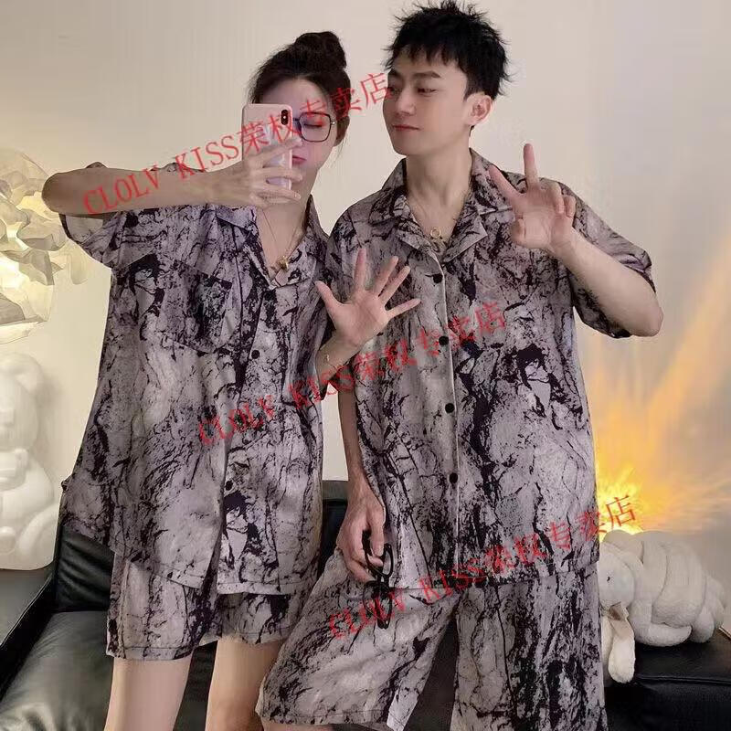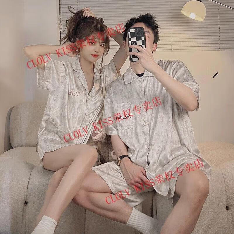 Clolv kissCK summer light luxury couple pajamas ice silk one male and one female student dormitory home clothes suit short-sleeved shorts CX418# gray letters high quality female M + male L 2 sets in total