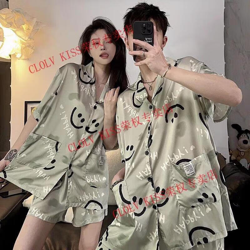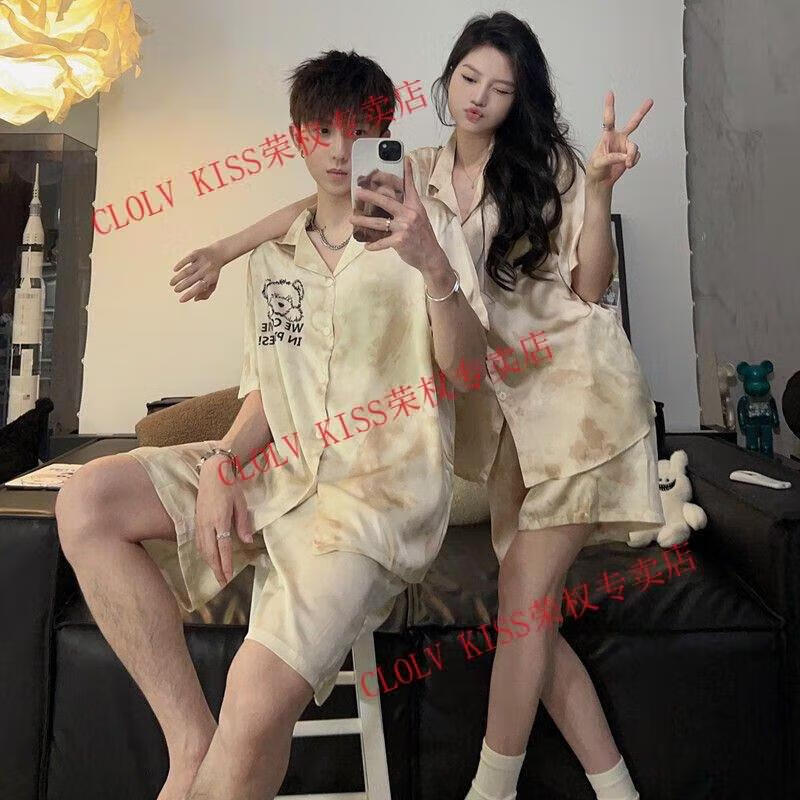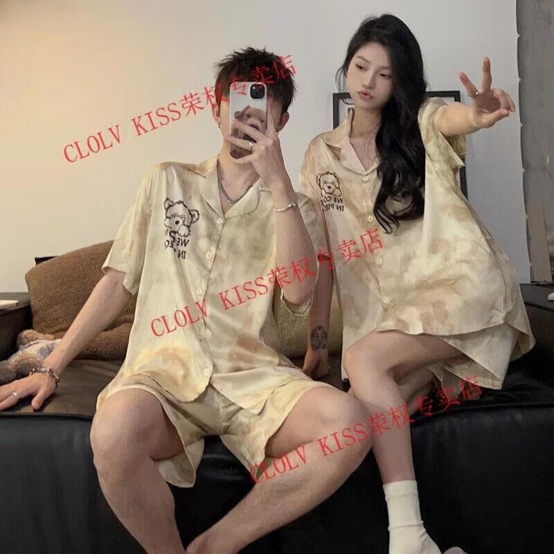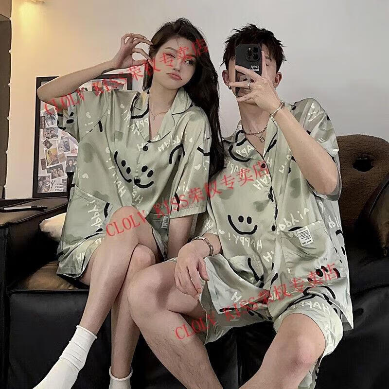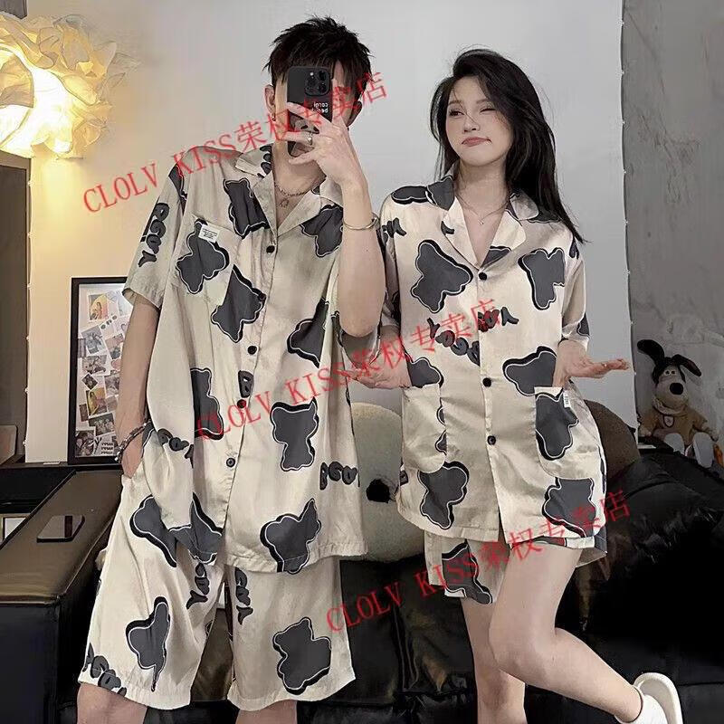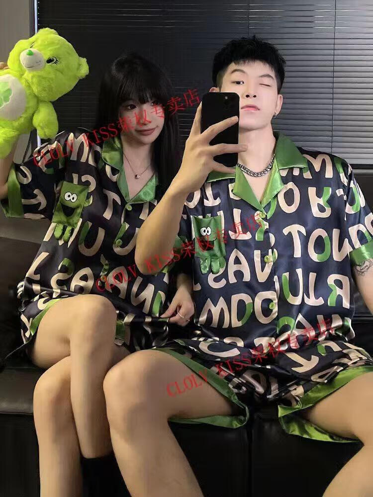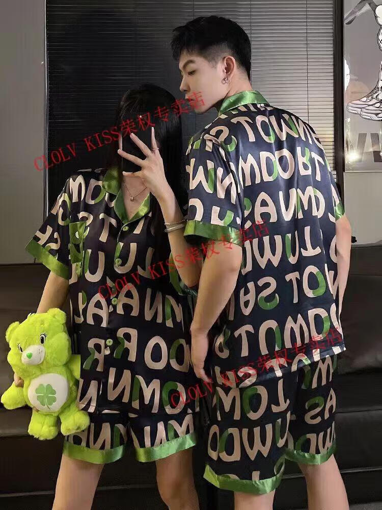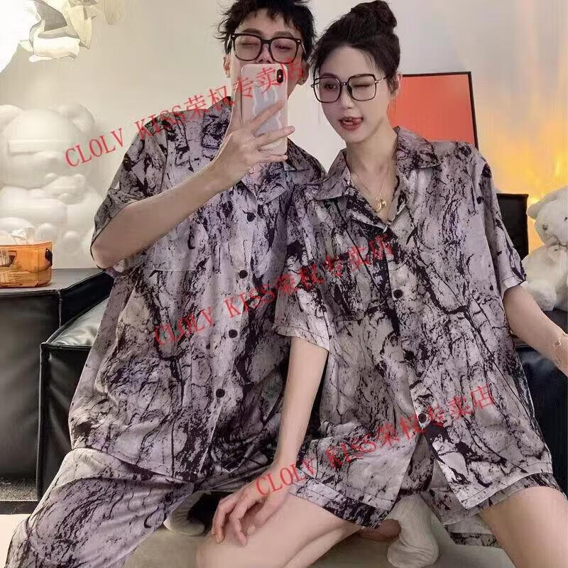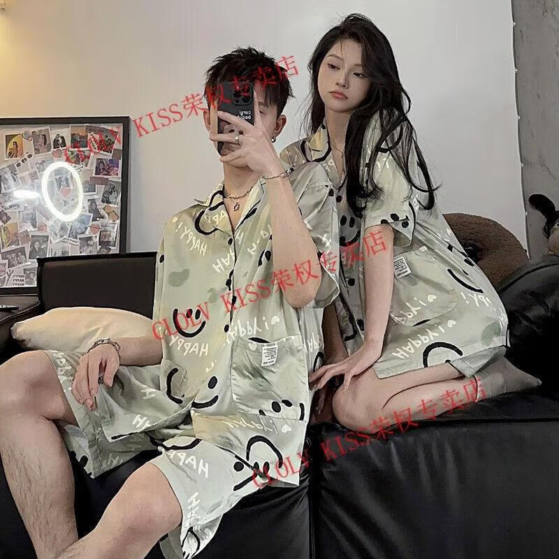 Clolv kissCK summer light luxury couple pajamas ice silk one male and one female student dormitory home clothes suit short-sleeved shorts CX418# gray letters high quality female M + male L 2 sets in total