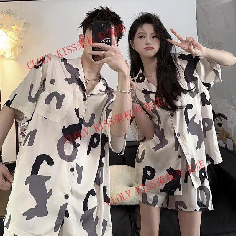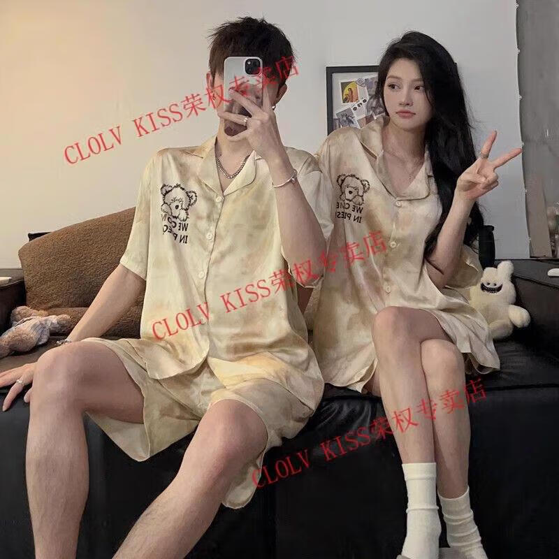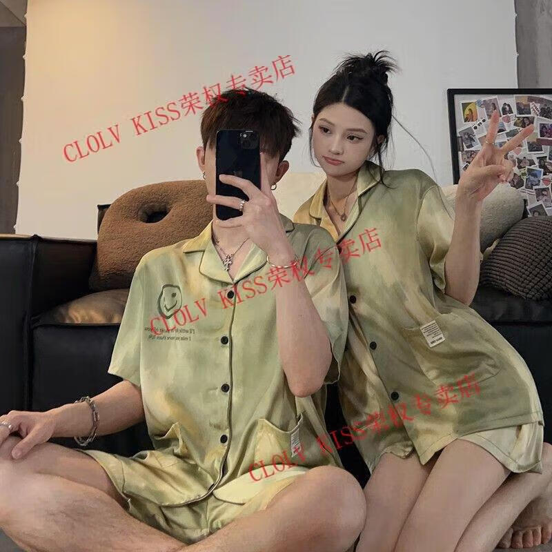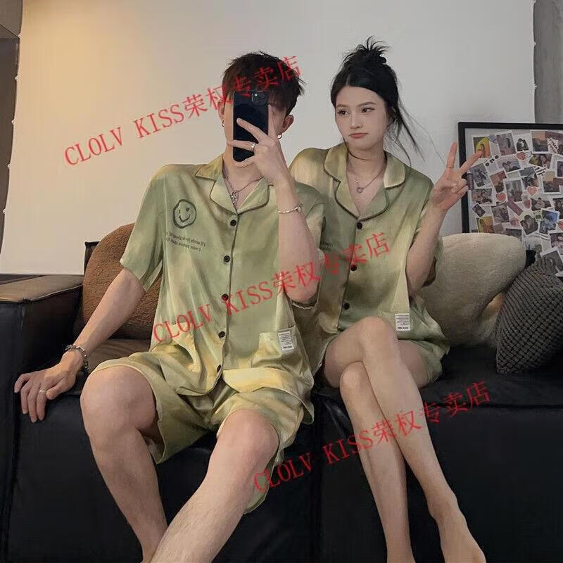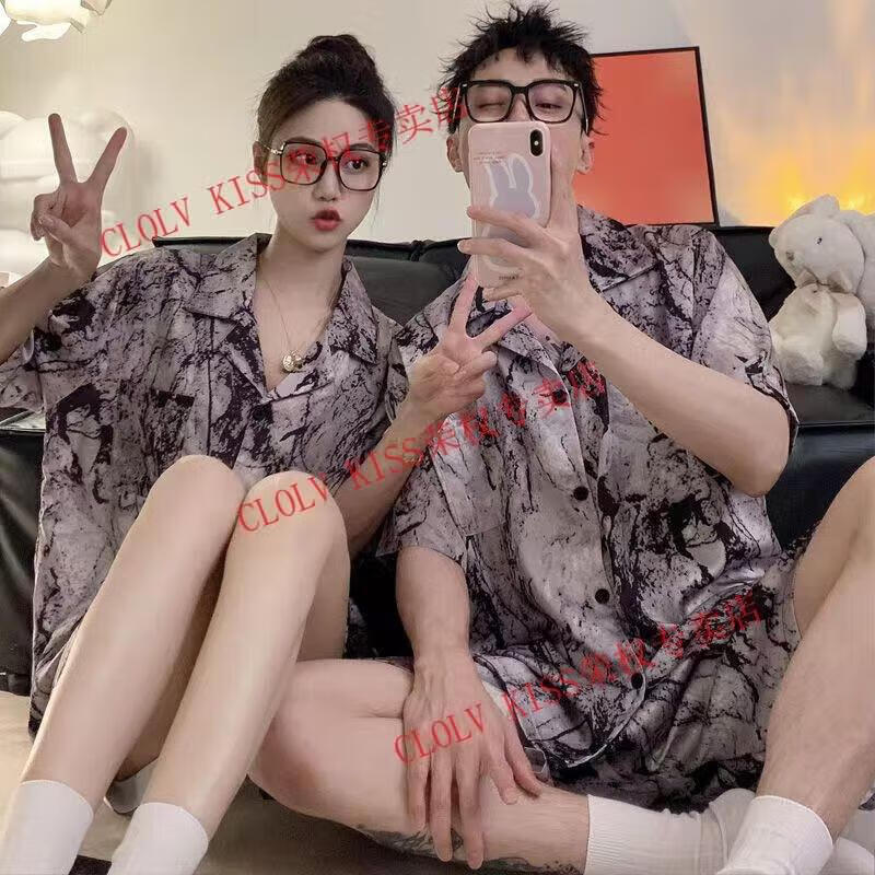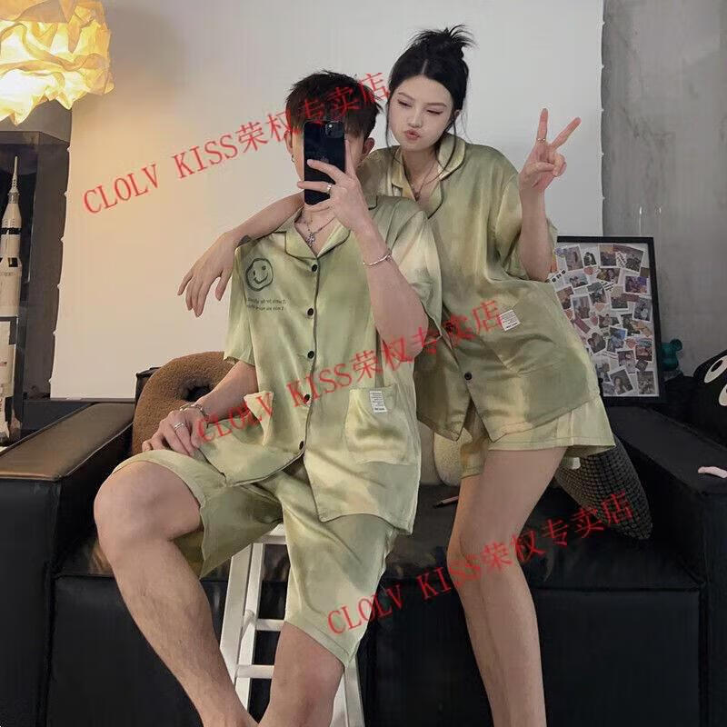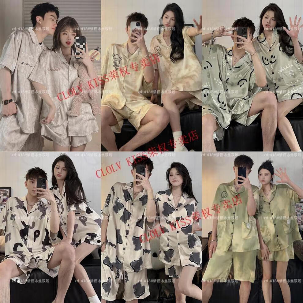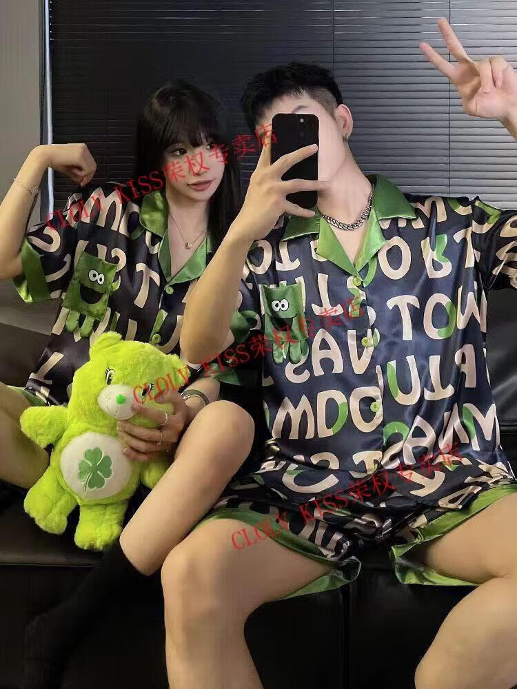 Clolv kissCK summer light luxury couple pajamas ice silk one male and one female student dormitory home clothes suit short-sleeved shorts CX418# gray letters high quality female M + male L 2 sets in total