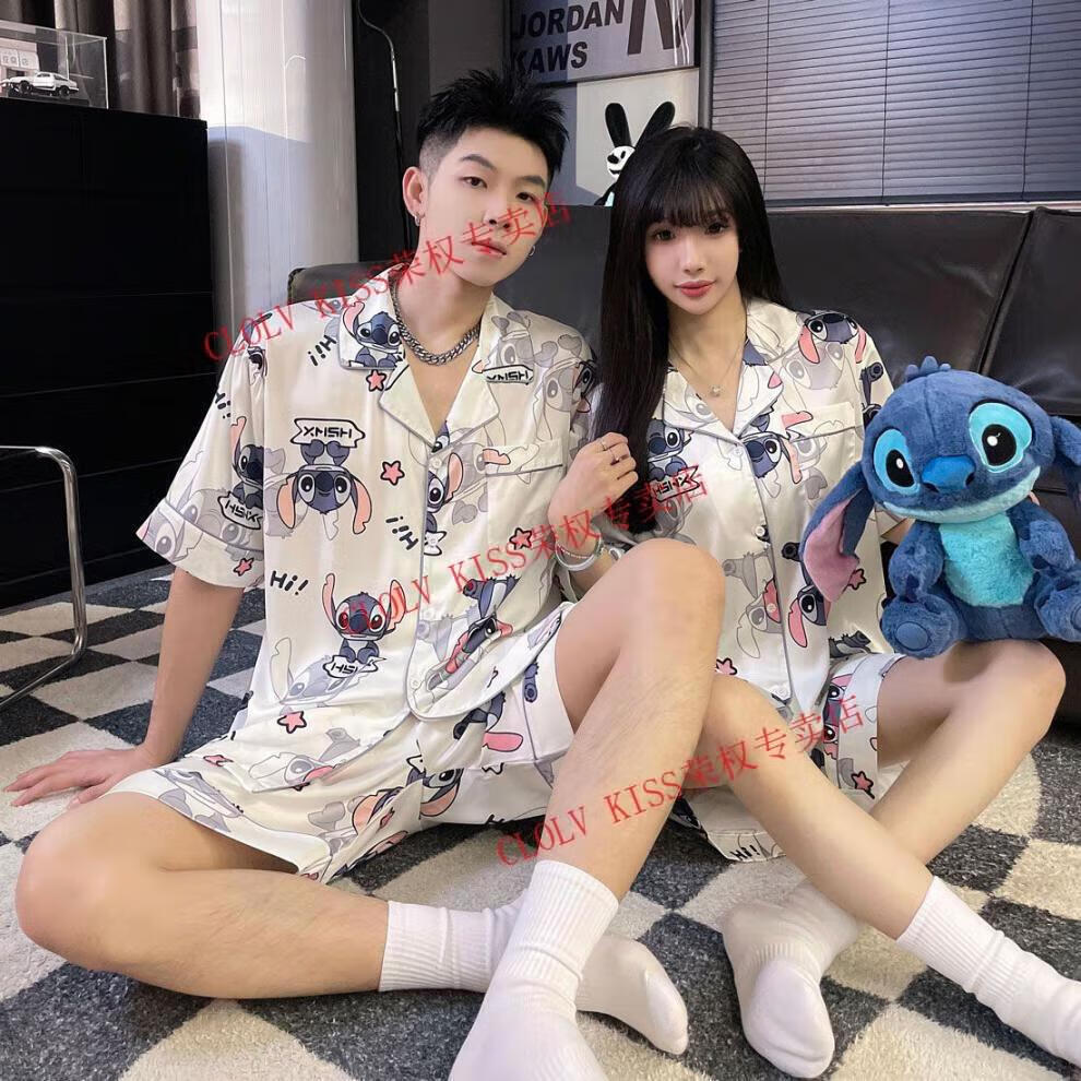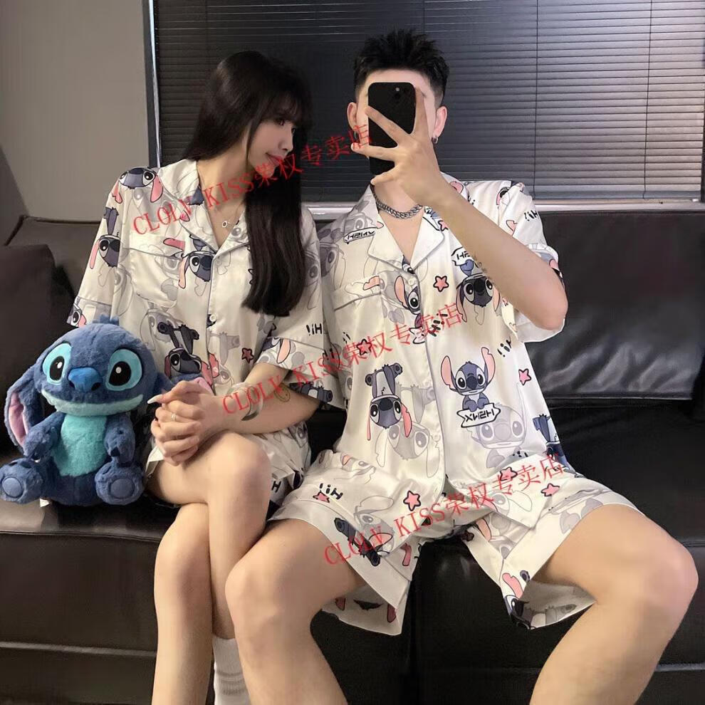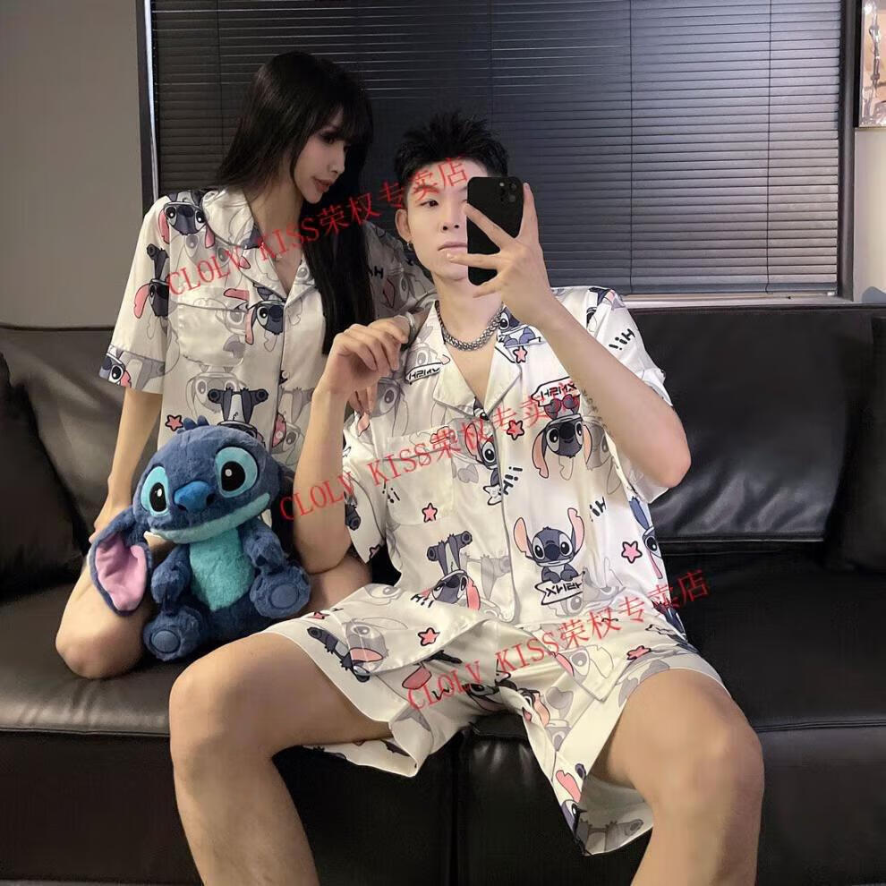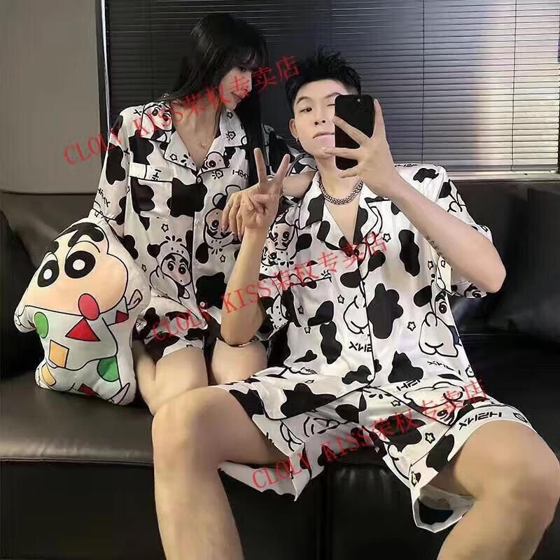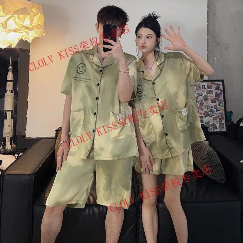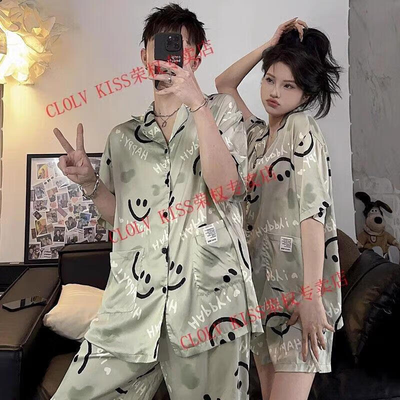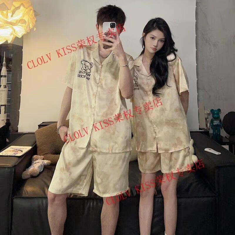 Clolv kissCK summer light luxury couple pajamas ice silk one male and one female student dormitory home clothes suit short-sleeved shorts CX418# gray letters high quality female M + male L 2 sets in total