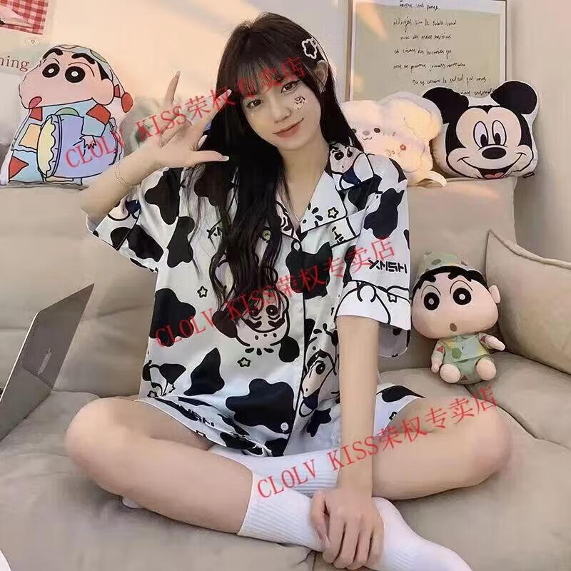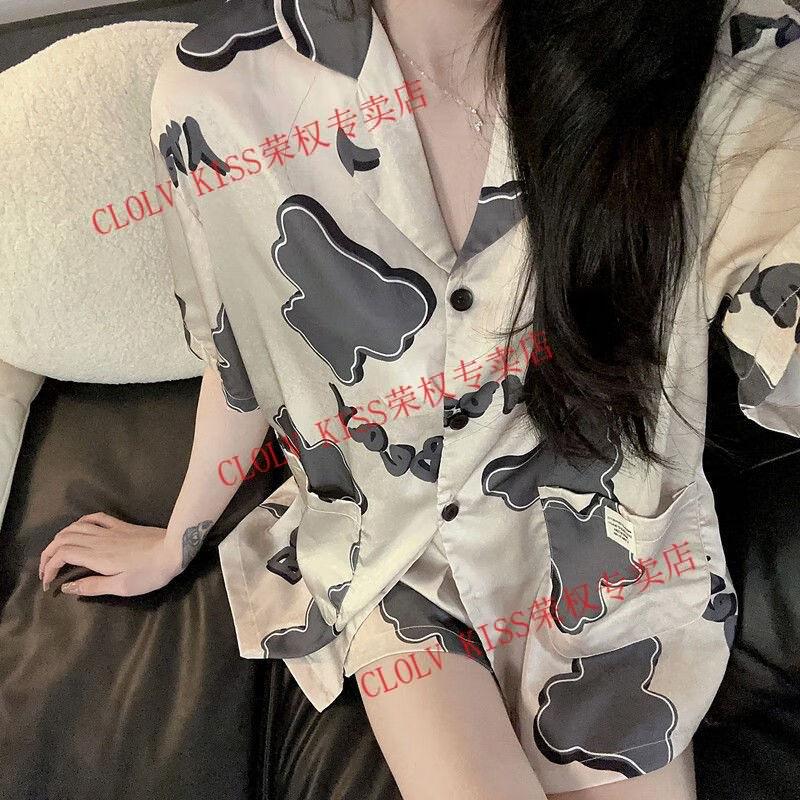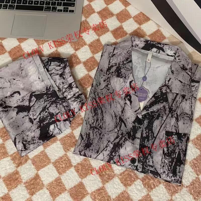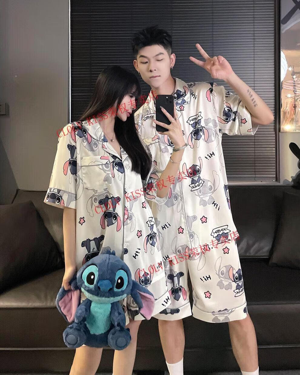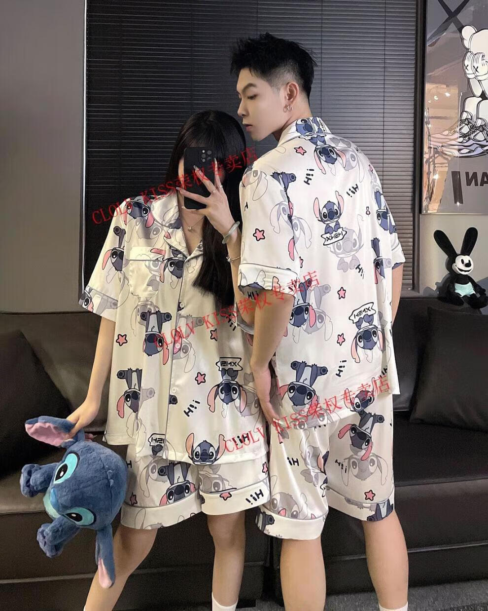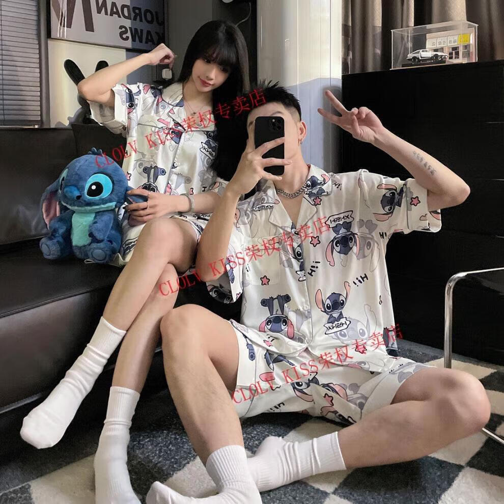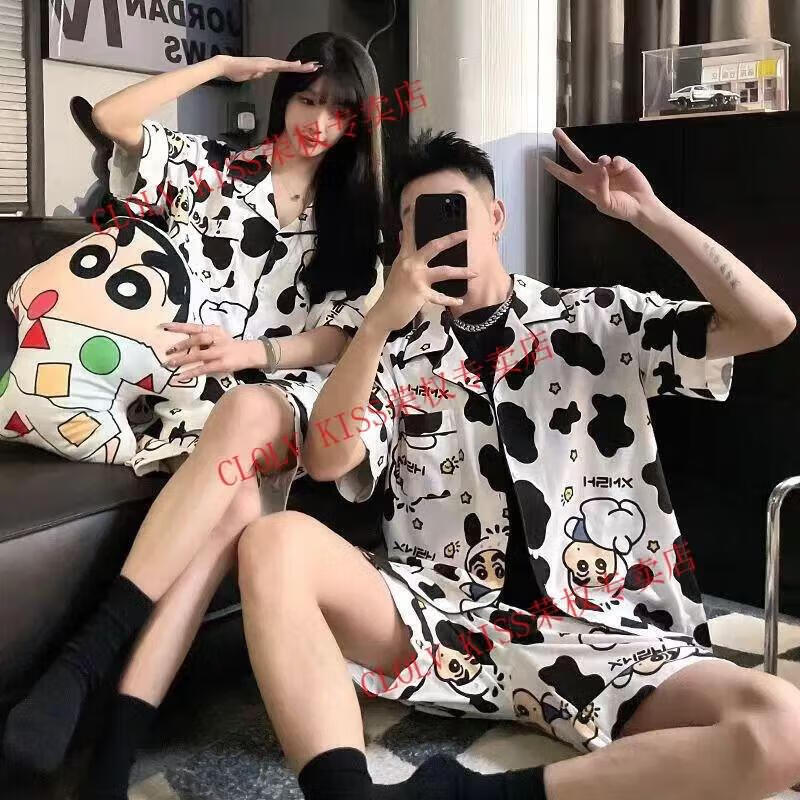 Clolv kissCK summer light luxury couple pajamas ice silk one male and one female student dormitory home clothes suit short-sleeved shorts CX418# gray letters high quality female M + male L 2 sets in total