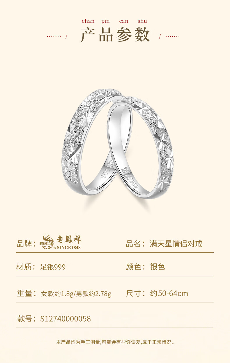 Lao Fengxiang 999 Pure Silver Sterling Silver Couple Ring for Men and Women Confession Rings Jewelry Valentine's Day Birthday Gift for Girlfriend and Wife Jingsuda 999 Silver Gypsophila Couple Ring