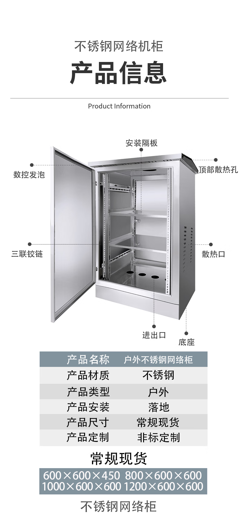 Outdoor stainless steel network cabinet switch function 6u wireless monitoring weak current equipment cabinet floor standing 24u rainproof box 304 stainless steel 2200*600*600mm