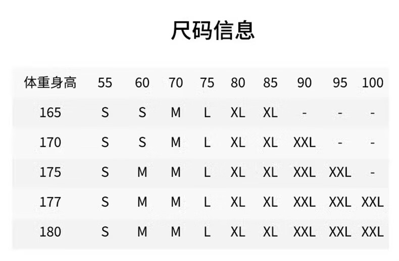 China (cm) 160-165/84-86 165-170 / 88-90 167-172 / 92-96 168-173 / 98-102 170-176 / 106-110
