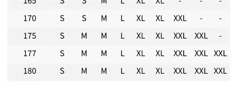 China (cm) 165 / 88-90 170 / 96-98 175 / 108-110 180 / 118-122 185 / 126-130