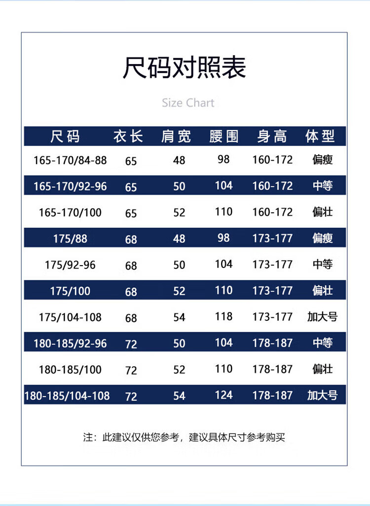 China (cm) 165 / 88-90 170 / 96-98 175 / 108-110 180 / 118-122 185 / 126-130