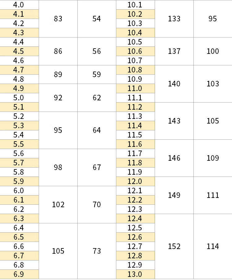 76.2 81.3 86.4 91.5 96.5 101.6 106.7 112 117 122 127 132 137 142