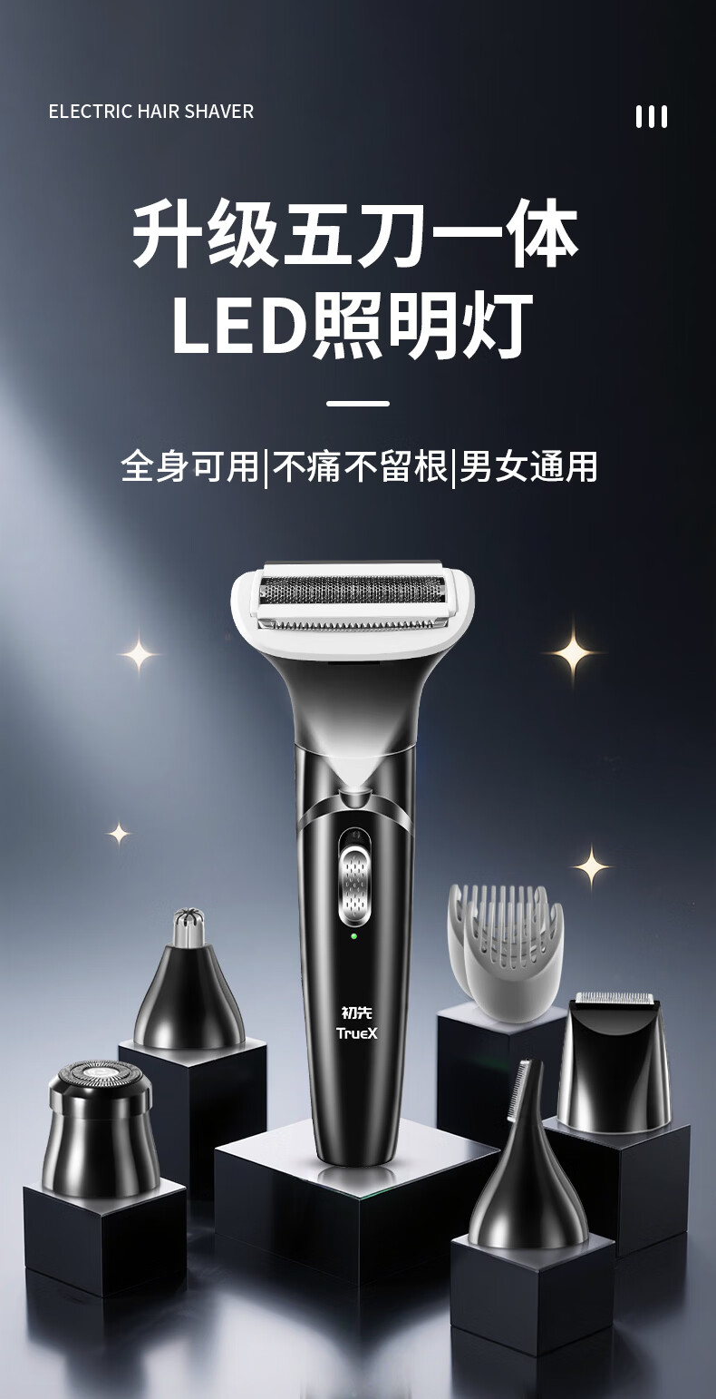 TrueX electric private part shaver, epilator, armpit eyebrow trimmer, leg hair, nose hair trimmer, men's and women's pubic epilator, lower body shaver, private part armpit hair, anal hair, upgraded 5-head lighting model, strong power, efficient hair removal