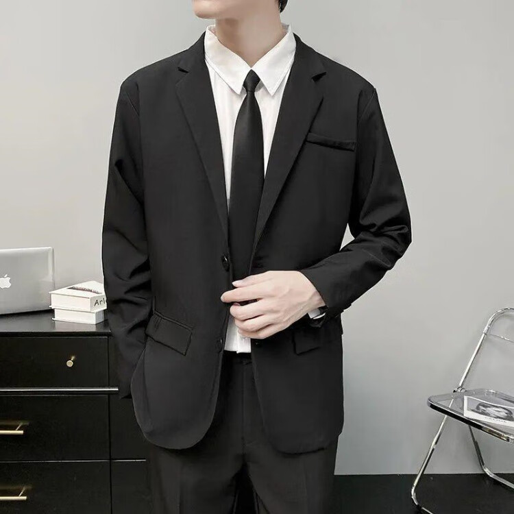 Luo Meng suit set, a complete set of new wedding performance, Korean version, casual commuting, college student interview, professional formal suit, black suit + trousers + white shirt + tie (four-piece set) M