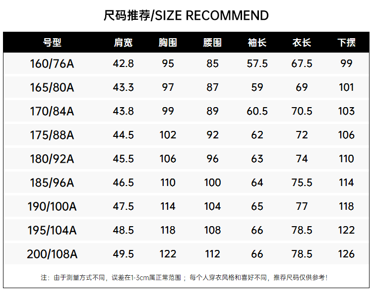 China (cm) 160-165/84-86 165-170 / 88-90 167-172 / 92-96 168-173 / 98-102 170-176 / 106-110