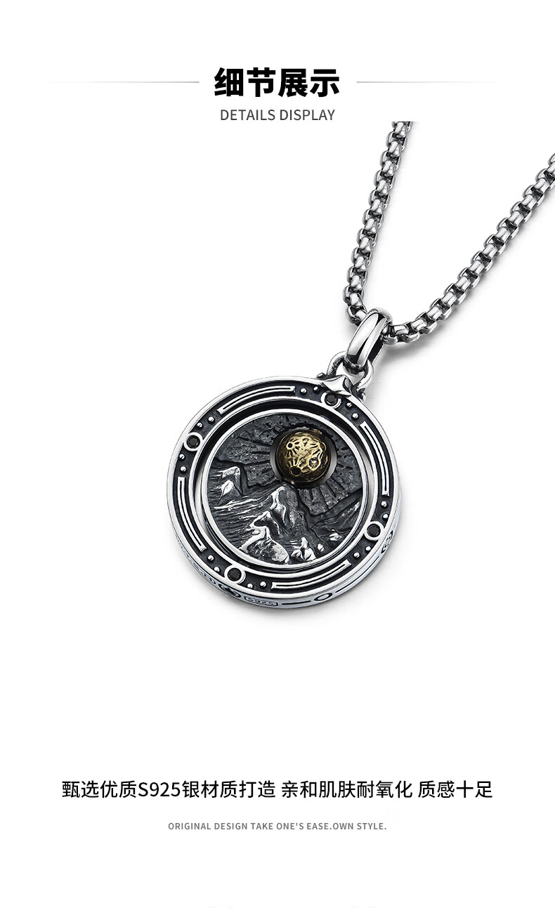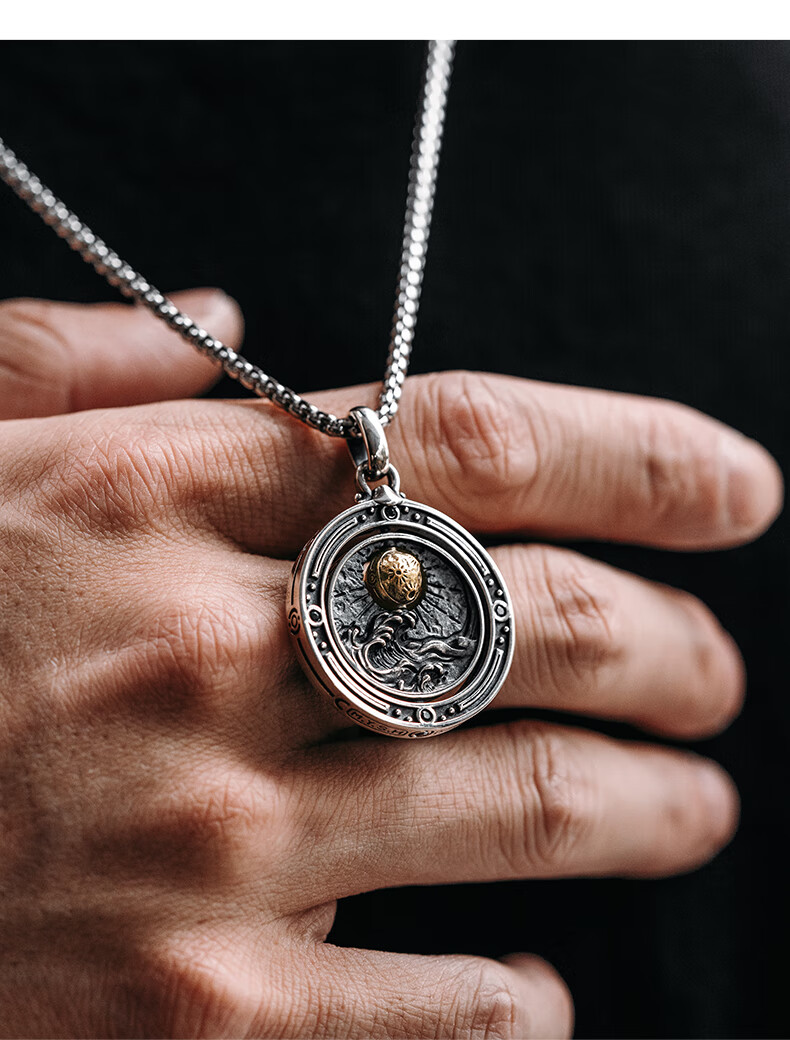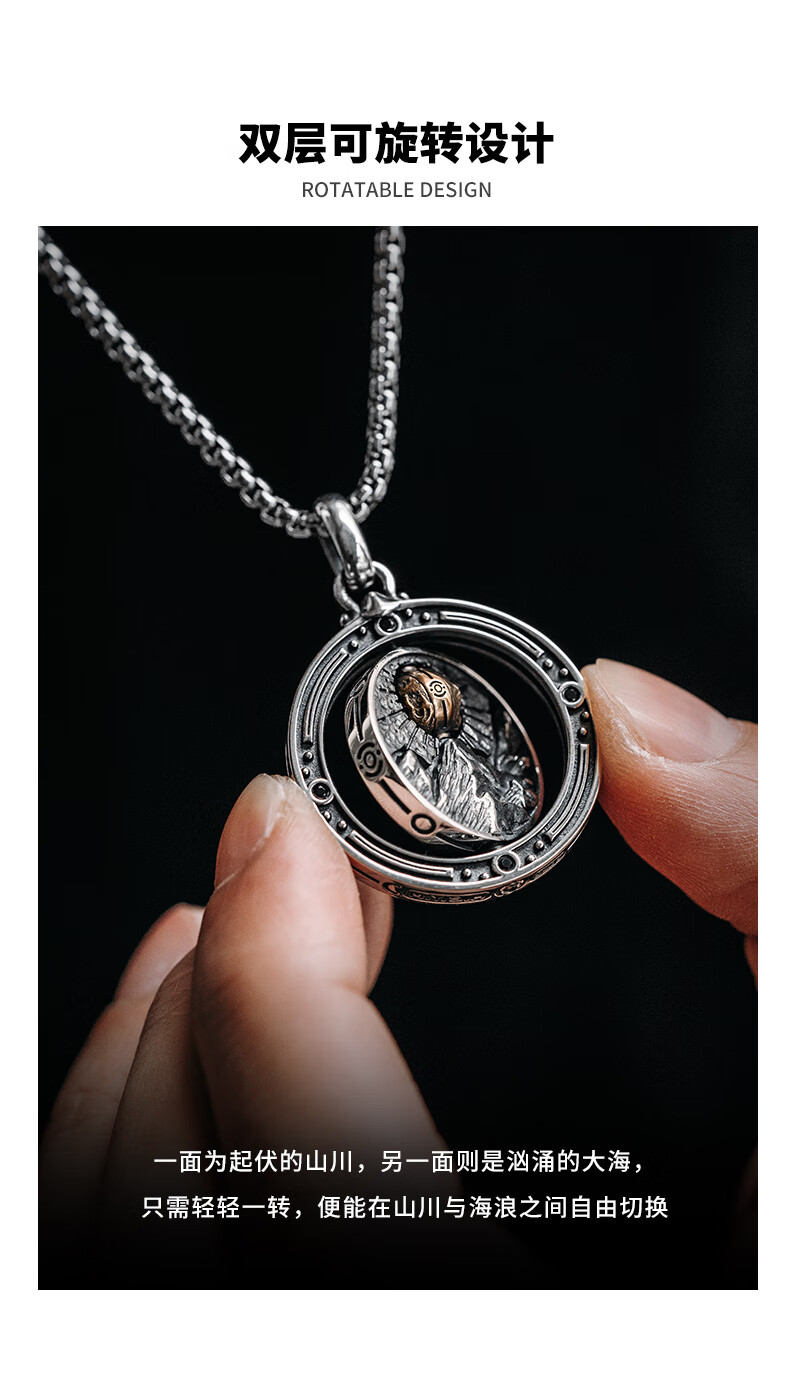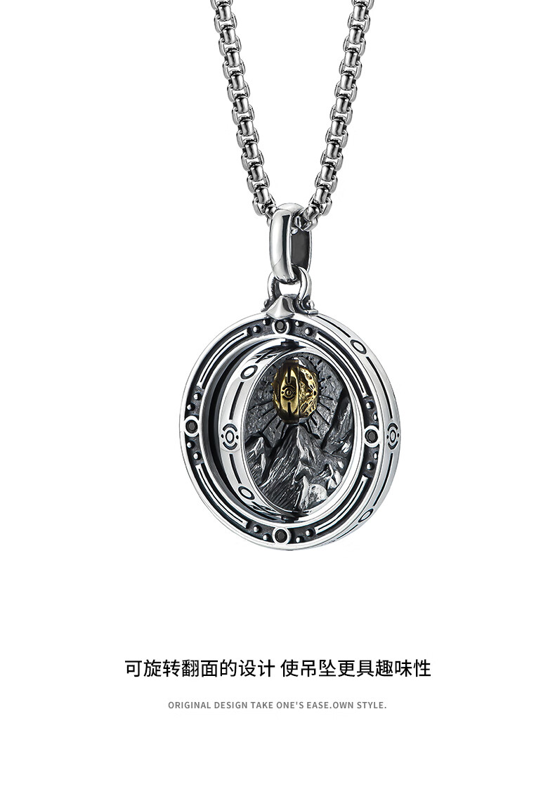 Mingyang Decoration Sea Rotatable 925 Silver Eachother Double-sided Ring Necklace Men's Trendy Accessories Original Personalized Pendant Eachother Pendant + Square Bead Silver Chain 70cm