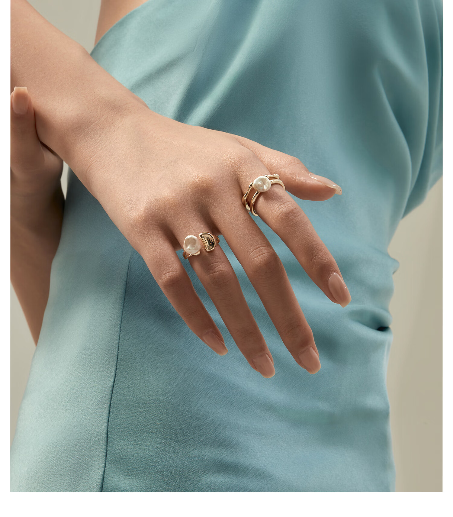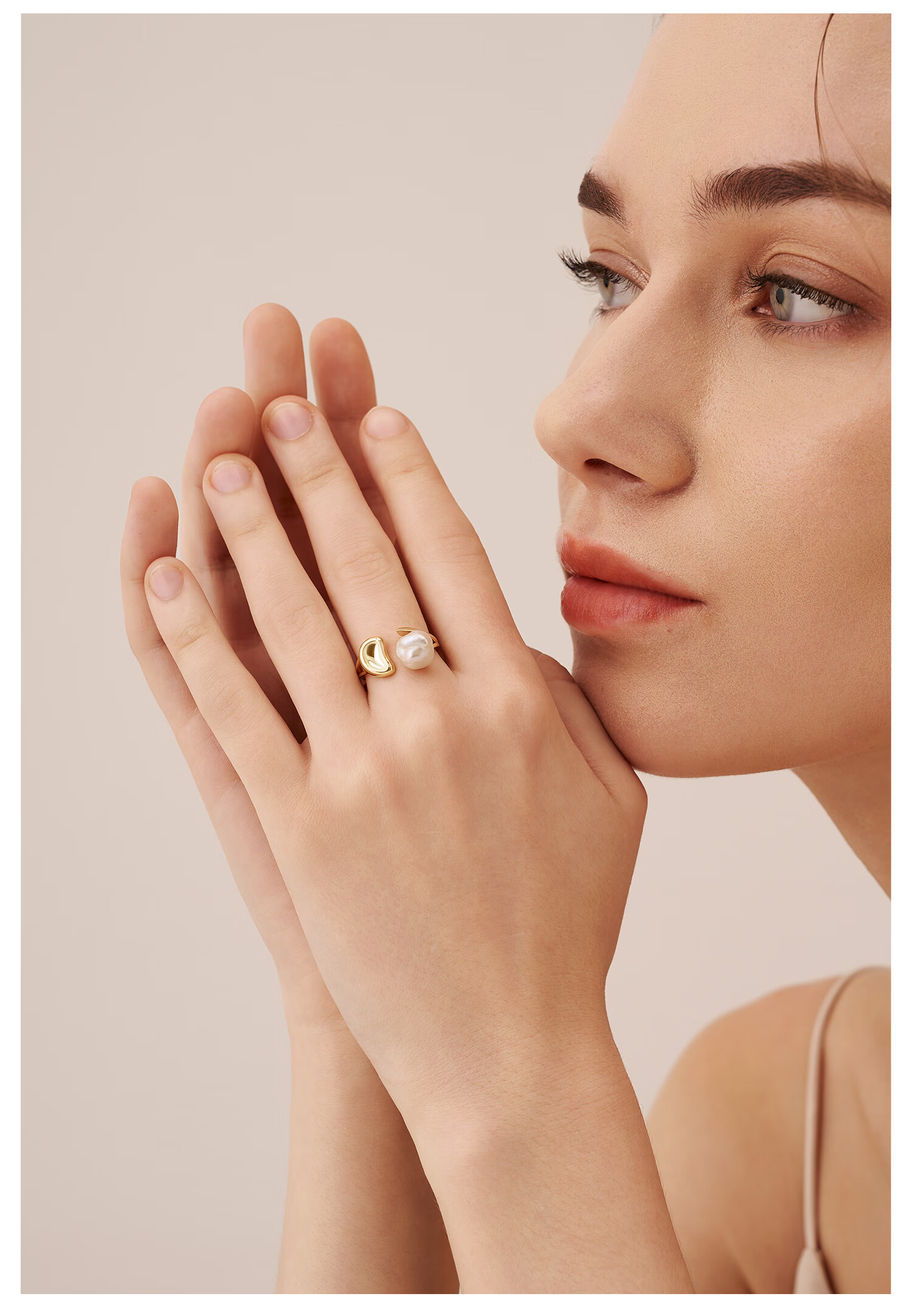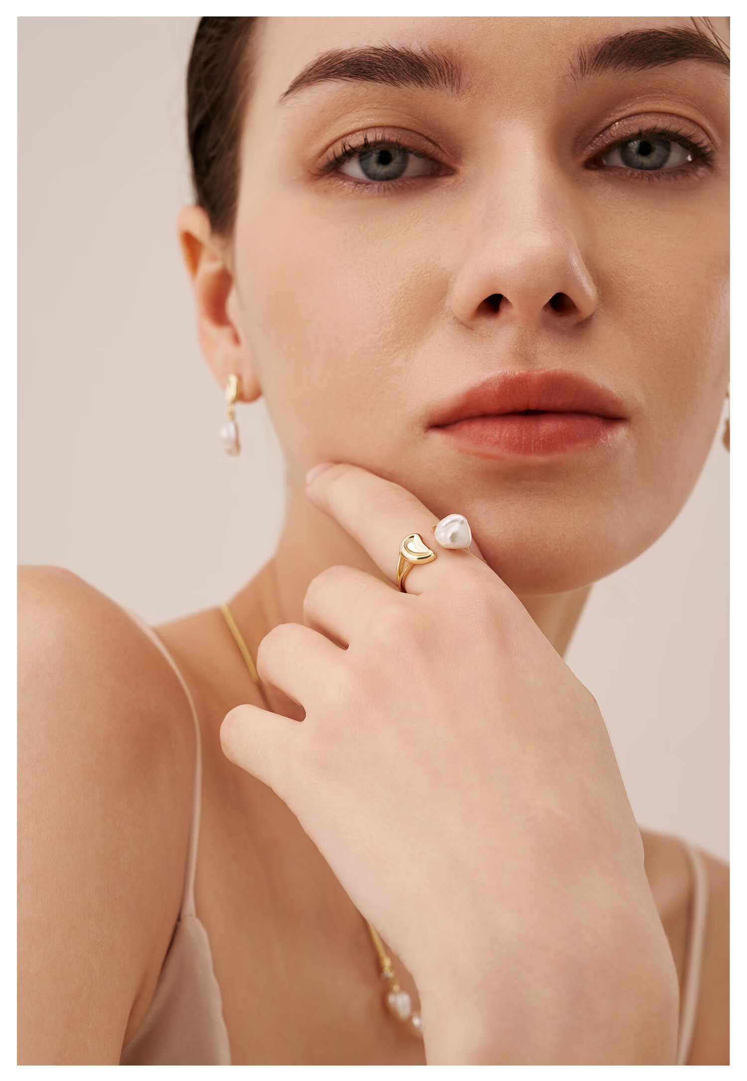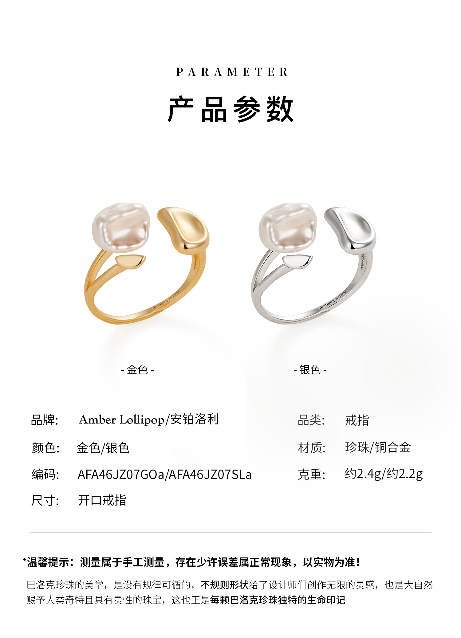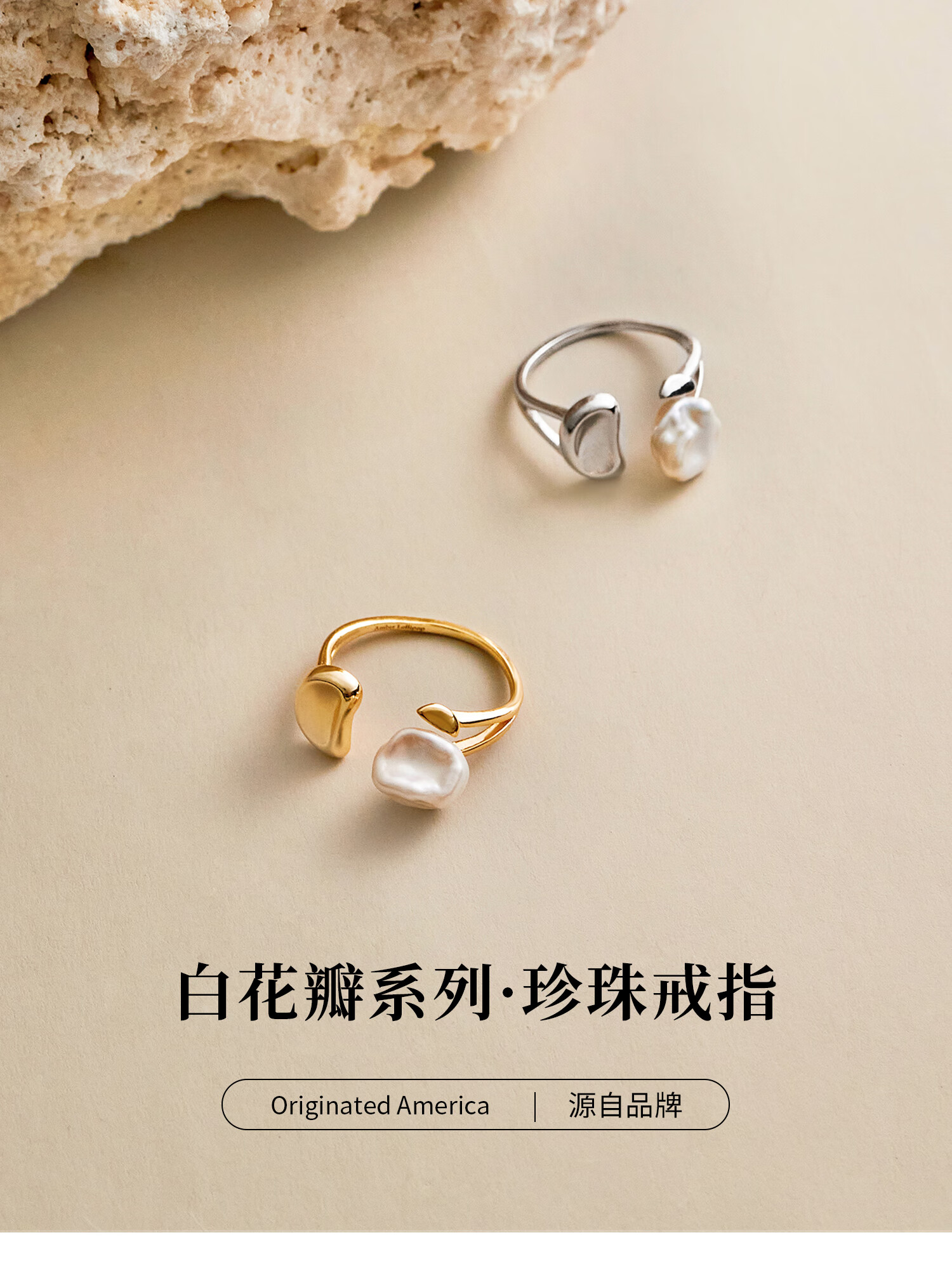 Amber Lollipop Baroque Pearl Ring Women's Niche Open Index Finger Ring Anniversary Birthday Gift for Girlfriend and Wife Gold-White Petals