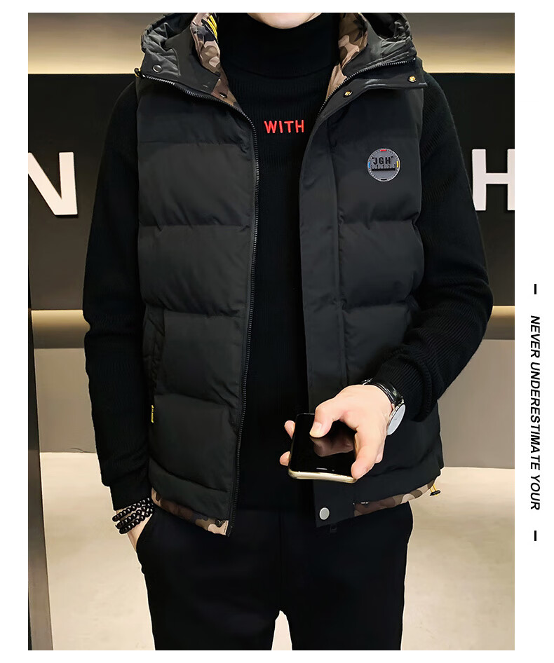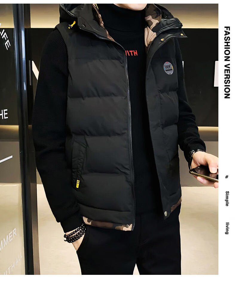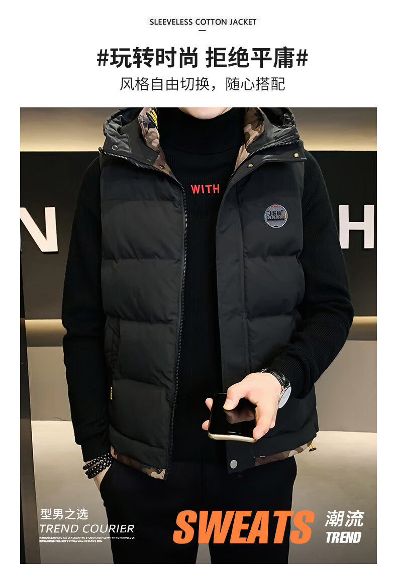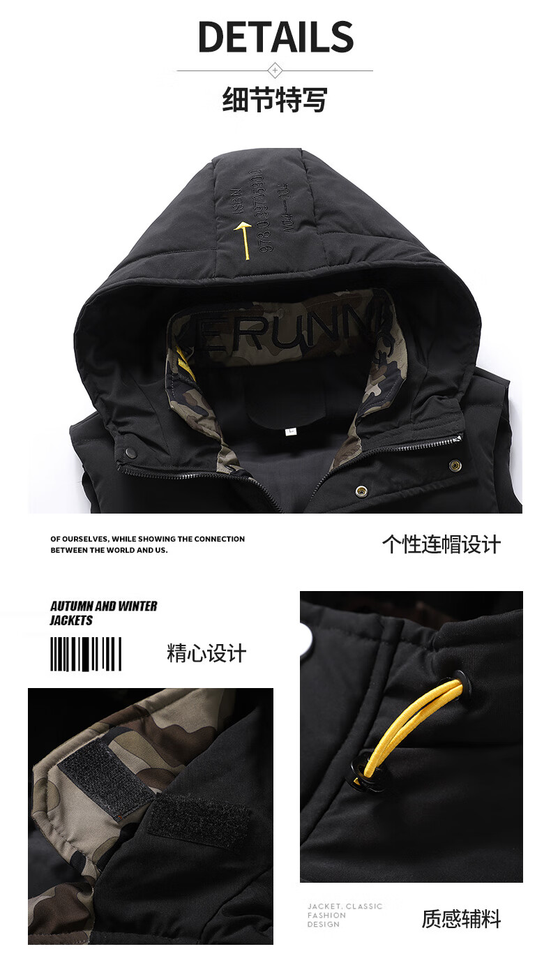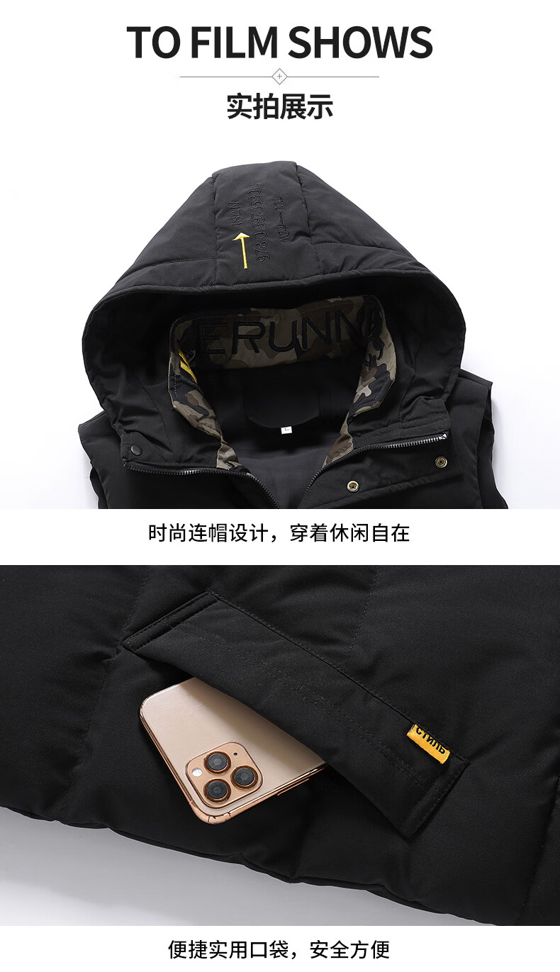 Scarecrow down cotton vest men's autumn and winter new warm jacket plus velvet thickened cotton coat outer sleeveless waistcoat vest 1906 black 2XL