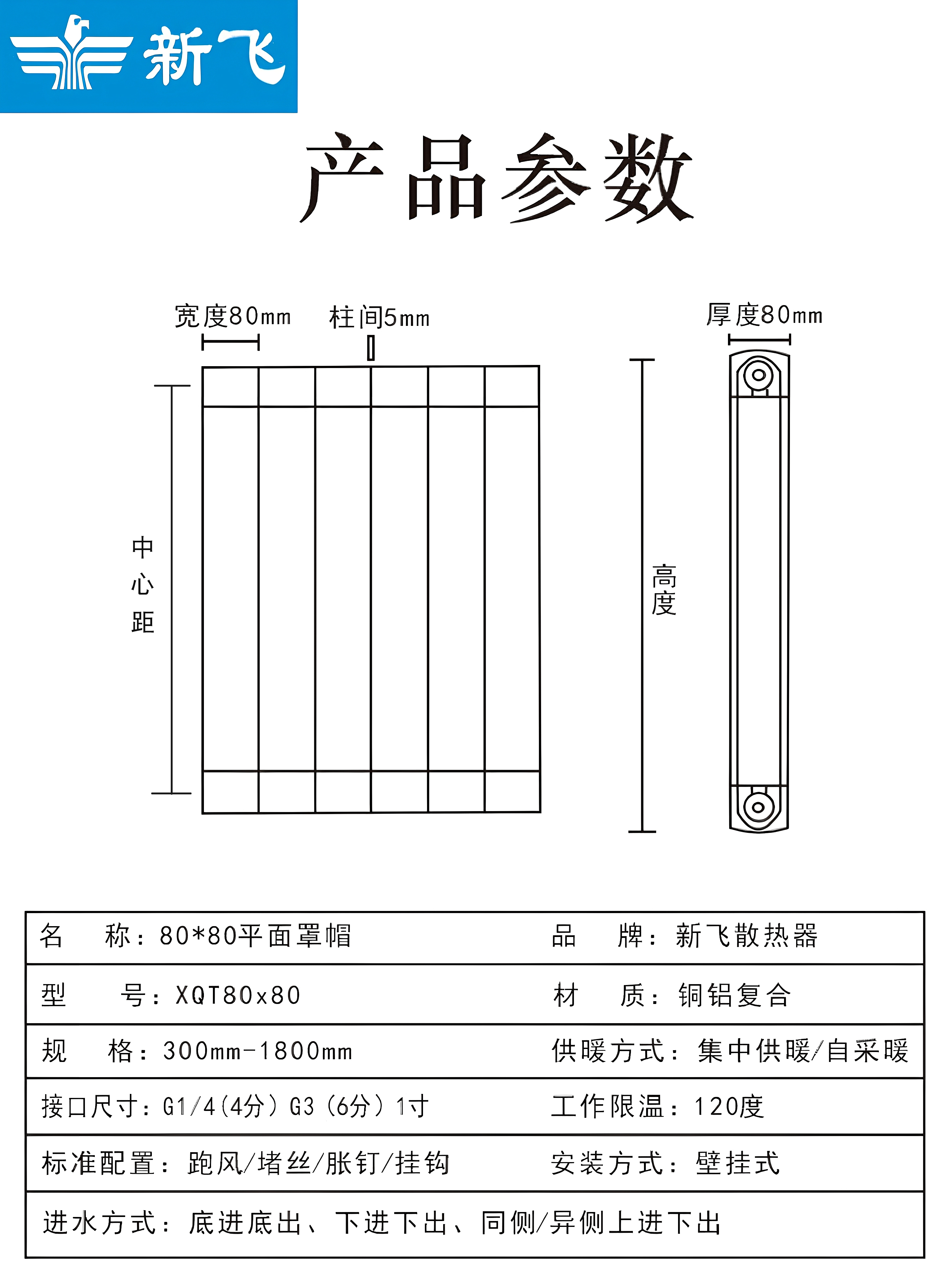 New flying copper-aluminum composite radiator household water heating floor heating wall-mounted living room bedroom air energy 80 pure flat water channel center distance 60mm