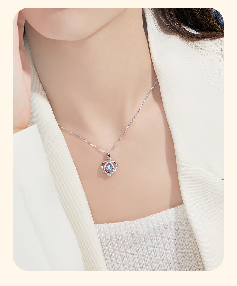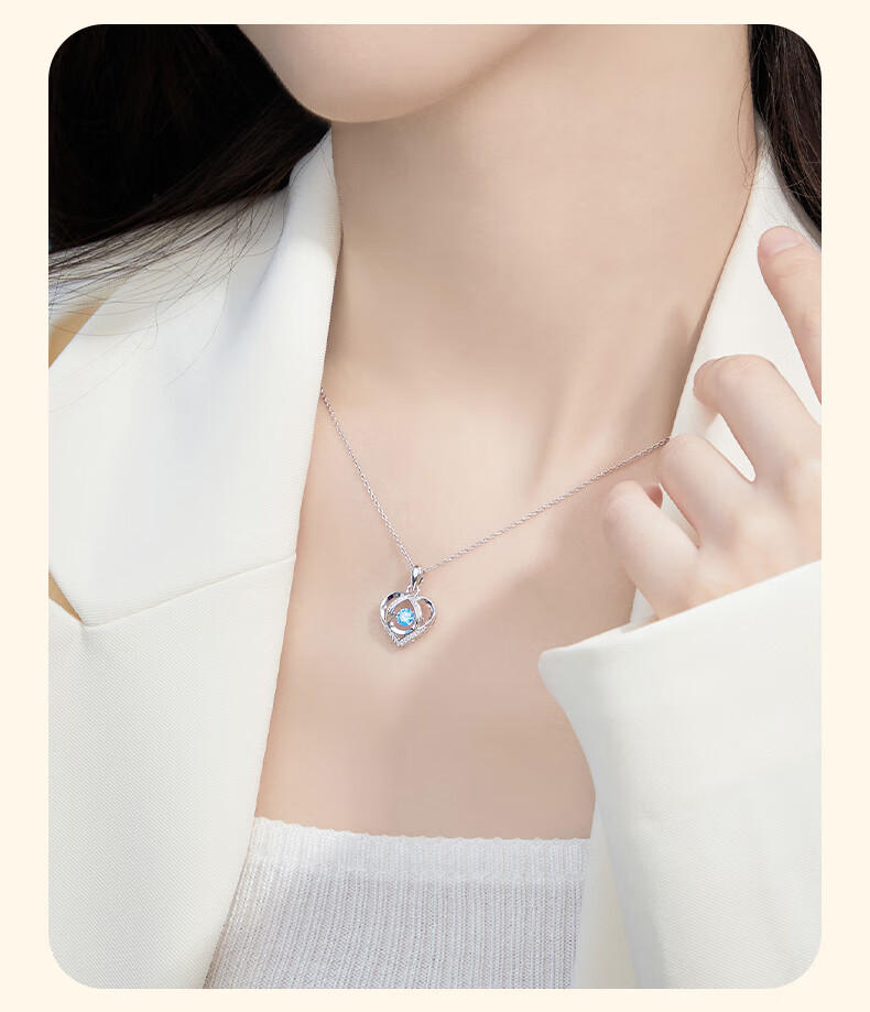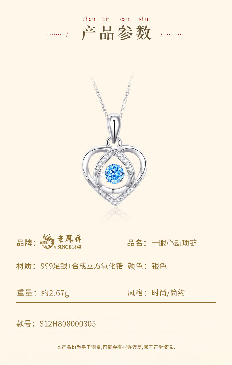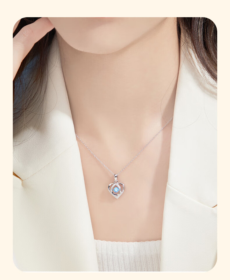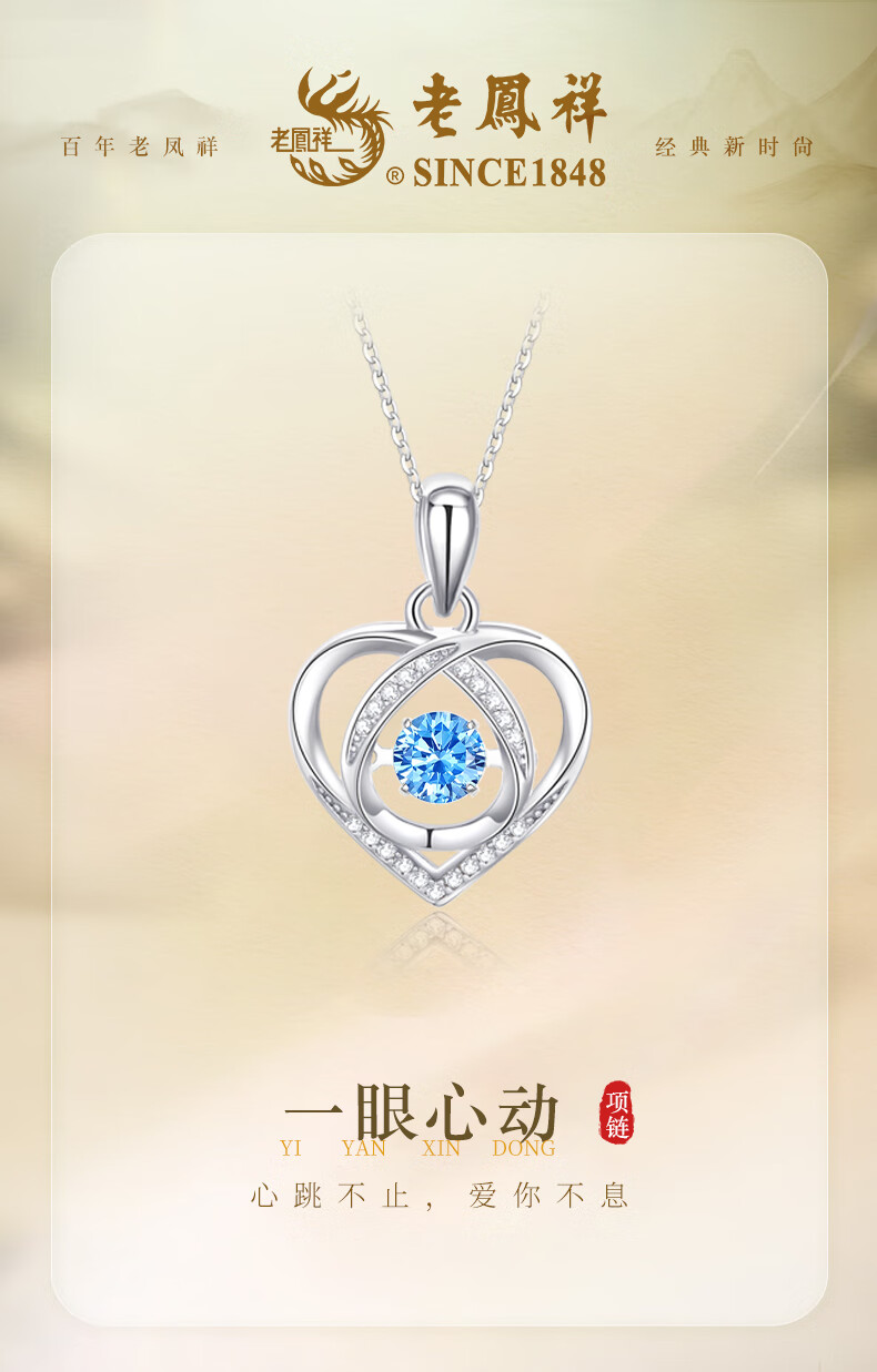 Lao Fengxiang pure silver necklace for women, light luxury beating heart pendant jewelry, high-end birthday anniversary gift for girlfriend and wife, white and blue* necklace, shipped from local warehouse nearby