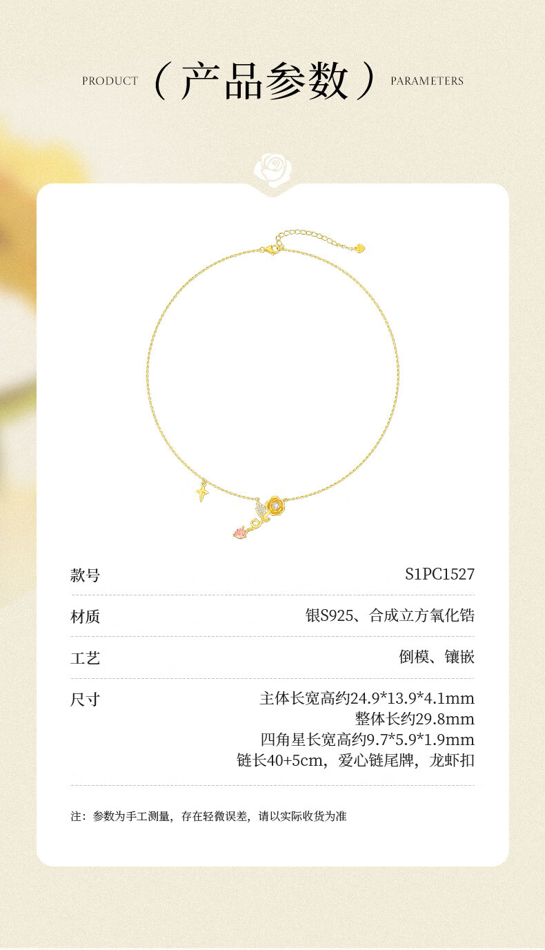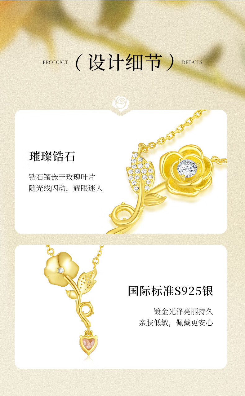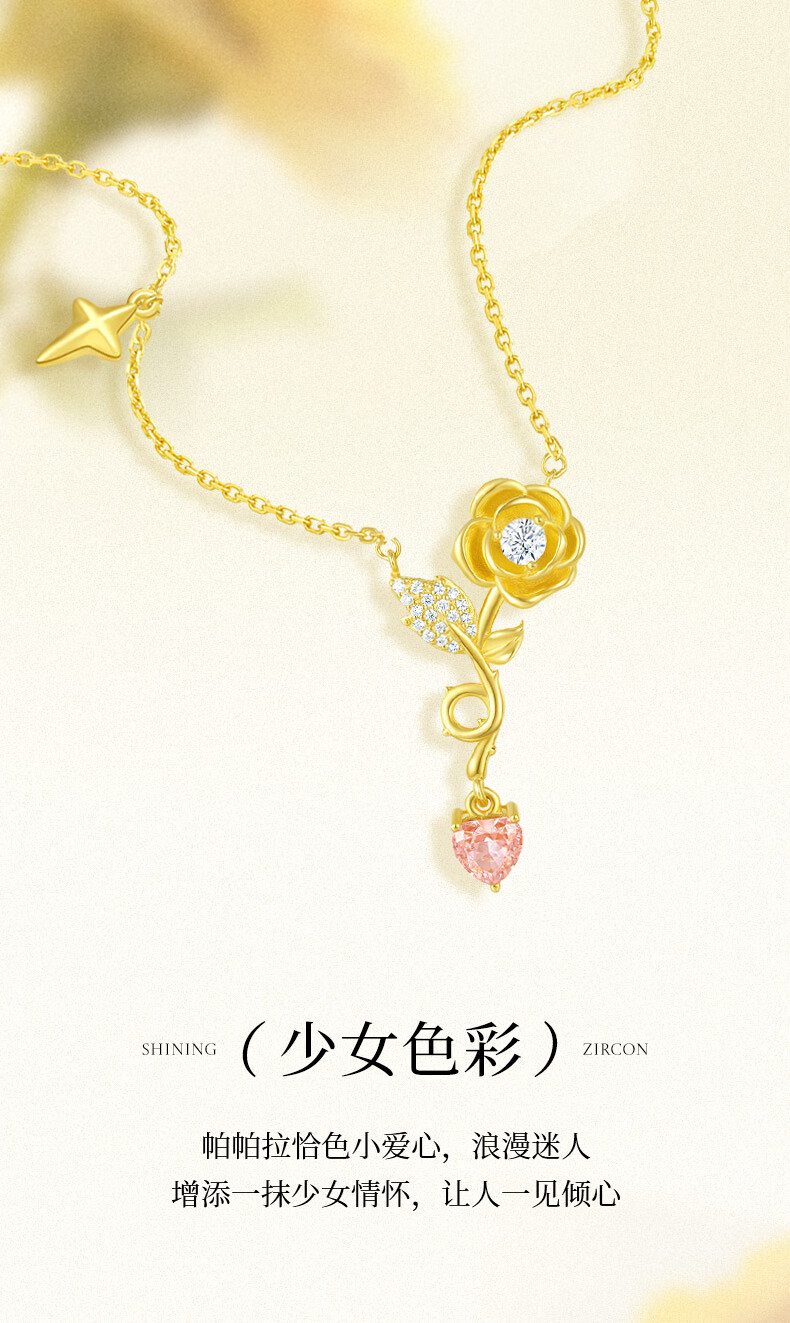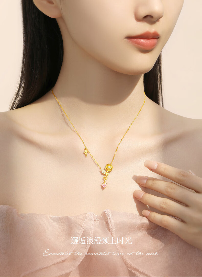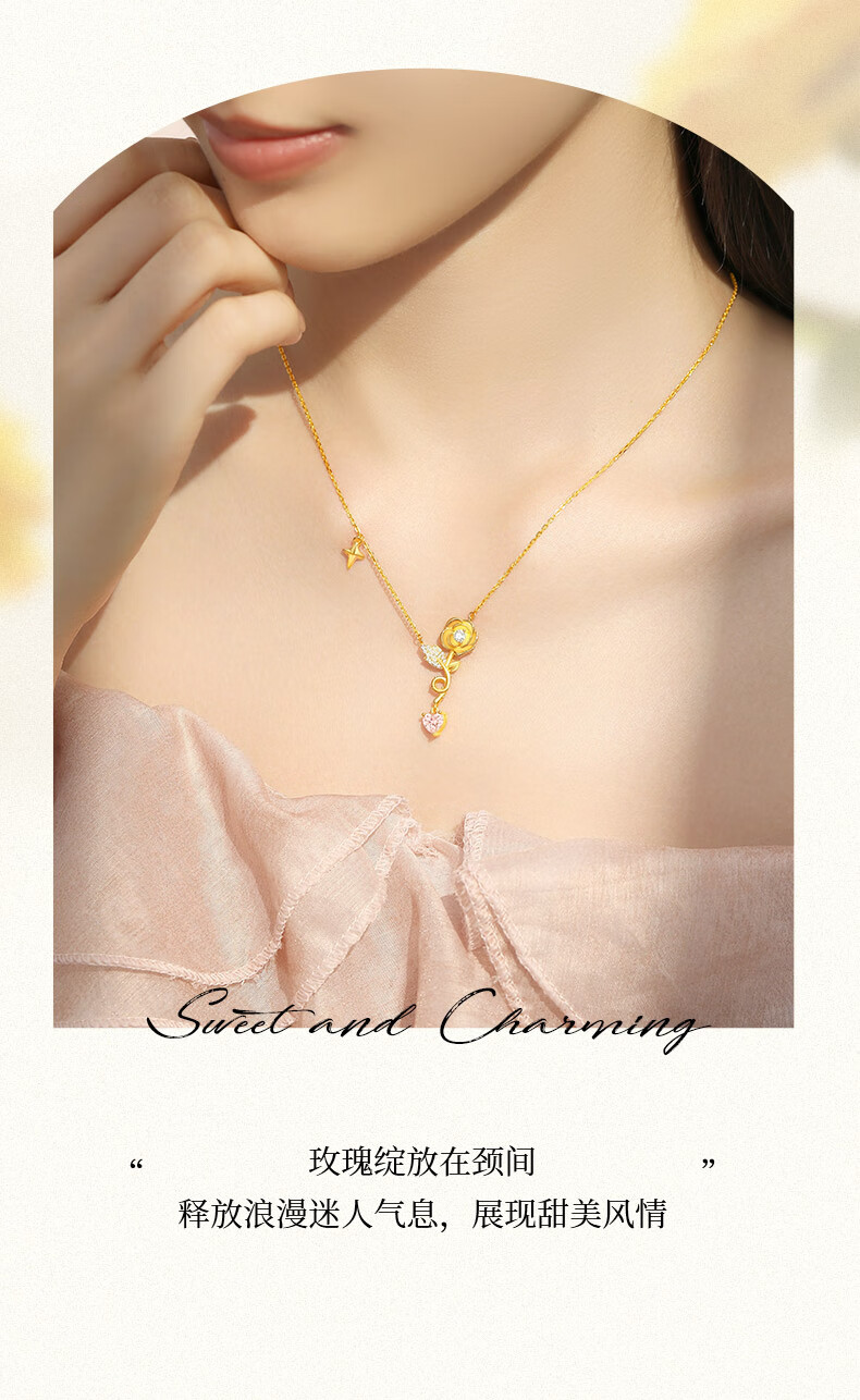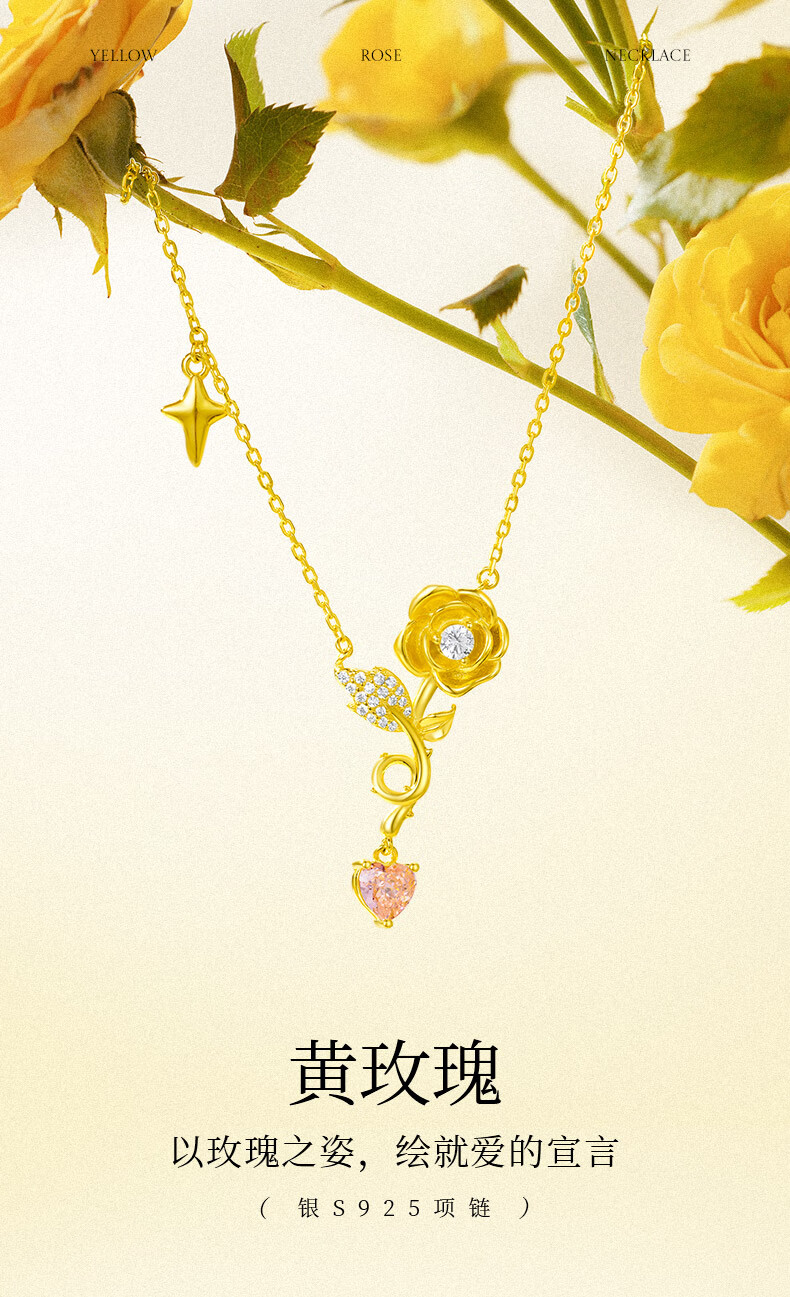 Chow Tai Sang Yellow Rose S925 Necklace Pure Silver Clavicle Chain New High-end Jewelry Birthday Gift for Girls Yellow Rose Necklace