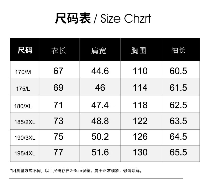 China (cm) 165 / 88-90 170 / 96-98 175 / 108-110 180 / 118-122 185 / 126-130