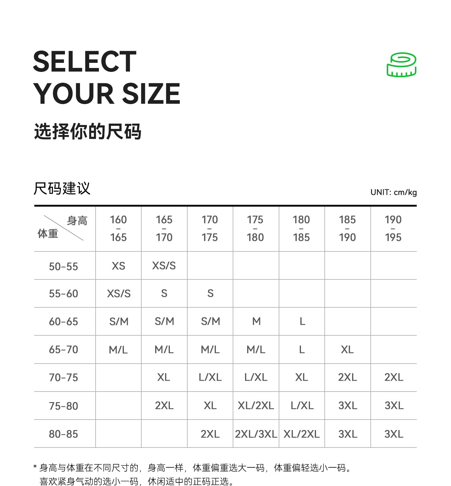 China (cm) 165 / 88-90 170 / 96-98 175 / 108-110 180 / 118-122 185 / 126-130