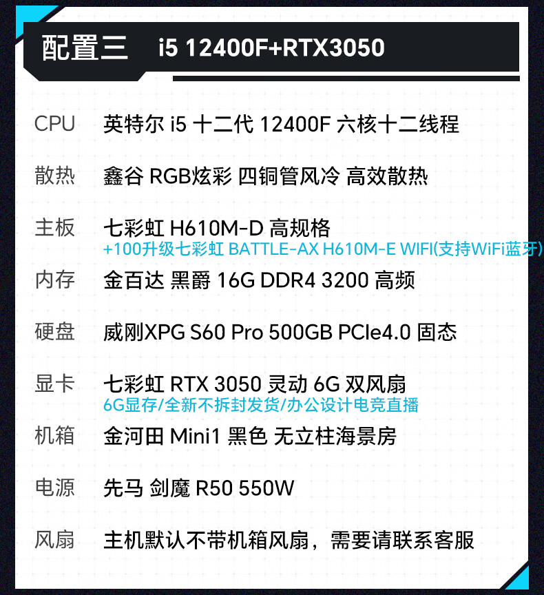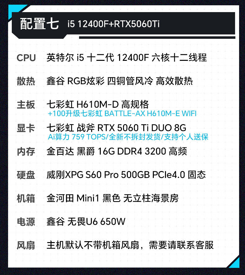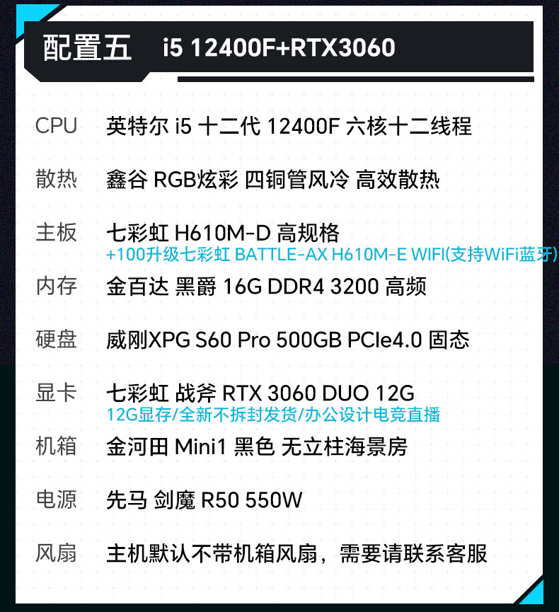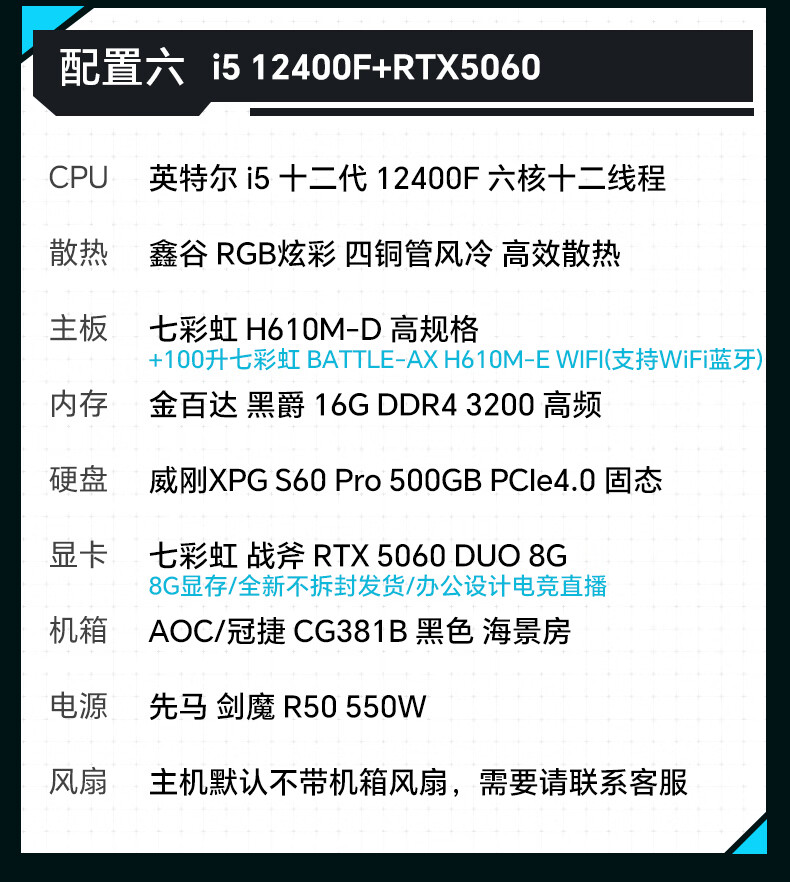 Colorful i5 12400F/RTX5060Ti/7650GRE/3060 e-sports game live broadcast Ai rendering desktop assembly computer host sea view room diy computer with five 12400F+RTX3060