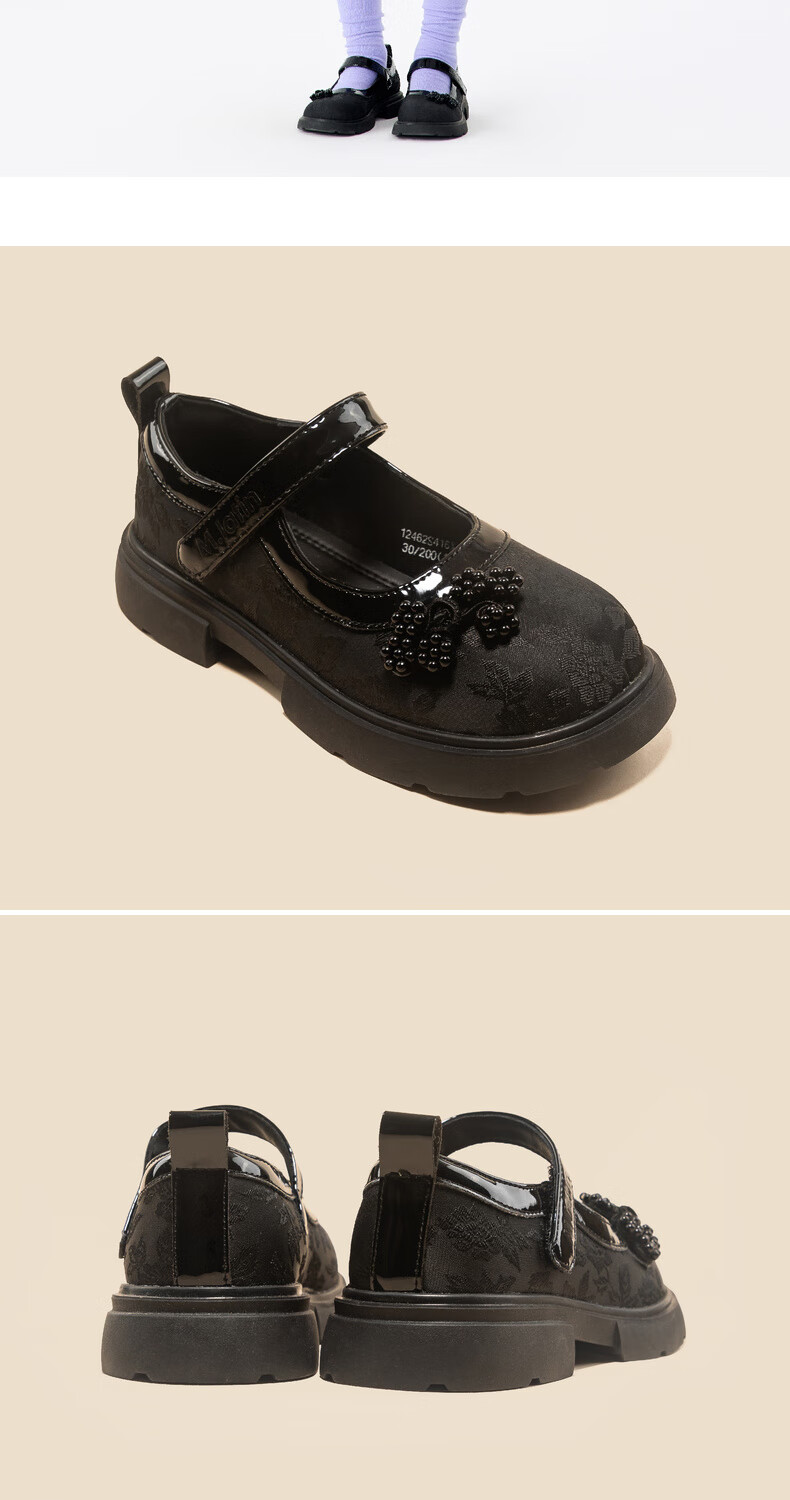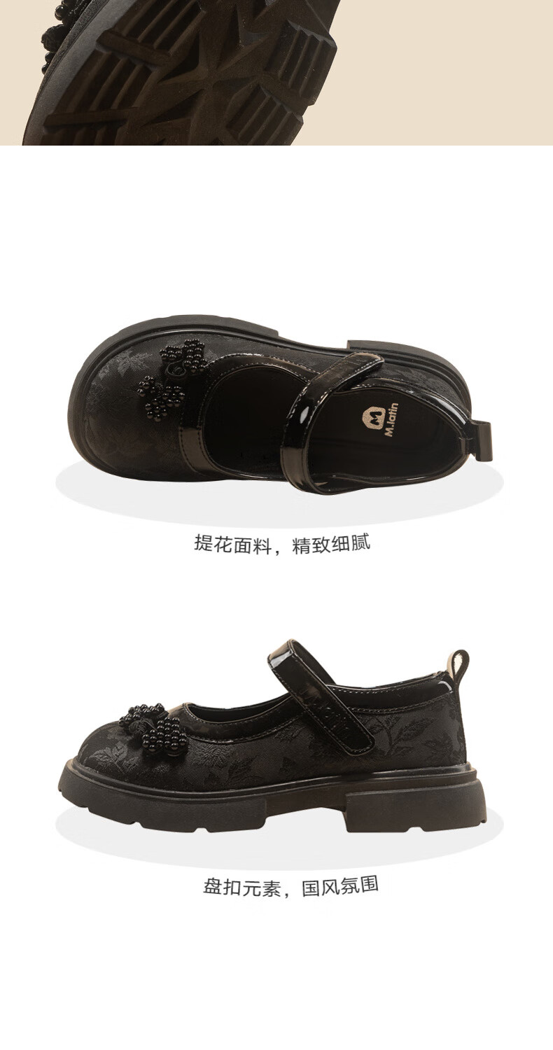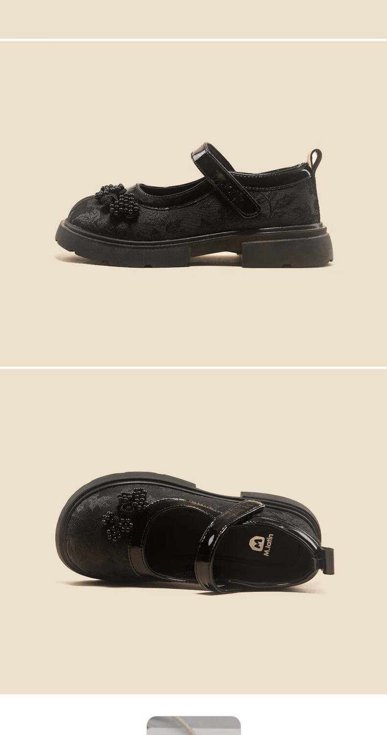 M.Latin/Rainbow's Poetry Series Maratin Children's Clothing Shoes Spring and Autumn New Style Girls' Dark Jacquard Pattern Small Leather Shoes Black Size 28