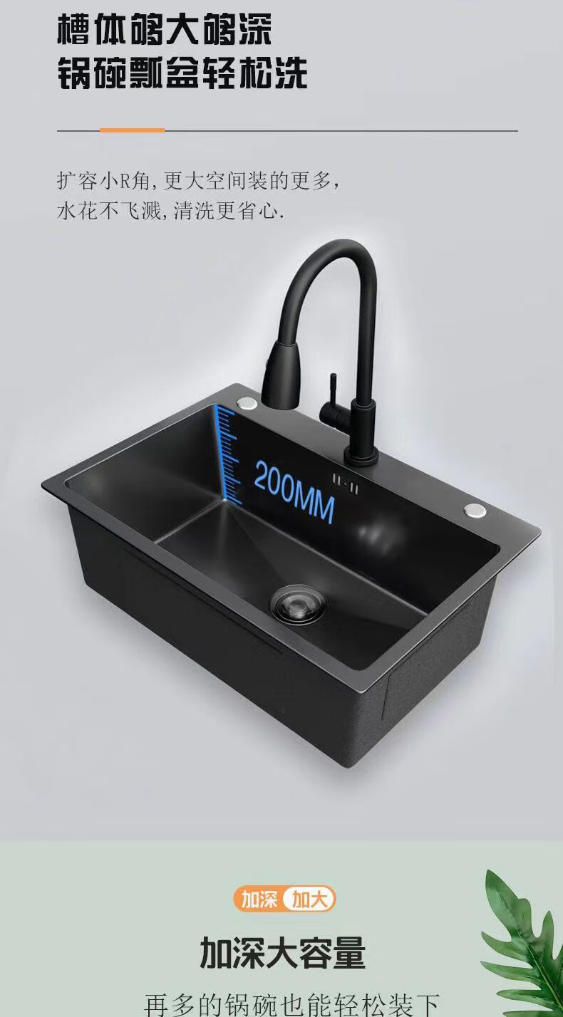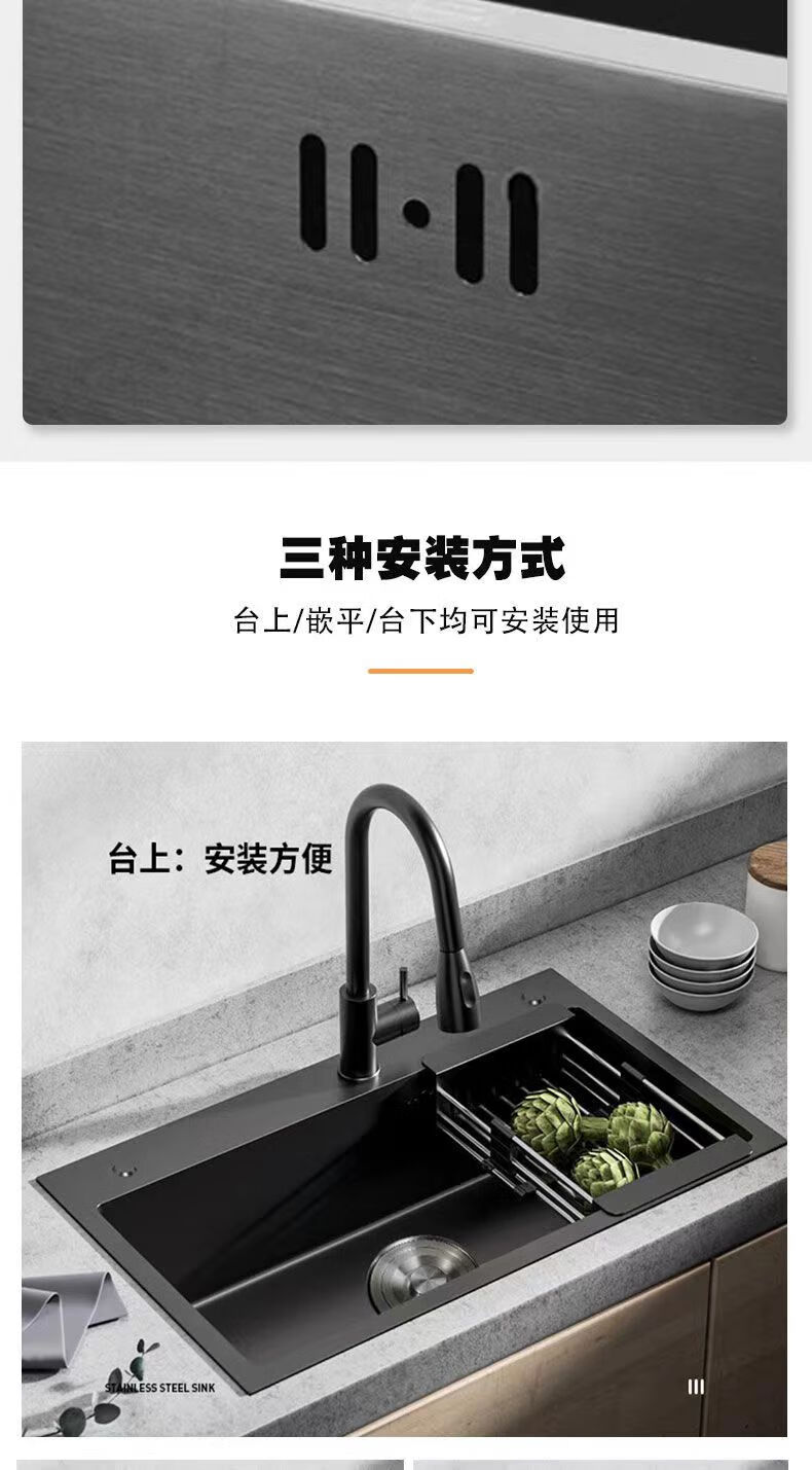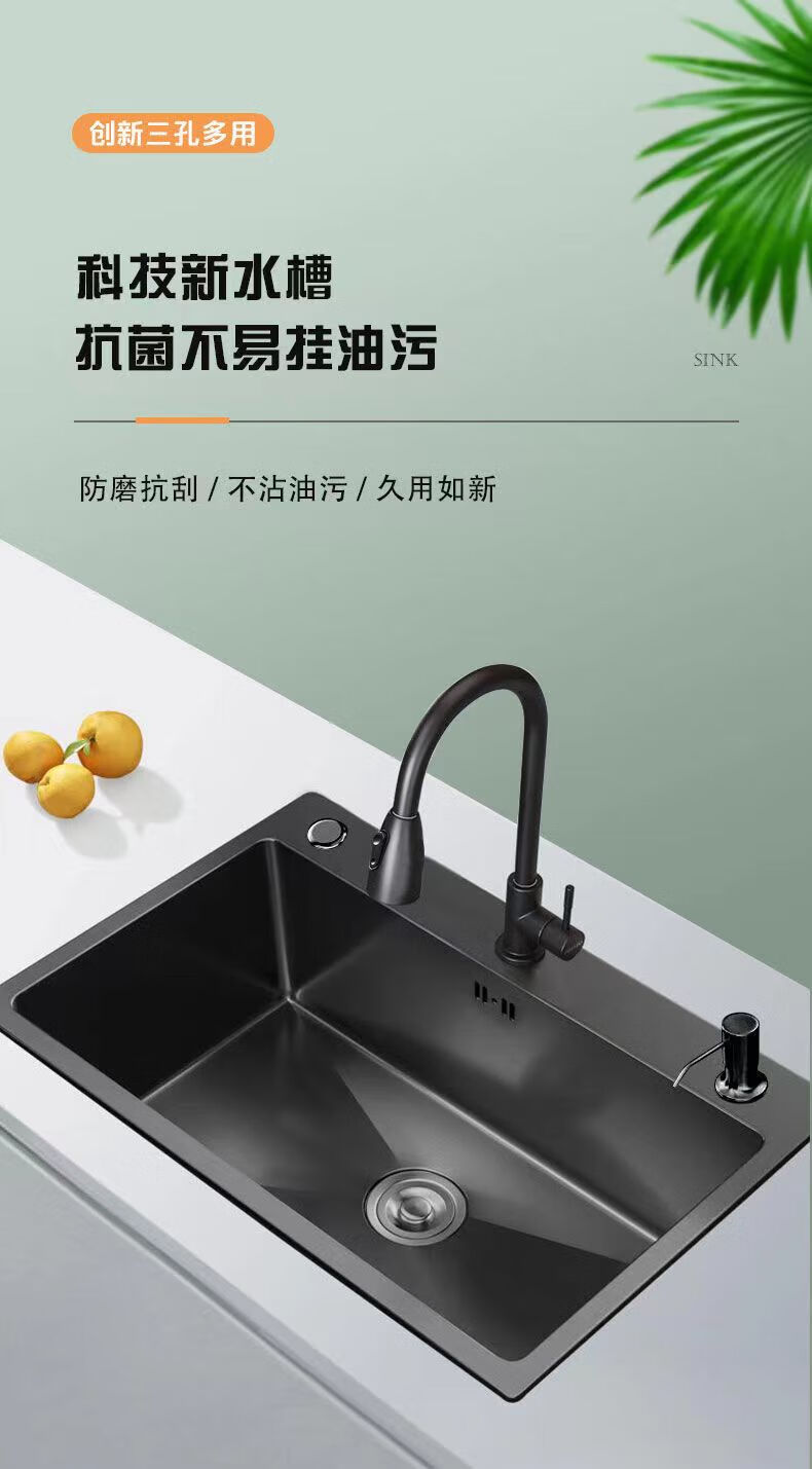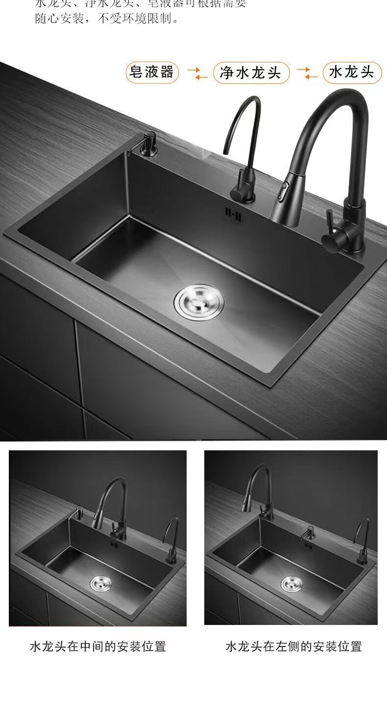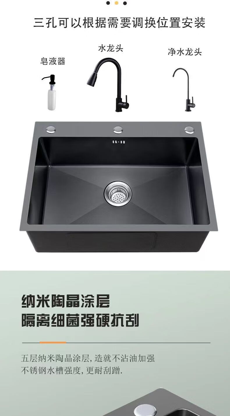 Jiumuwang thickened 304 stainless steel sink large single-slot wash basin home kitchen sink three-hole black nano three-hole basin black 65*45 pull-out faucet package