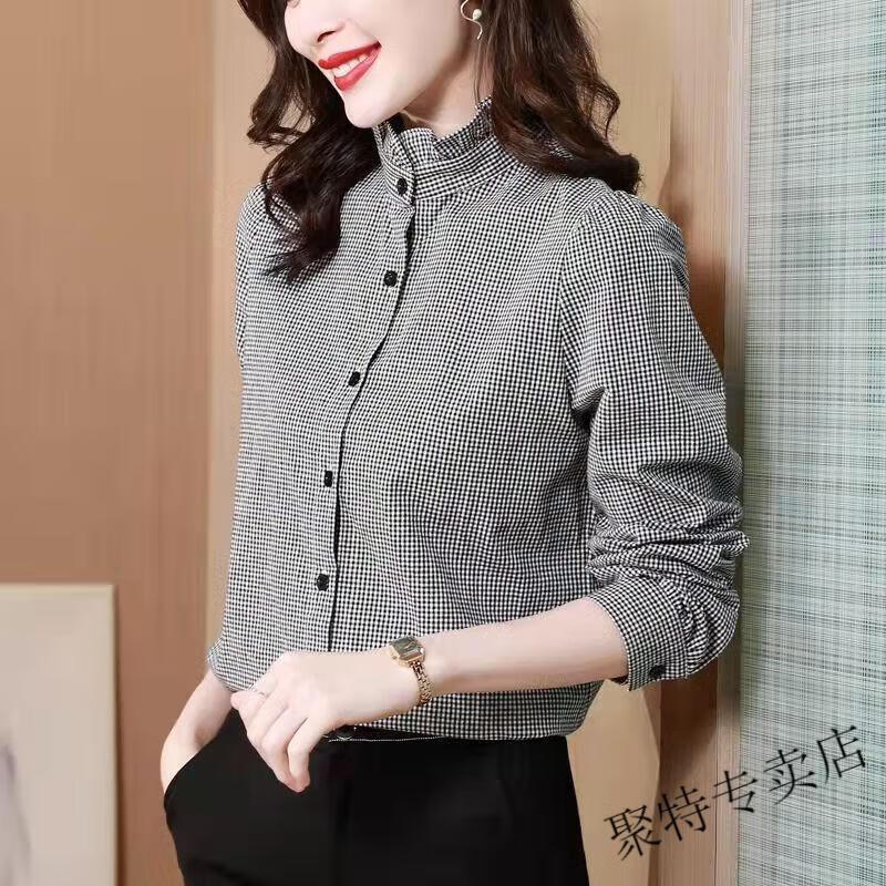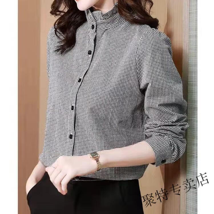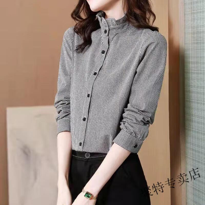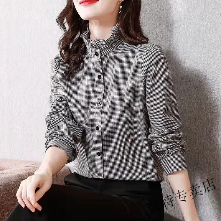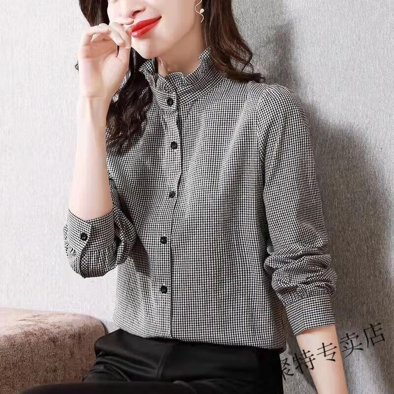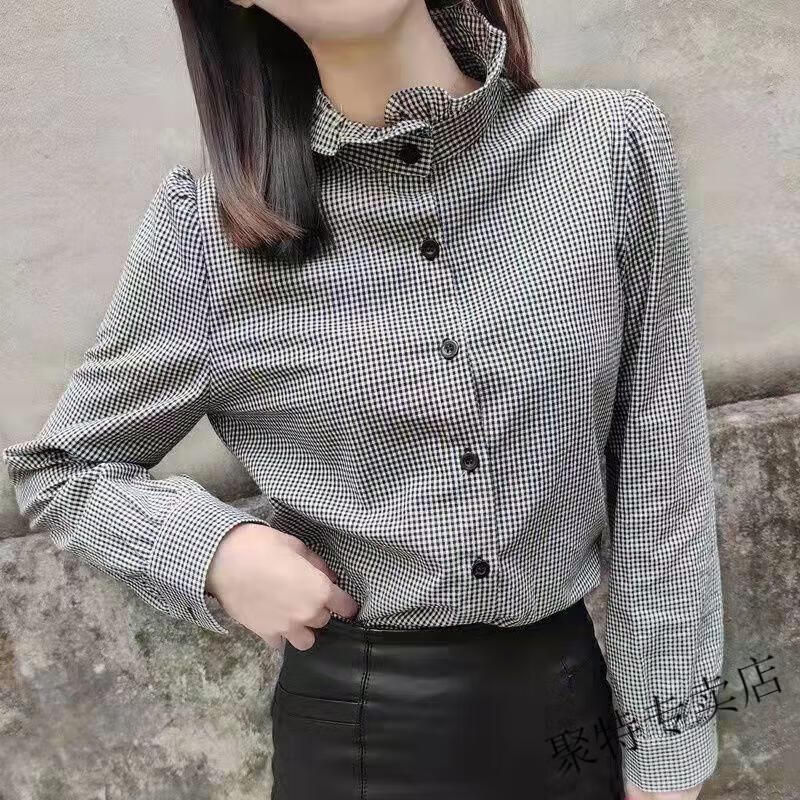 Pierre Cardin black and white plaid shirt women's long-sleeved stand-up collar fungus lace cardigan top Korean style spring and autumn loose bottoming versatile black and white plaid S 75-95Jin Jin equals 0.5 kg