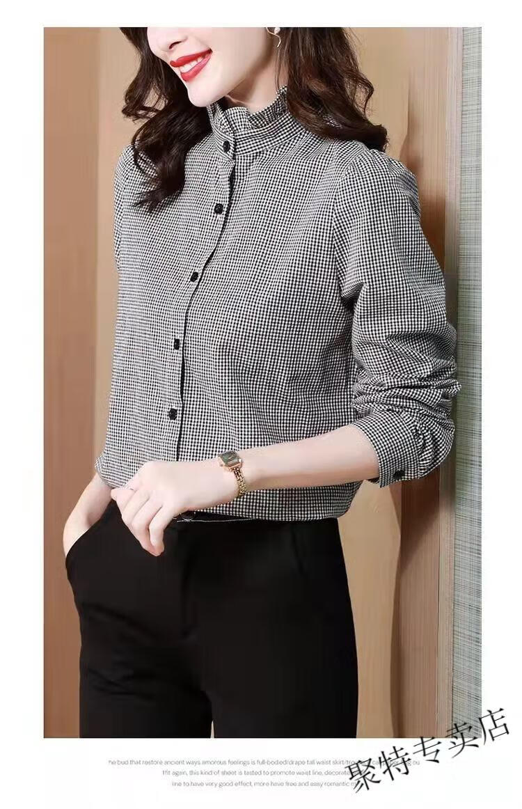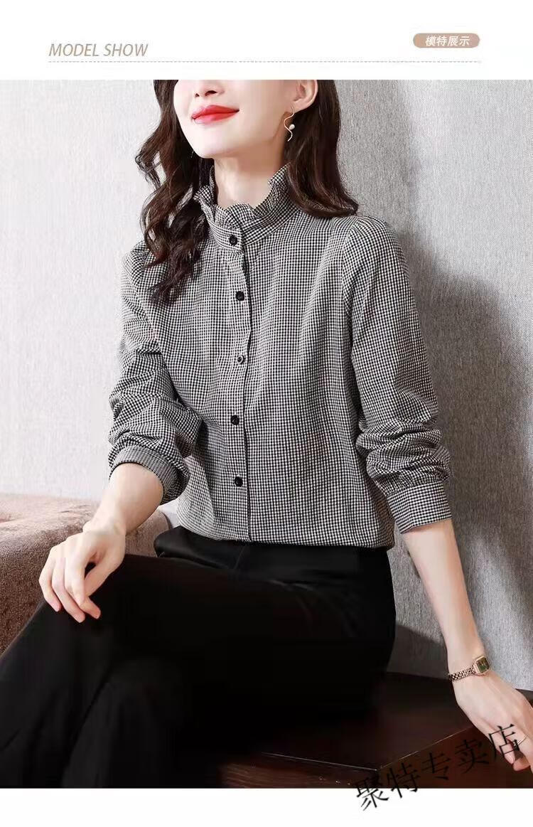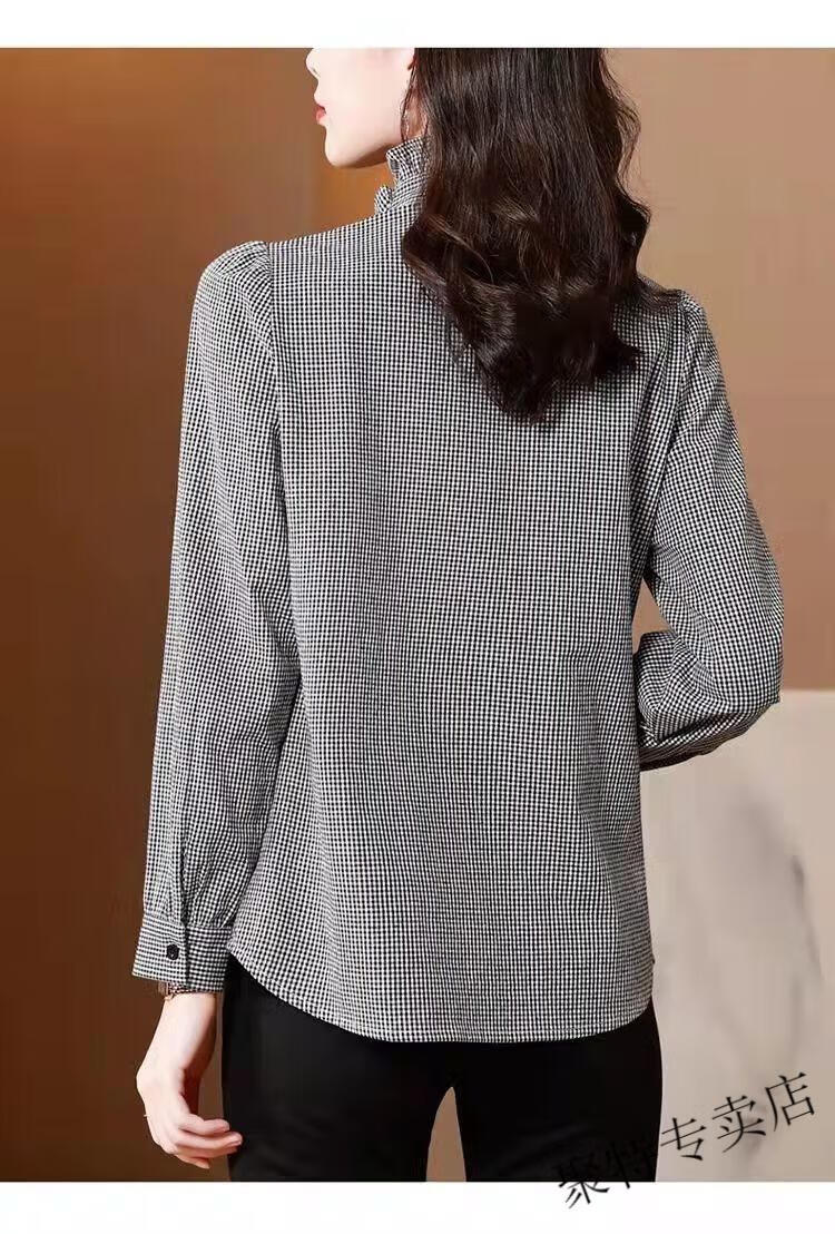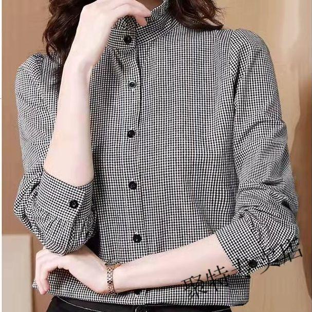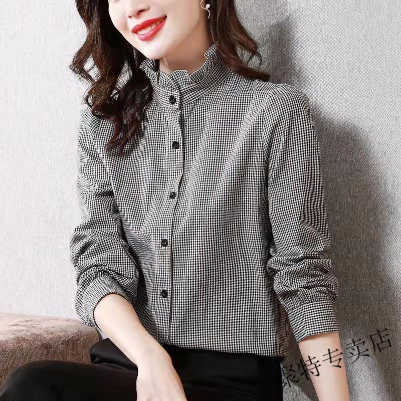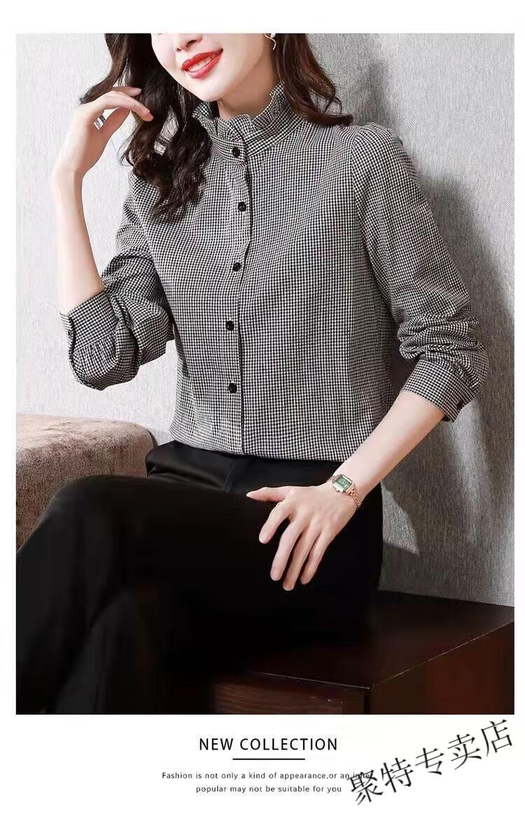 Pierre Cardin black and white plaid shirt women's long-sleeved stand-up collar fungus lace cardigan top Korean style spring and autumn loose bottoming versatile black and white plaid S 75-95Jin Jin equals 0.5 kg