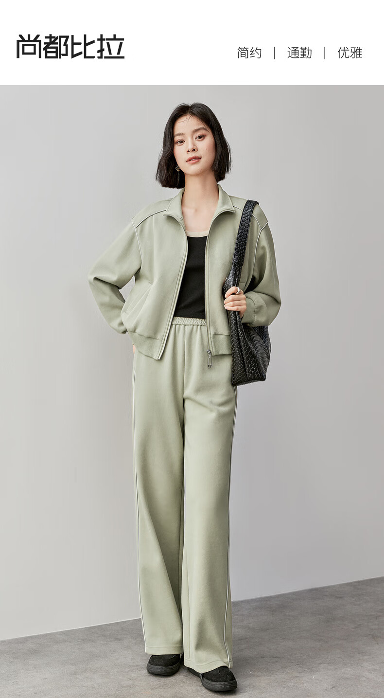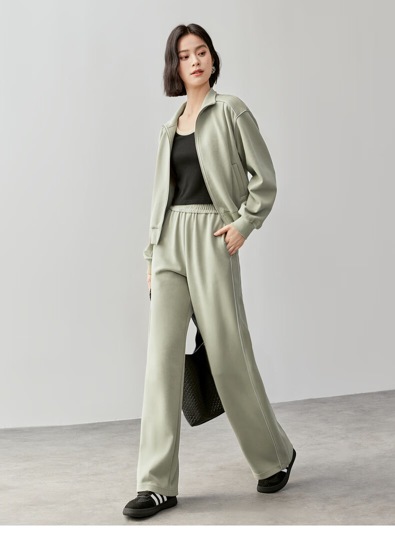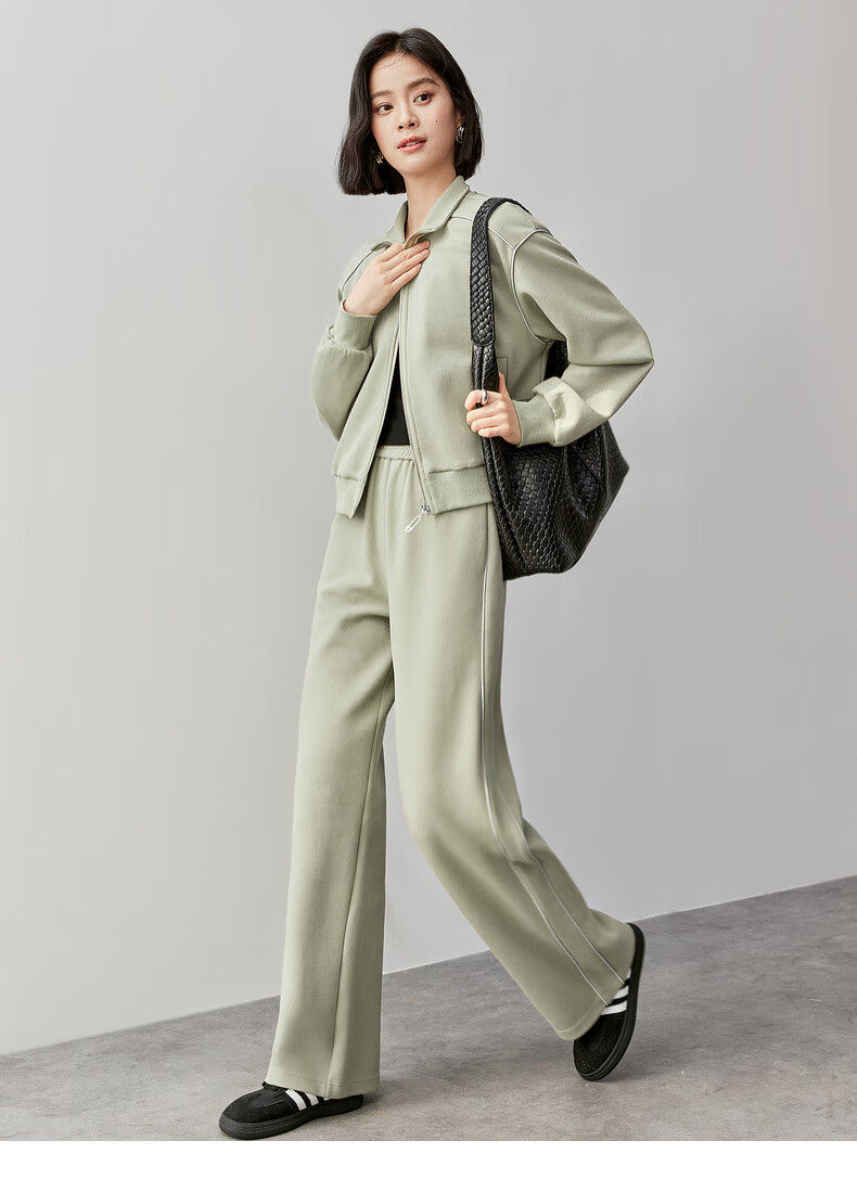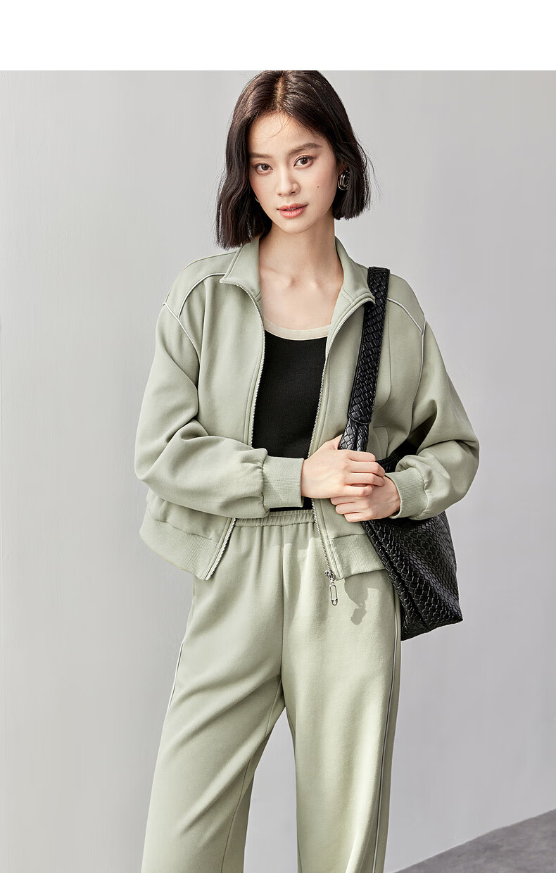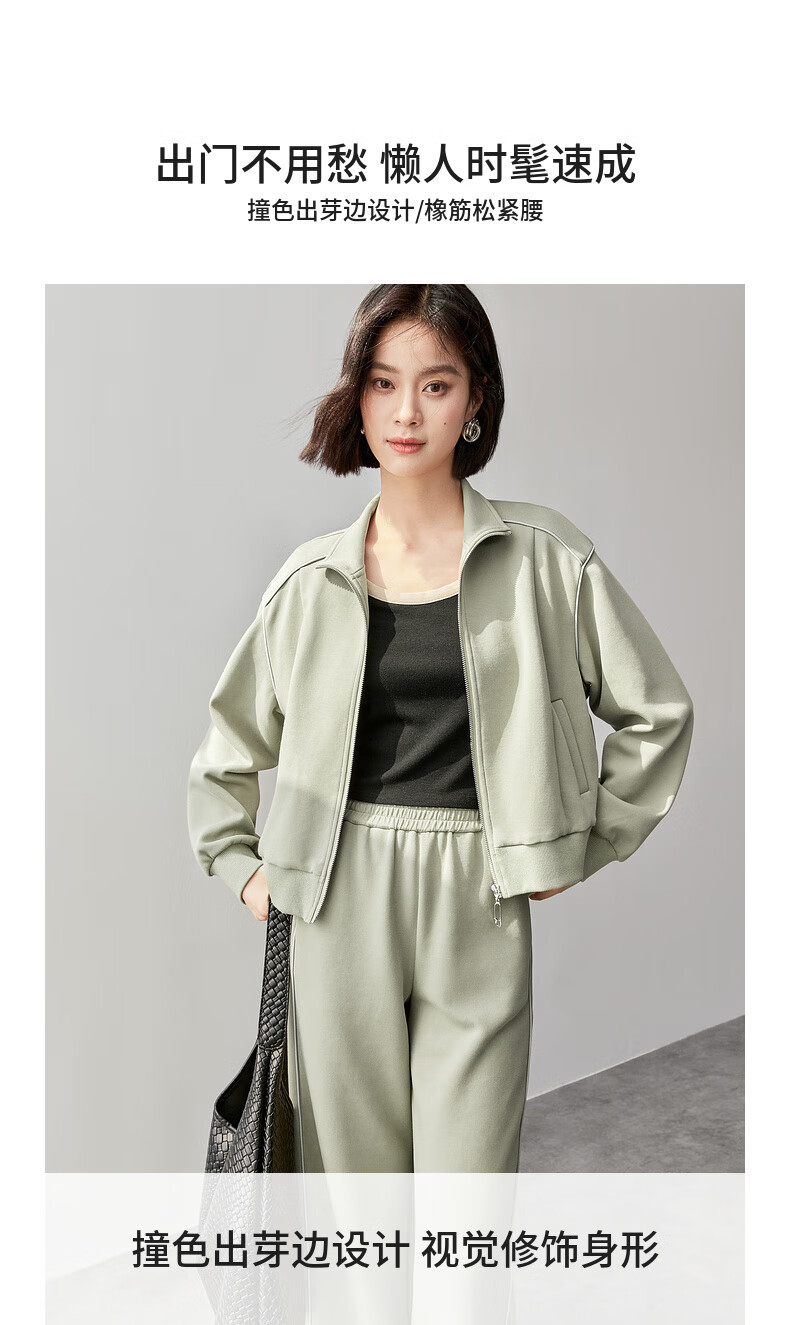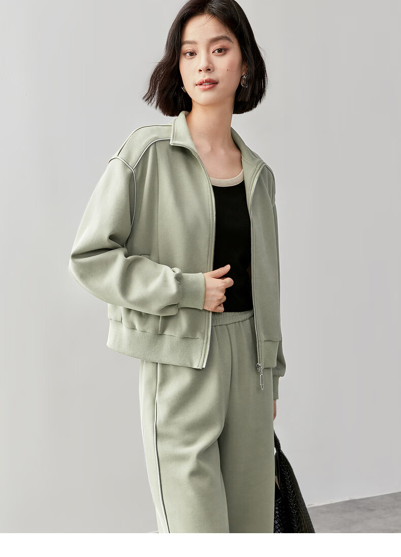 Shandubila Comfortable Casual Contrast Color Stand Collar Sweatshirt Spring and Autumn Short Straight Pants Knitted Cotton Suit Elm Green L
