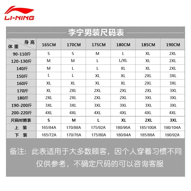China (cm) 165 / 88-90 170 / 96-98 175 / 108-110 180 / 118-122 185 / 126-130
