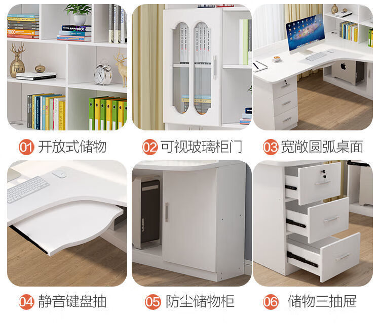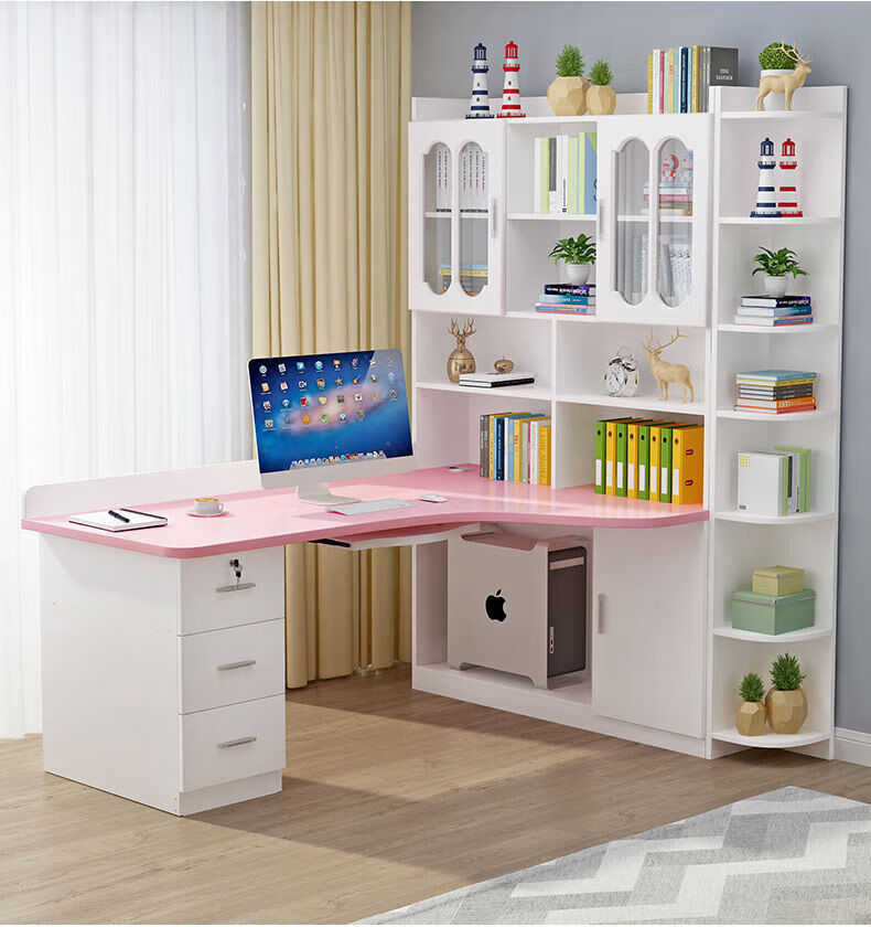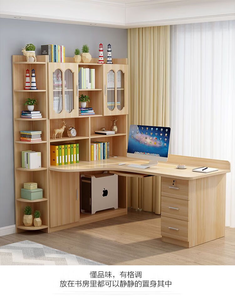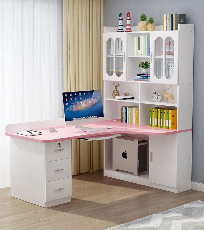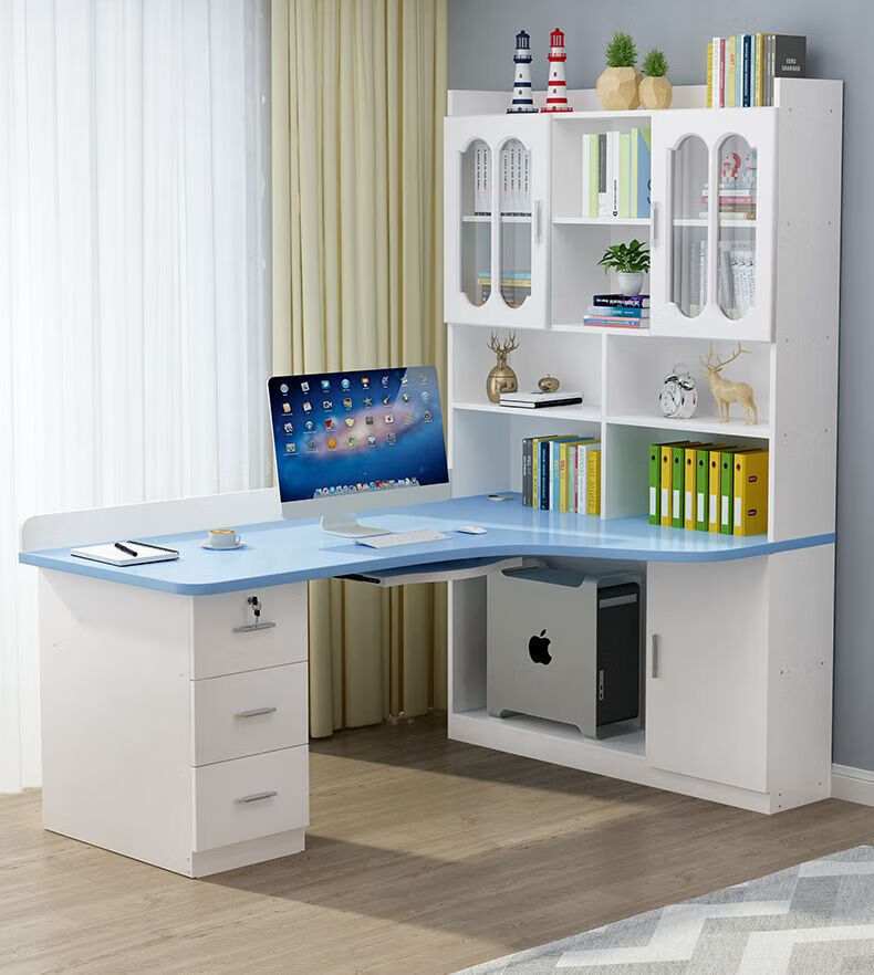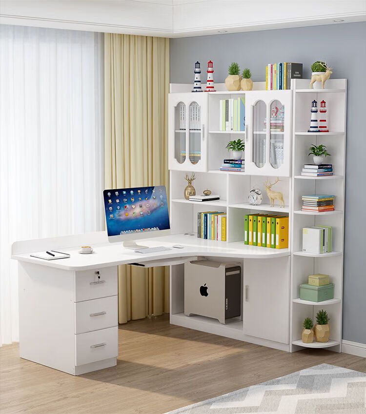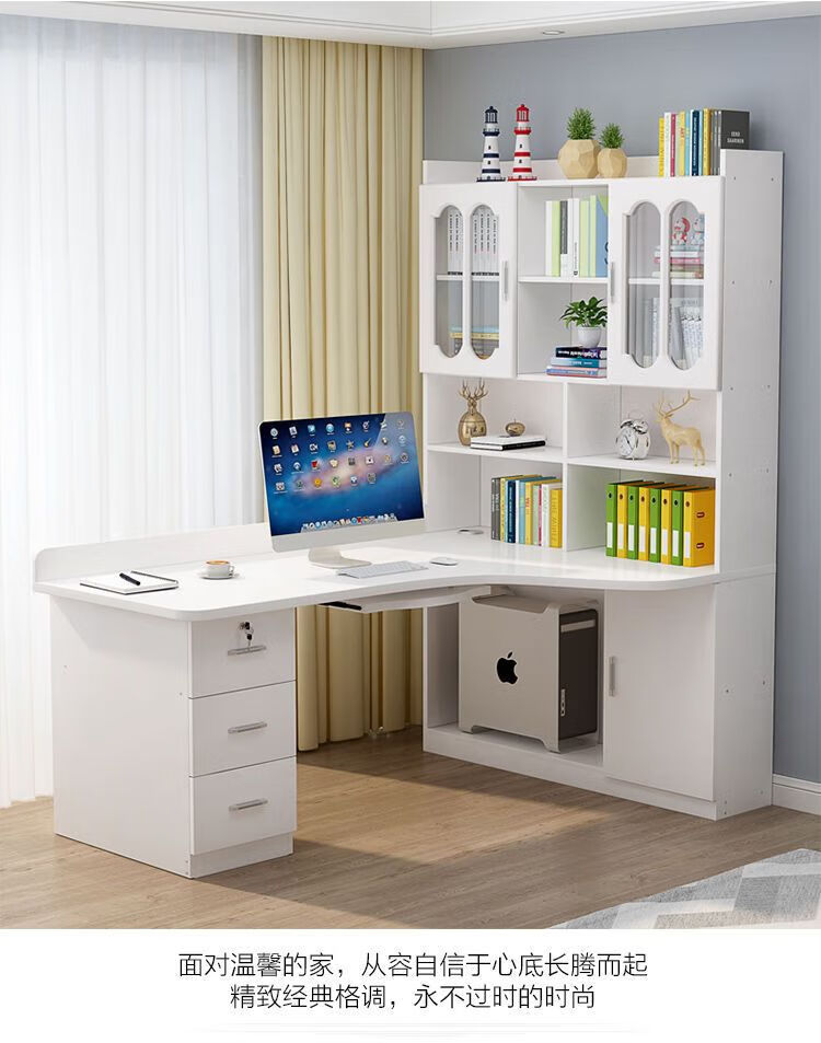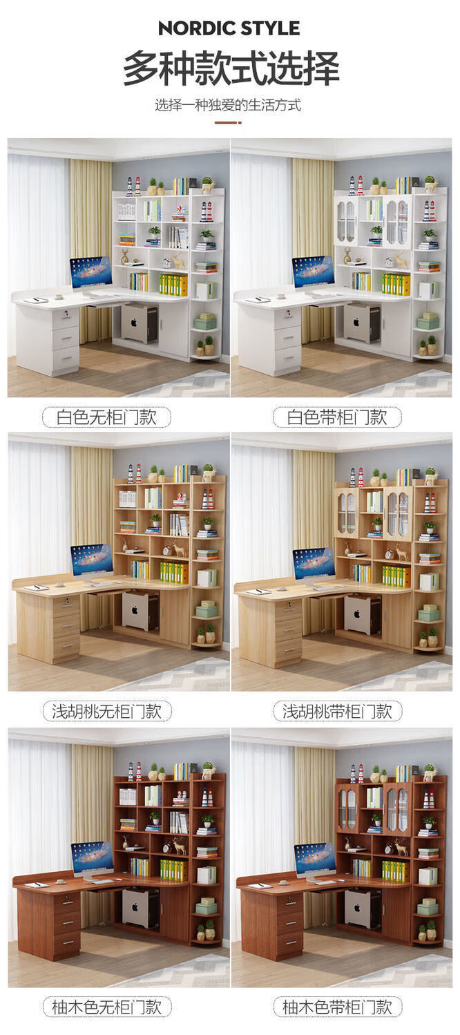 Solid wood desk bookshelf combination corner desktop computer desk desk bookcase integrated child bedroom corner study table white 120*80 upper door host model