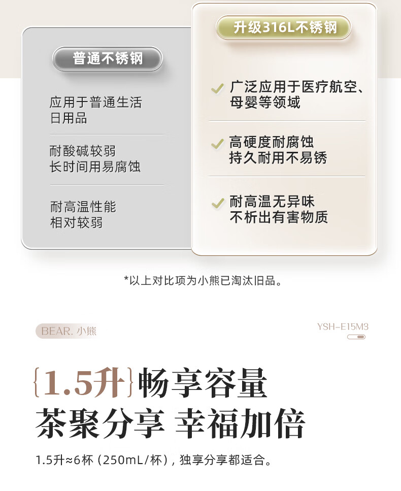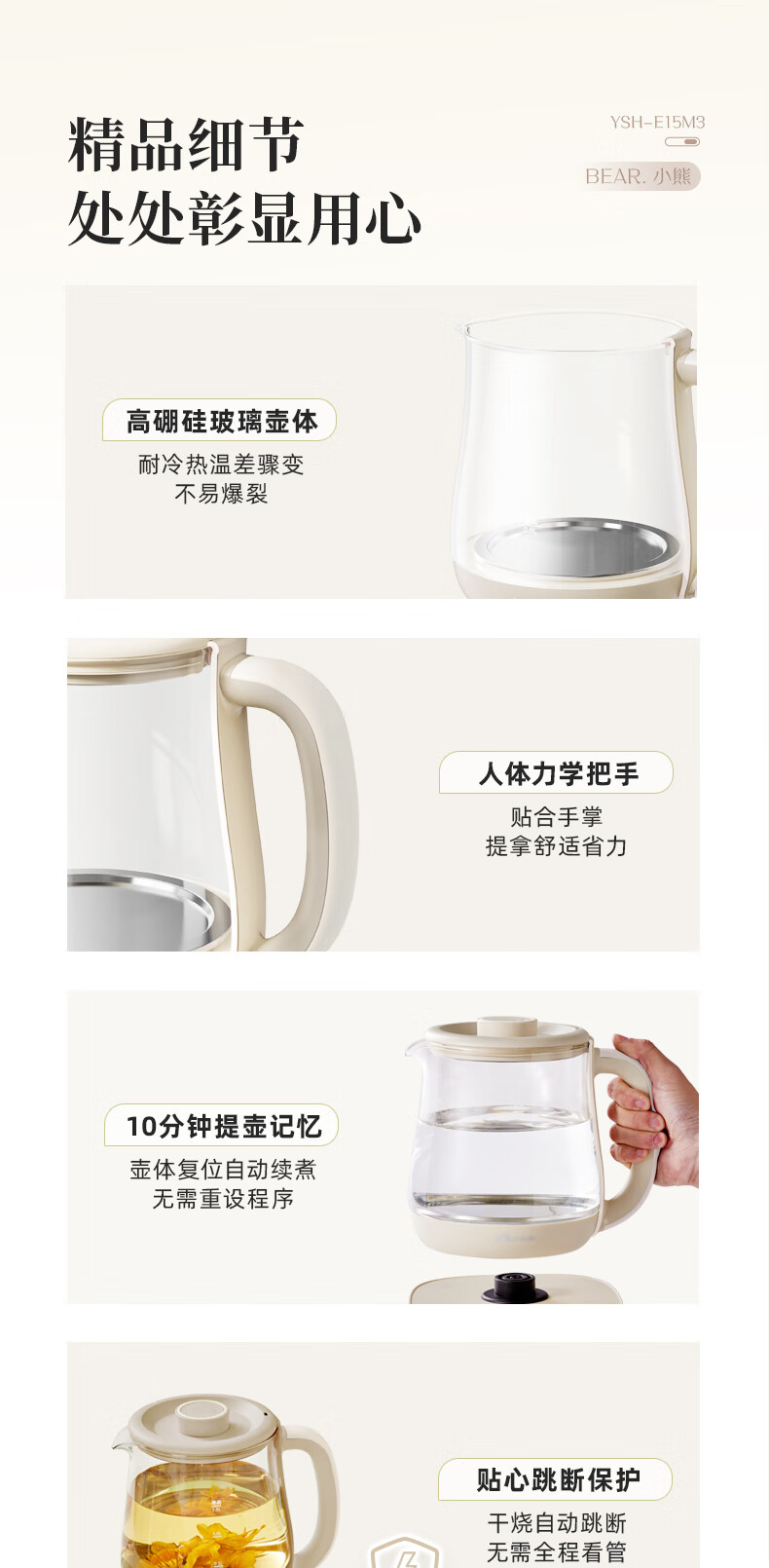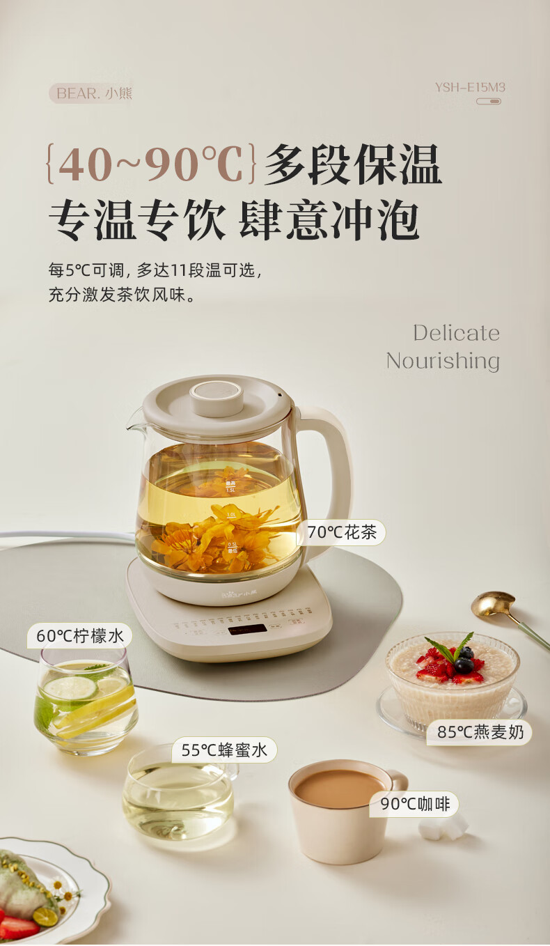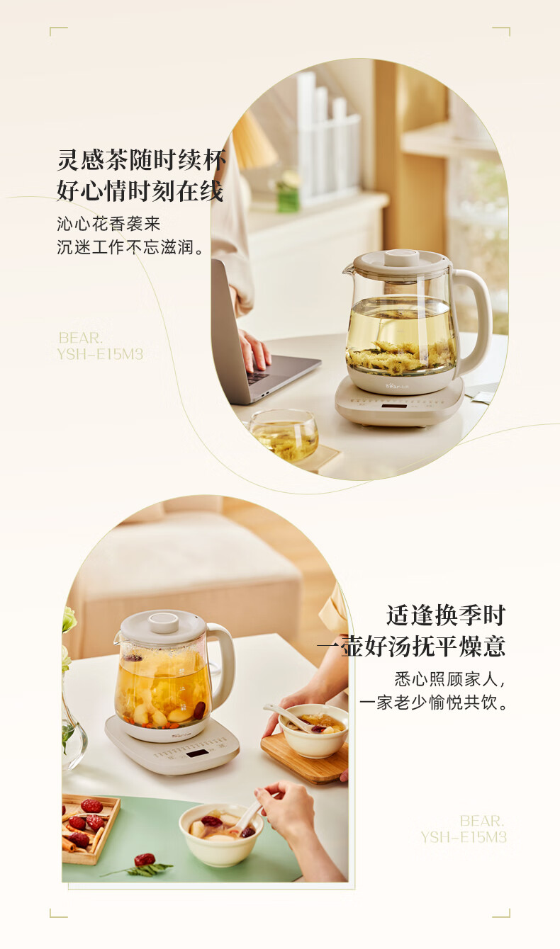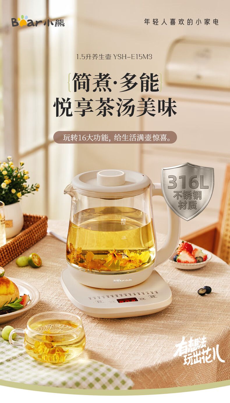 Bear health pot 1.5L tea maker small rice porridge kettle teapot 316L stainless steel multi-stage insulation mini glass flower teapot smart electric kettle without filter 316 stainless steel YSH-E15M3 1.5L