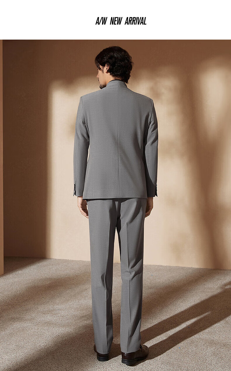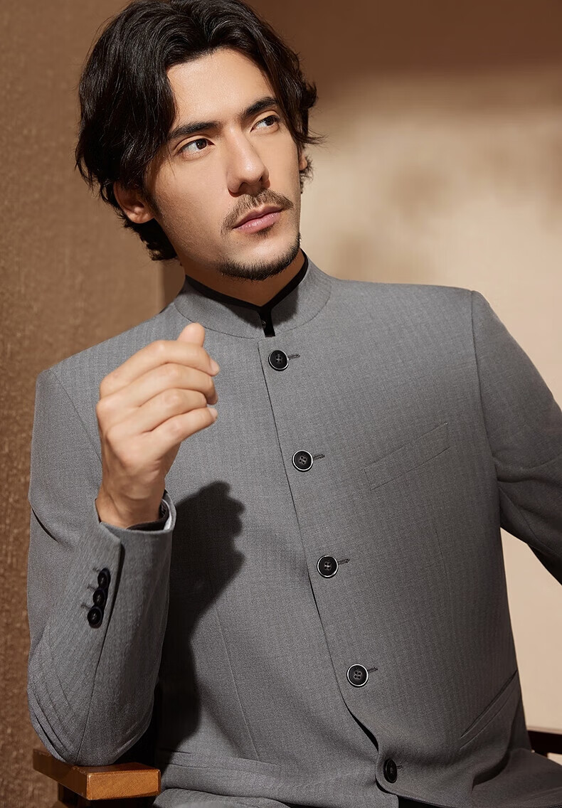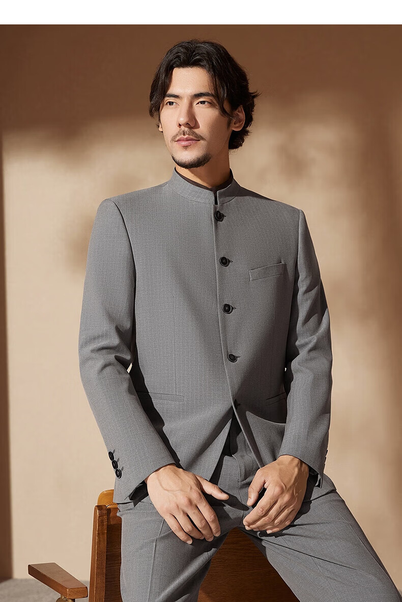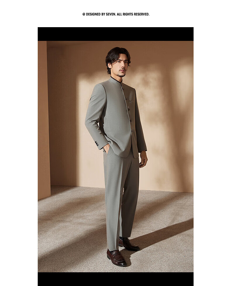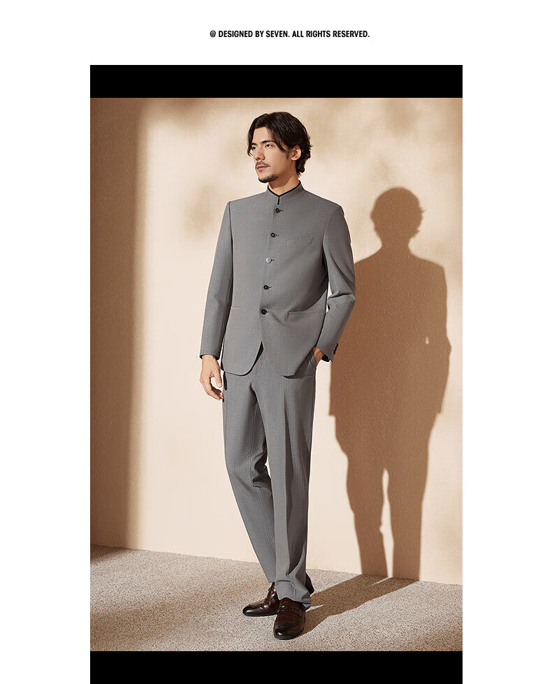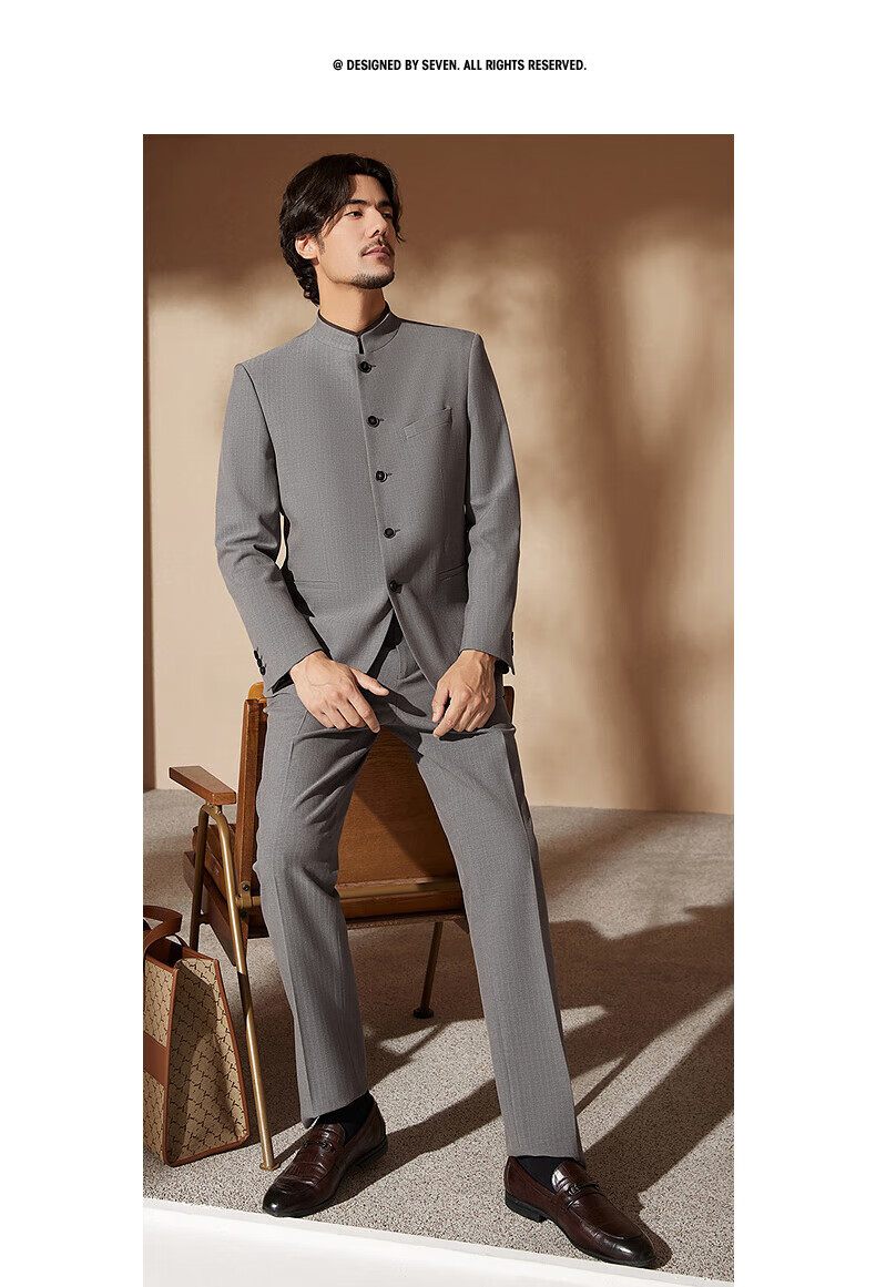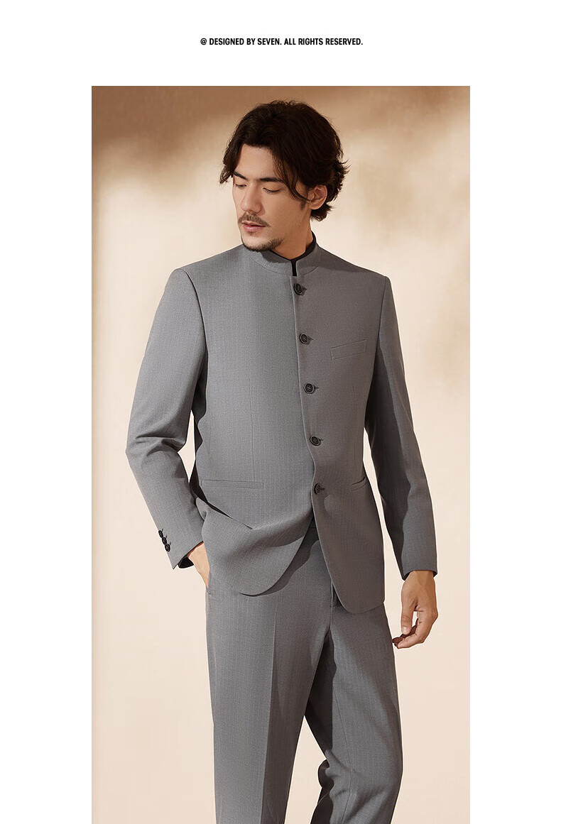 SEVEN suit men's 2025 autumn new herringbone jacquard five-breasted suit, Chinese stand-up collar, ash B44