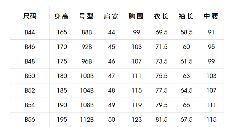 China (cm) 160-165/84-86 165-170 / 88-90 167-172 / 92-96 168-173 / 98-102 170-176 / 106-110