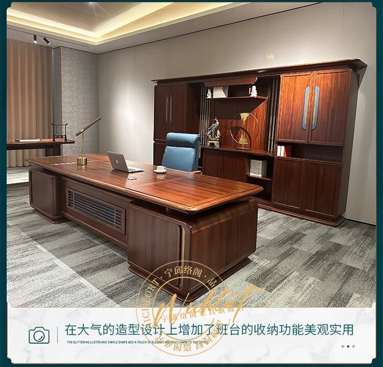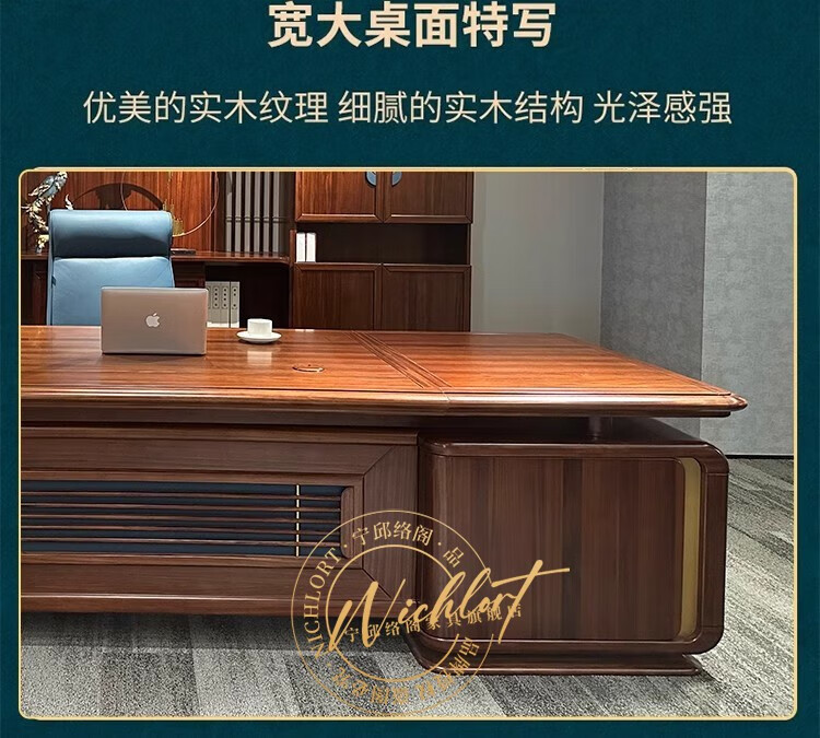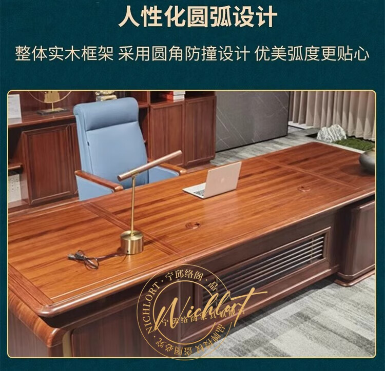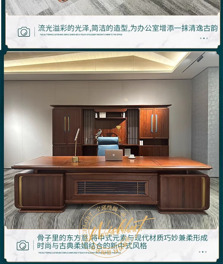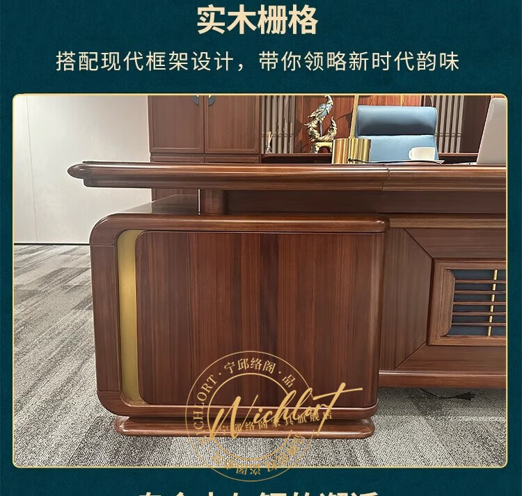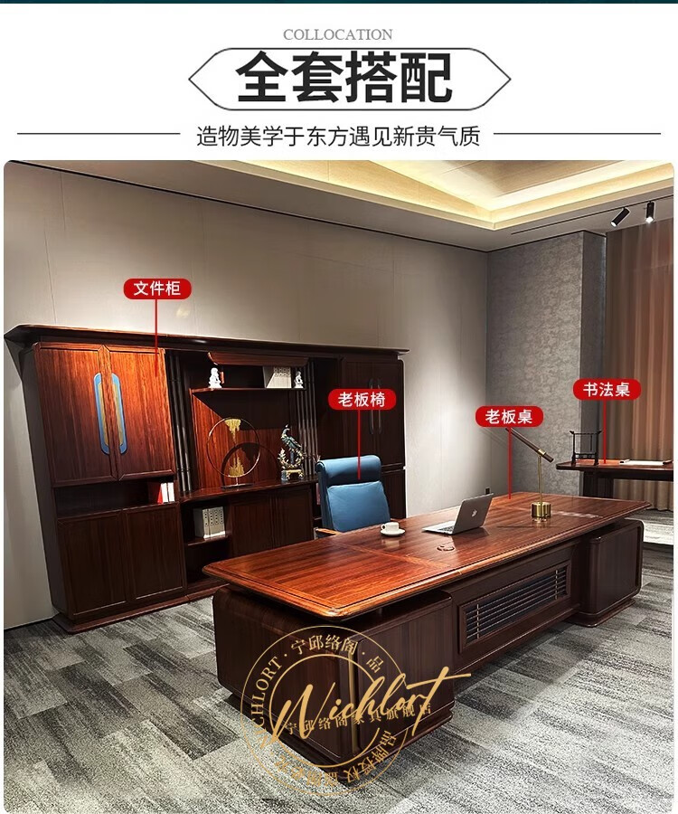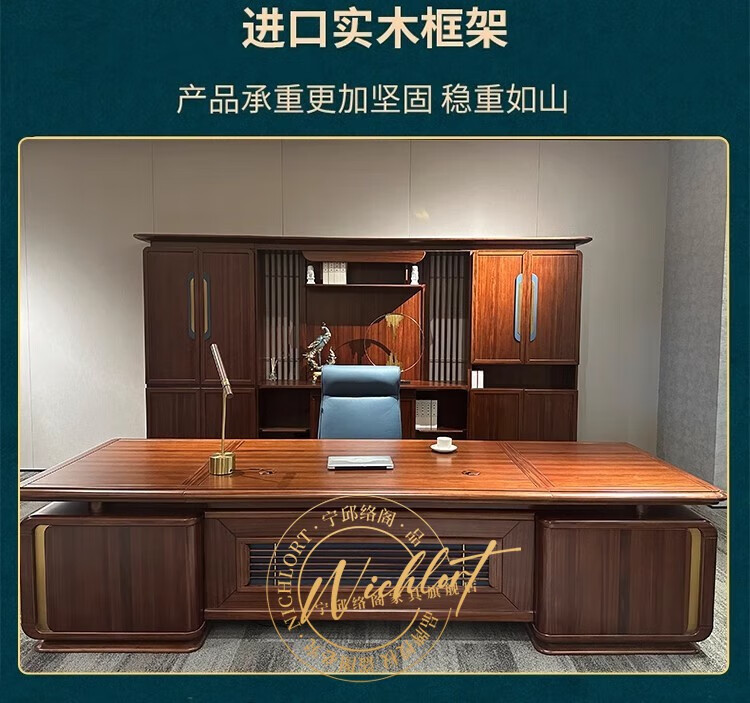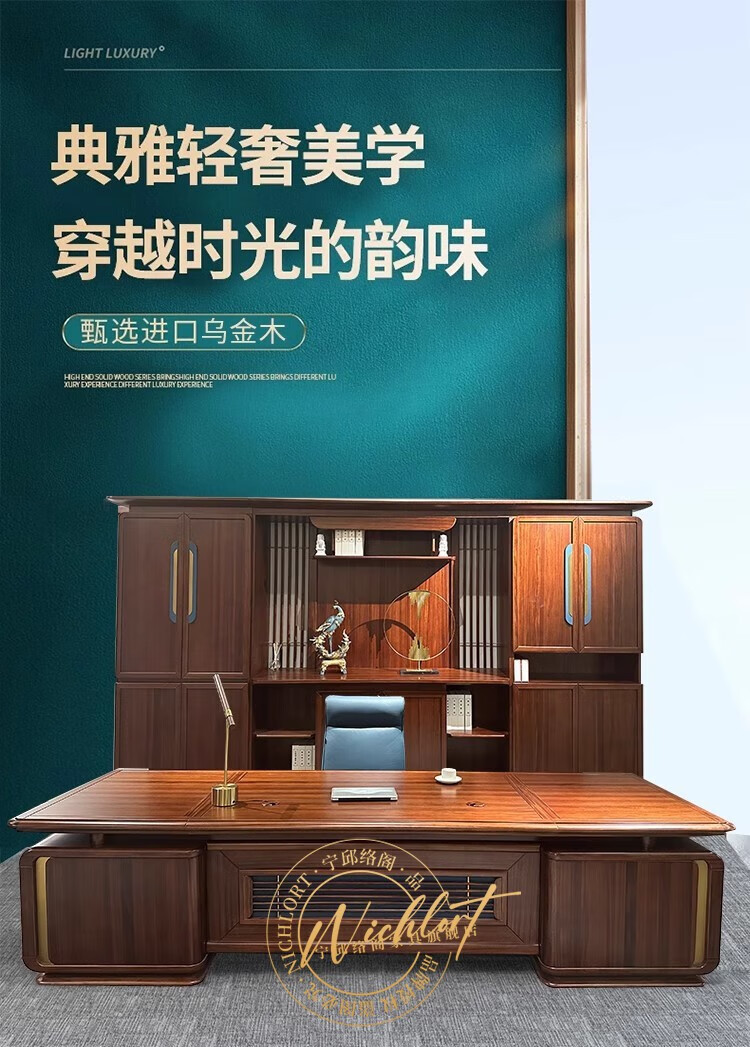 Ningqiu Luoge (NICHLORT) new Chinese style solid wood boss president desk and chair office desk ebony wood frame executive desk tea table table file cabinet sofa boss chair first layer cowhide