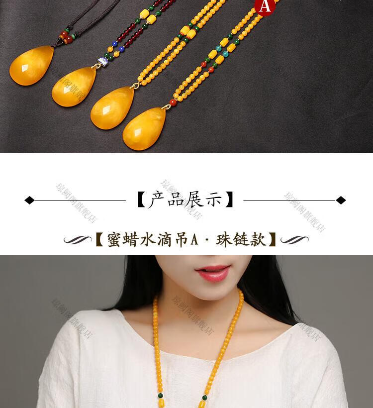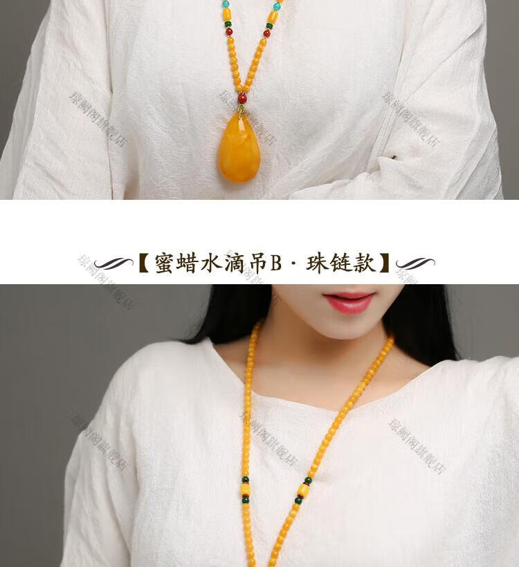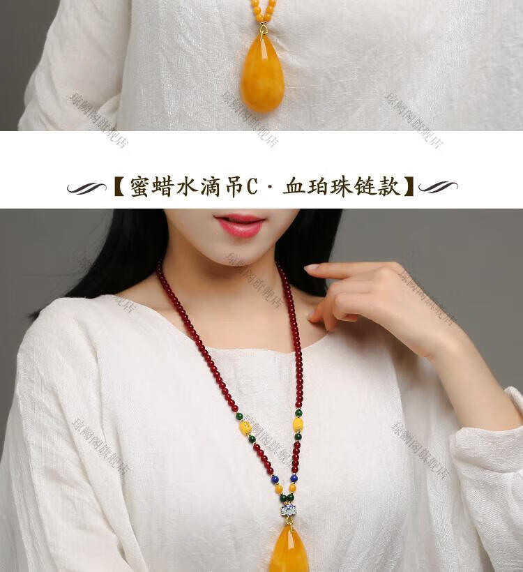Qiongque Pavilion Beeswax Pendant Amber Raw Stone Chicken Fat Yellow Honey Water Drop Square Brand Blood Amber Sweater Necklace for Men and Women Type A