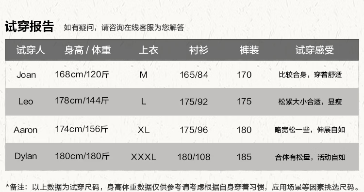 China (cm) 160-165/84-86 165-170 / 88-90 167-172 / 92-96 168-173 / 98-102 170-176 / 106-110