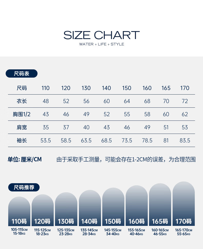 China (cm) 165 / 88-90 170 / 96-98 175 / 108-110 180 / 118-122 185 / 126-130