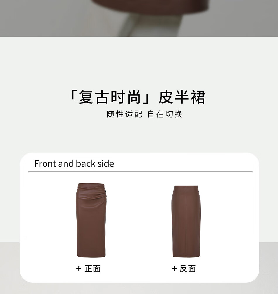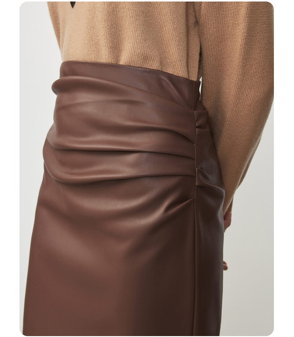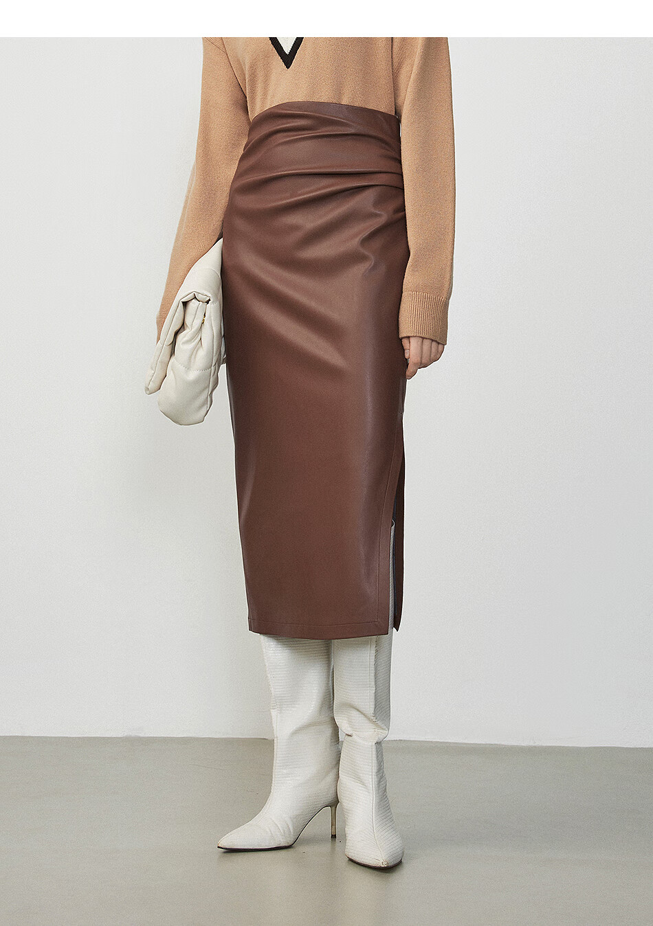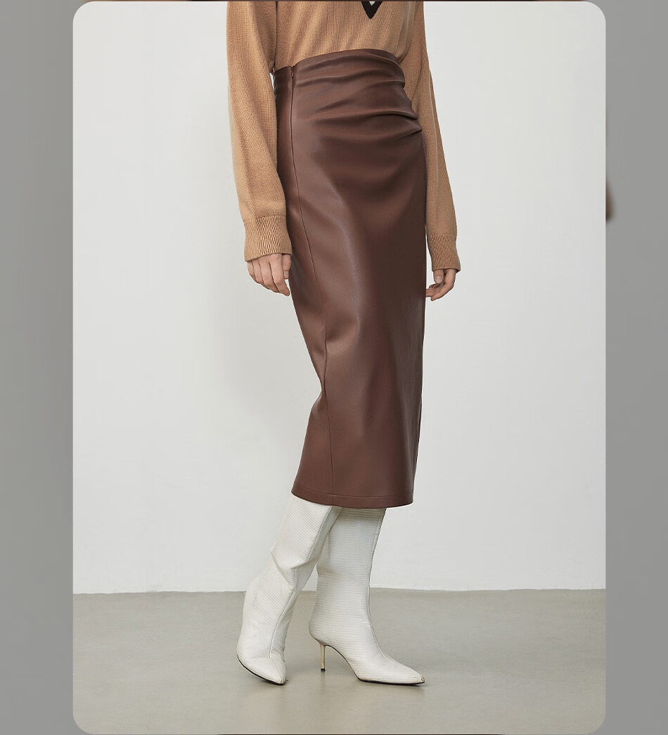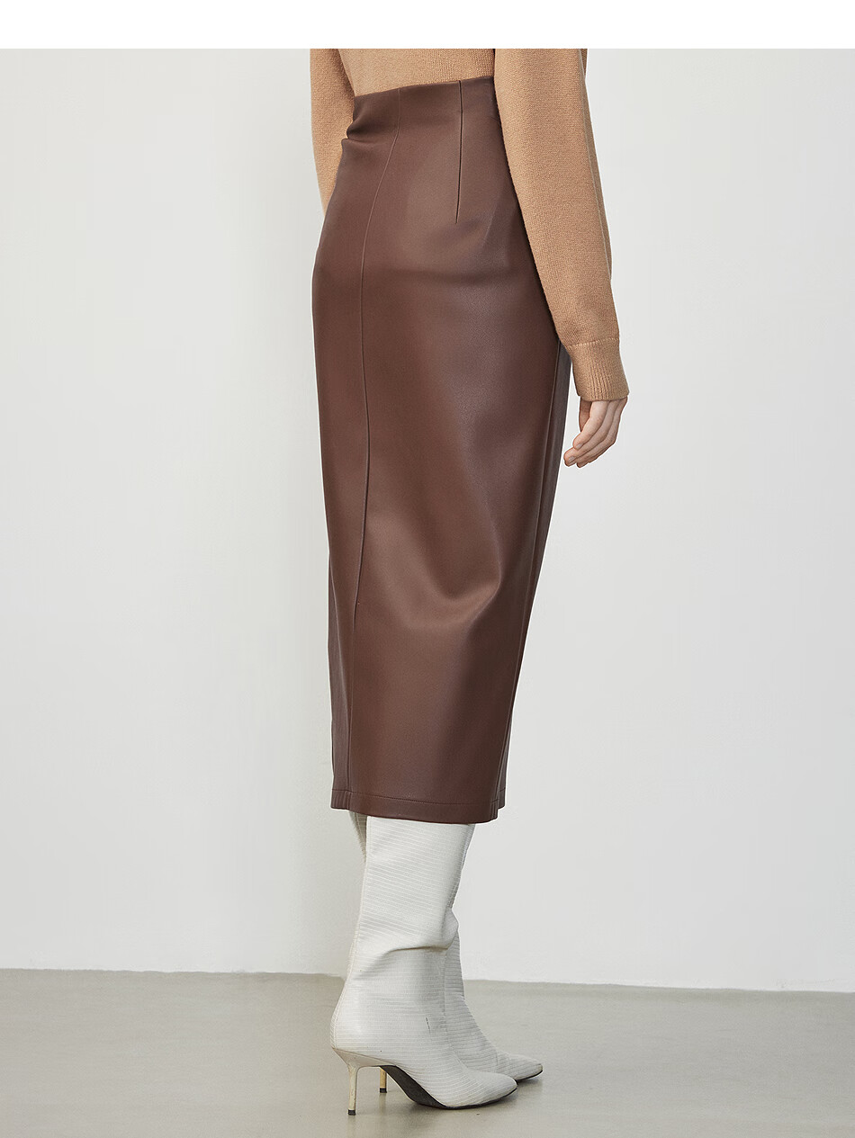 Langzi retro high-waist straight temperament slim slim leather skirt mid-length commuter casual skirt new winter style dark coffee color 2 M
