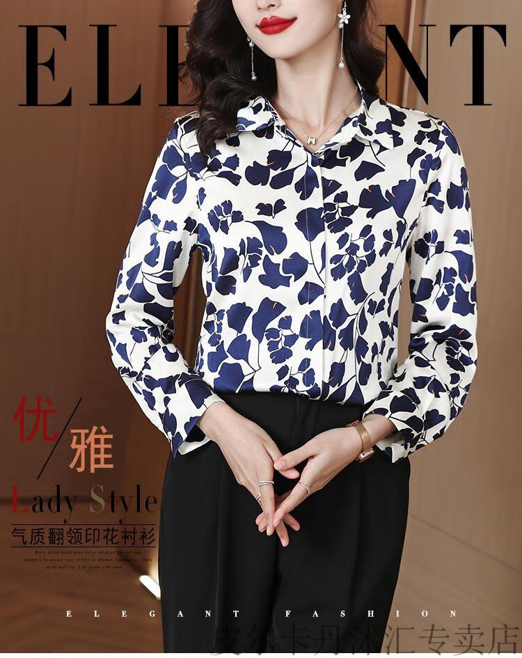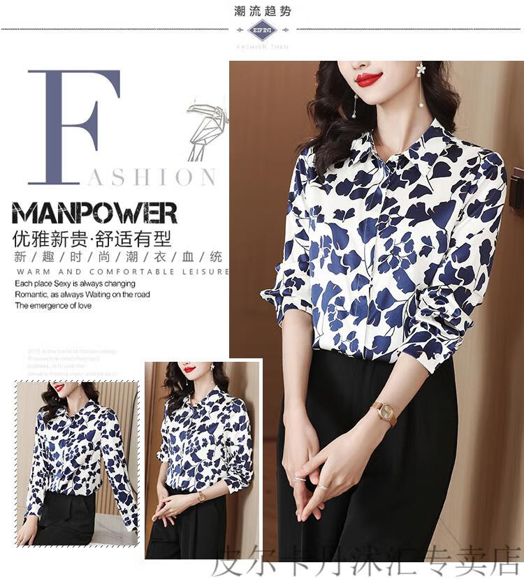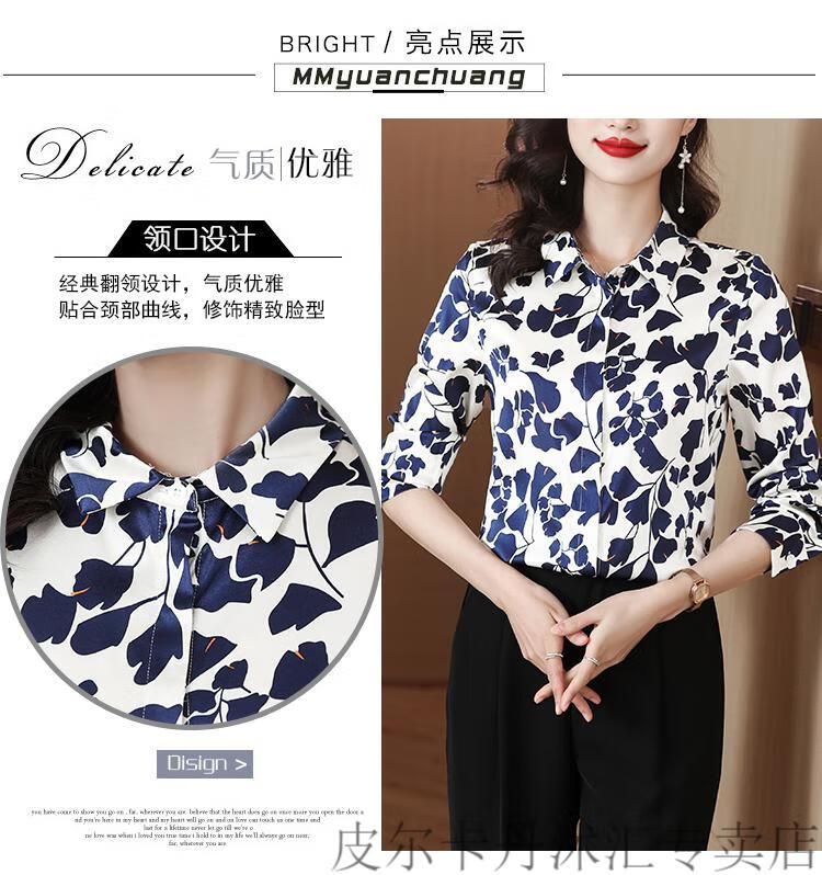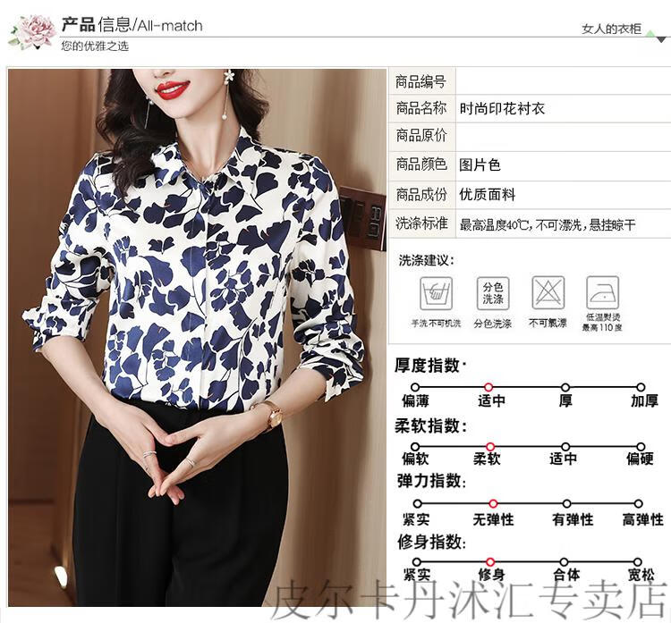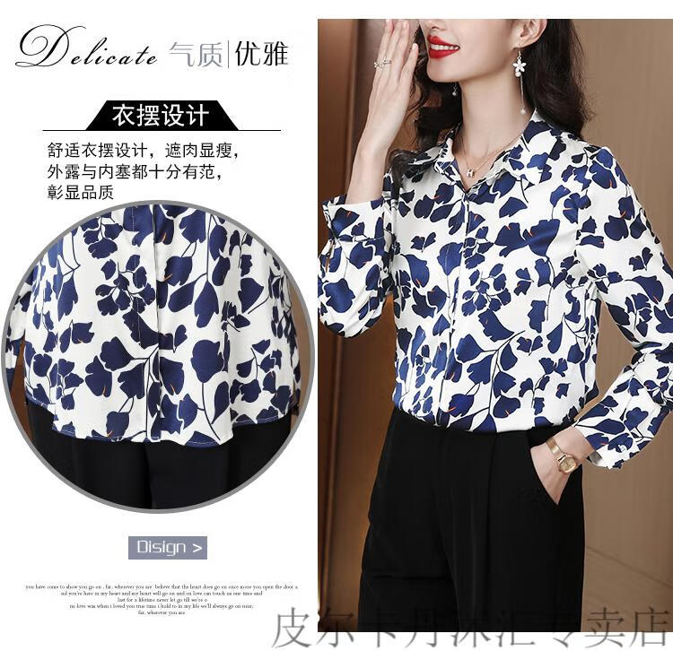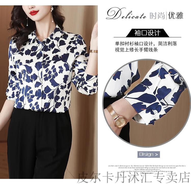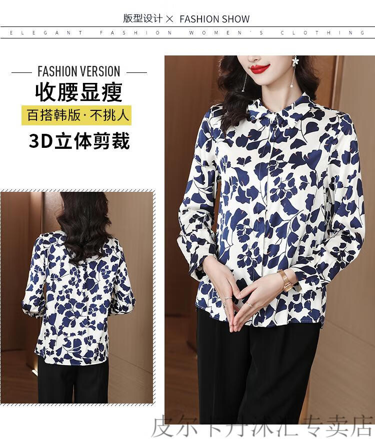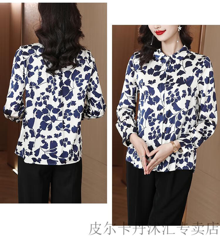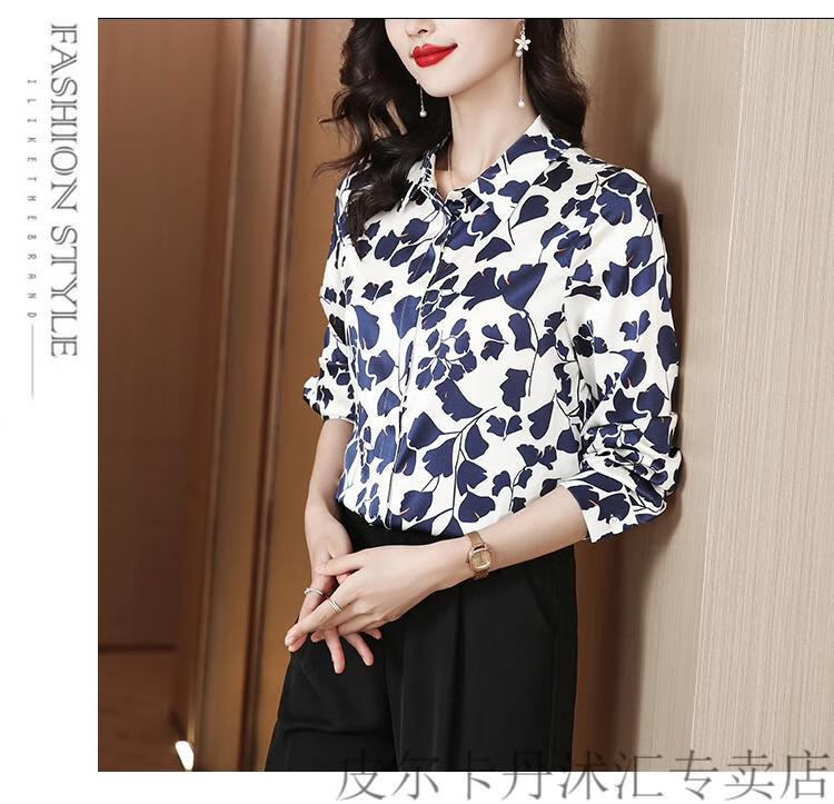 Pierre Cardin fashion printed long-sleeved chiffon shirt for women in spring and autumn, commuting temperament, slim top, fashionable mother's belly-covering shirt, leaf flower 3XL 140-150Jin Jin is equal to 0.5 kg