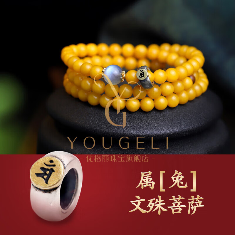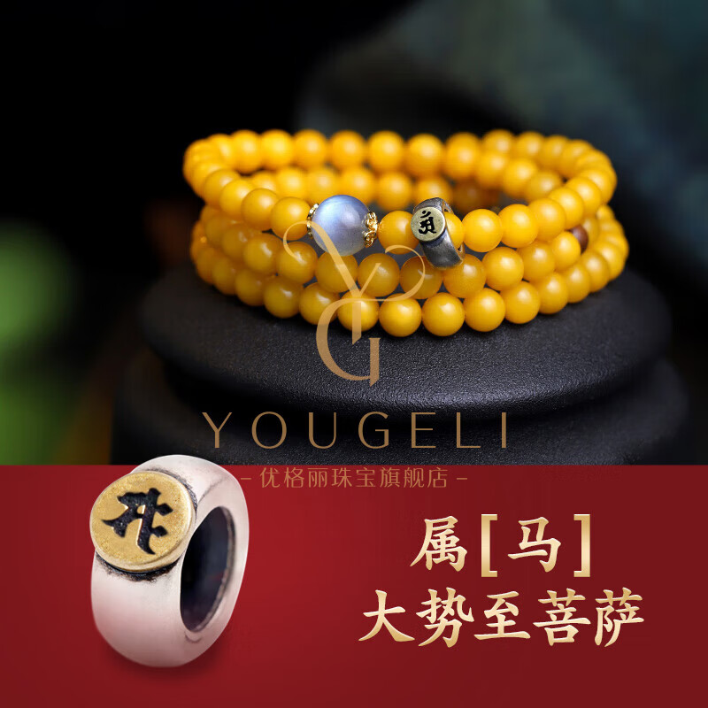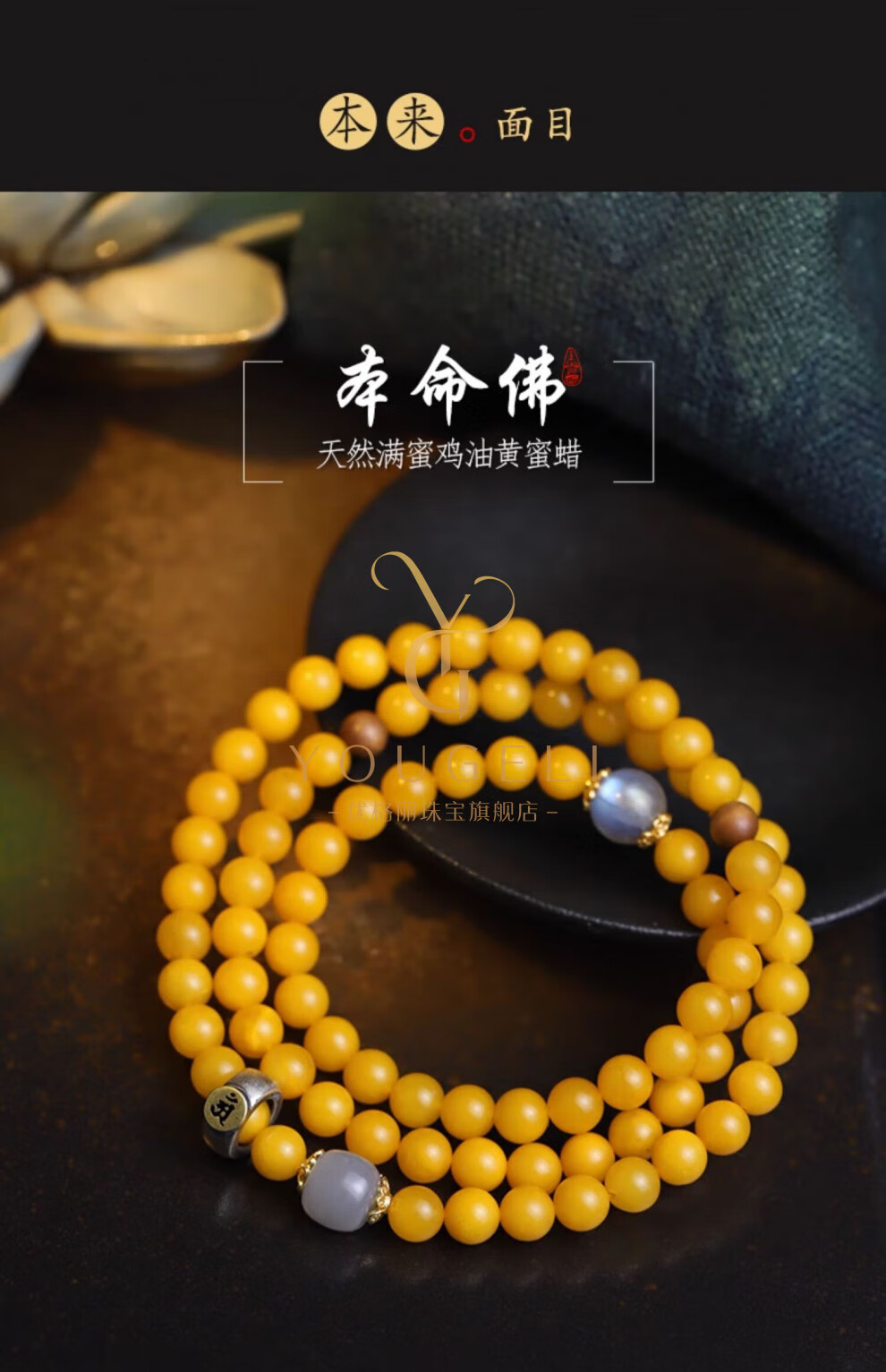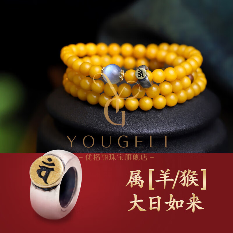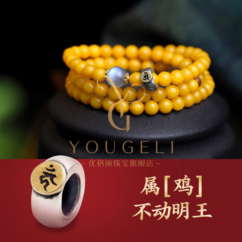Yogurt Guanxi Natural Chicken Fat Yellow Beeswax Bracelet Twelve Zodiac Signs 108 Buddha Beads Bracelet Men's and Women's Jewelry Native Buddha Heart Mantra (Sheep Monkey) Beads 8mm Four Circles