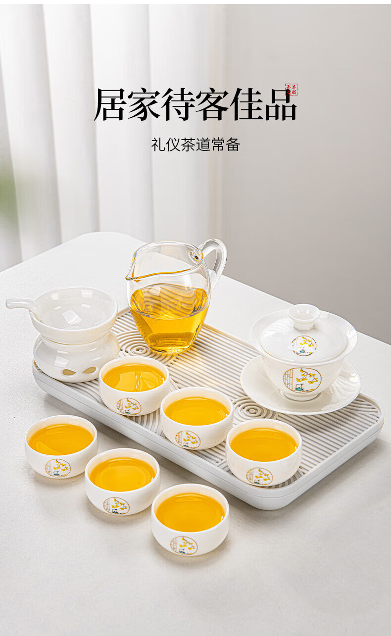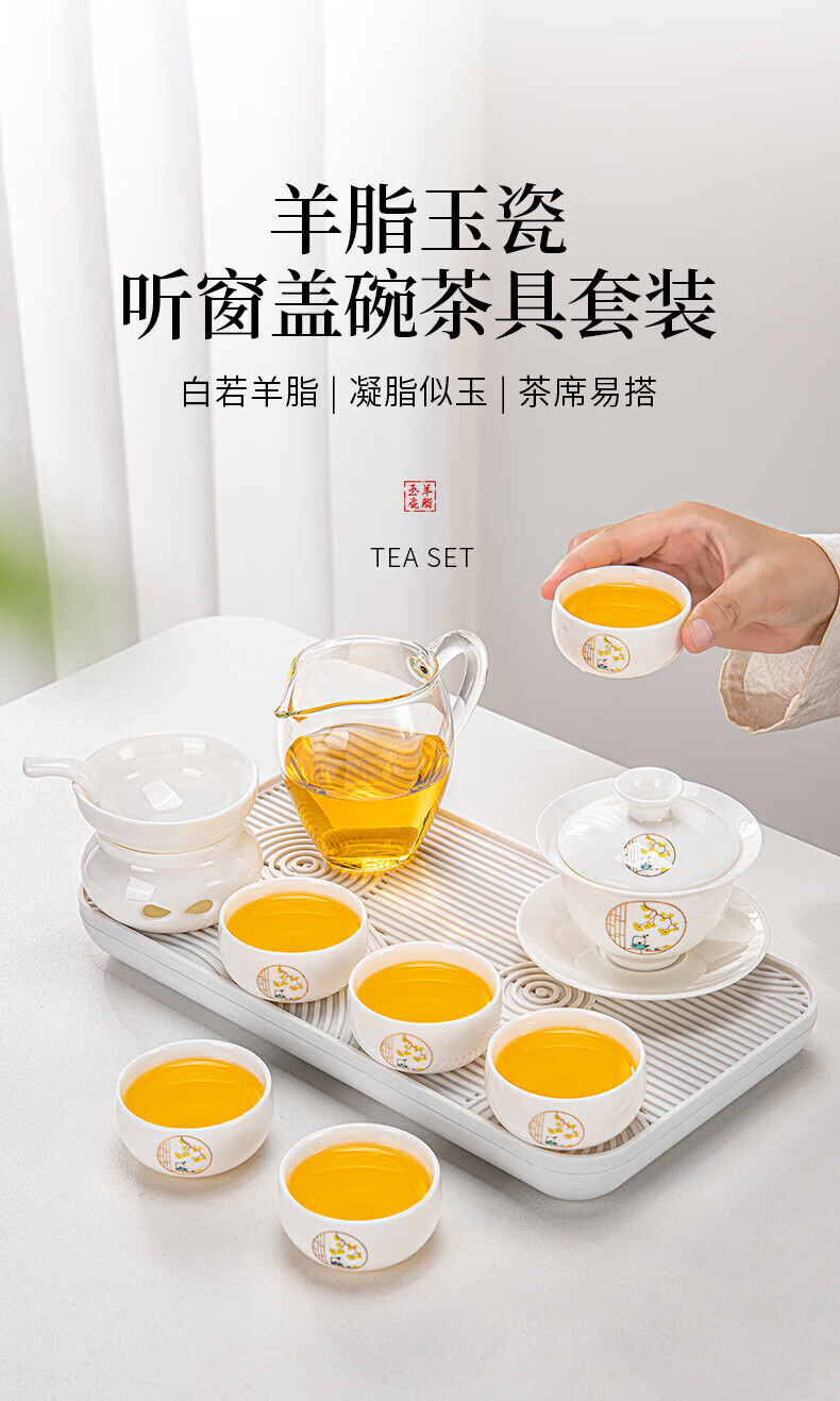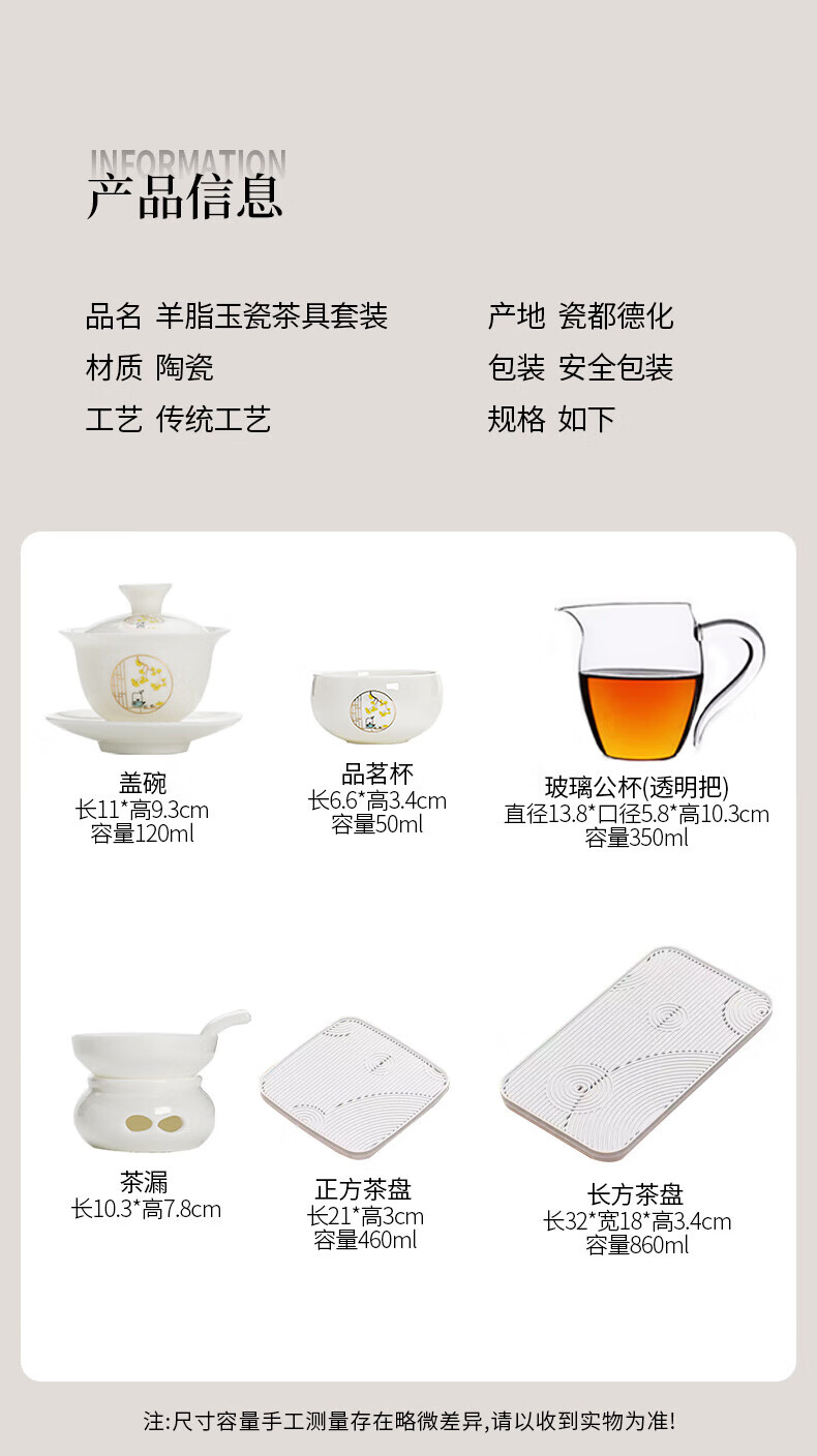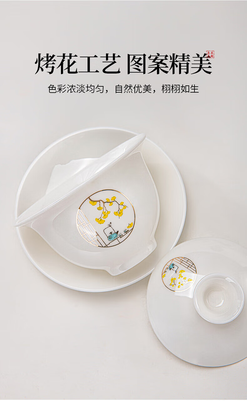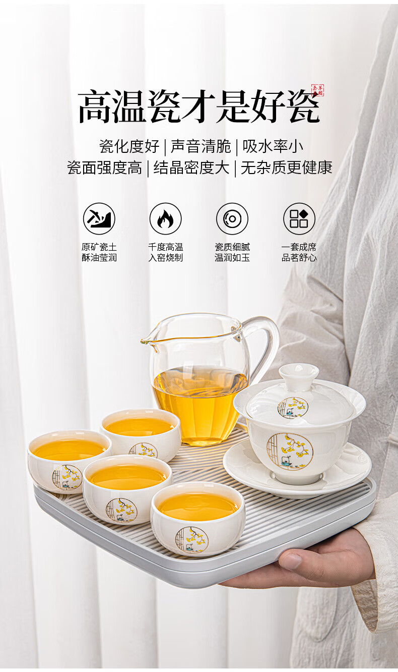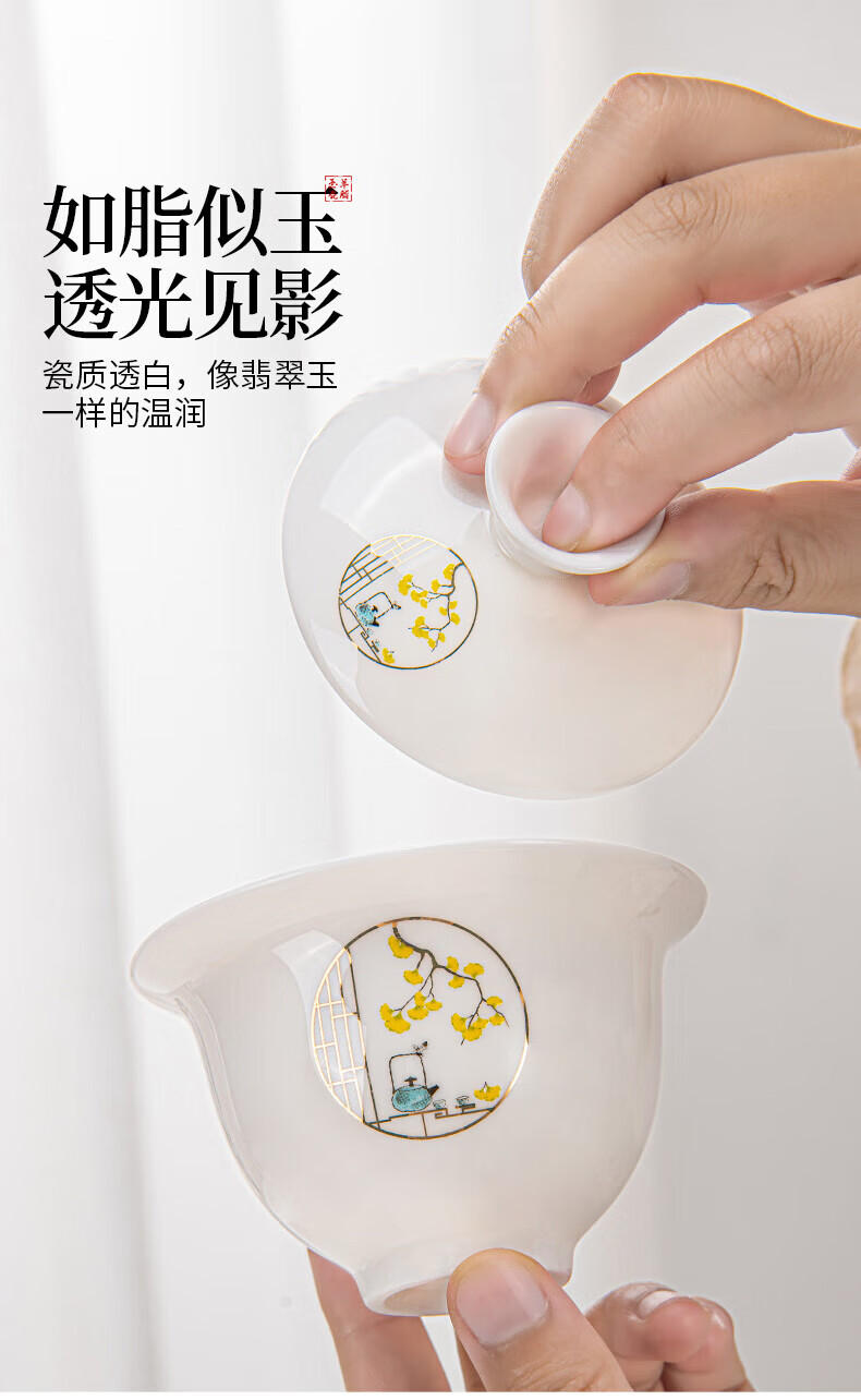 Qixuanyuan Mutton Fat Jade White Porcelain Kung Fu Tea Set Home Living Room Ceramic Covered Bowl Tea Cup Handheld Kettle Drinking Tea Making Tools Yunchu Ting Window Covered Bowl Two-Cup 4-piece Set