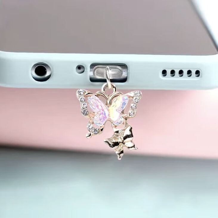 Laiji trendy three-dimensional double-layer color butterfly full diamond fishtail mobile phone dust plug universal for Apple 15 Huawei mobile phones main picture type-c oval fast charging interface (anti-lost rope)