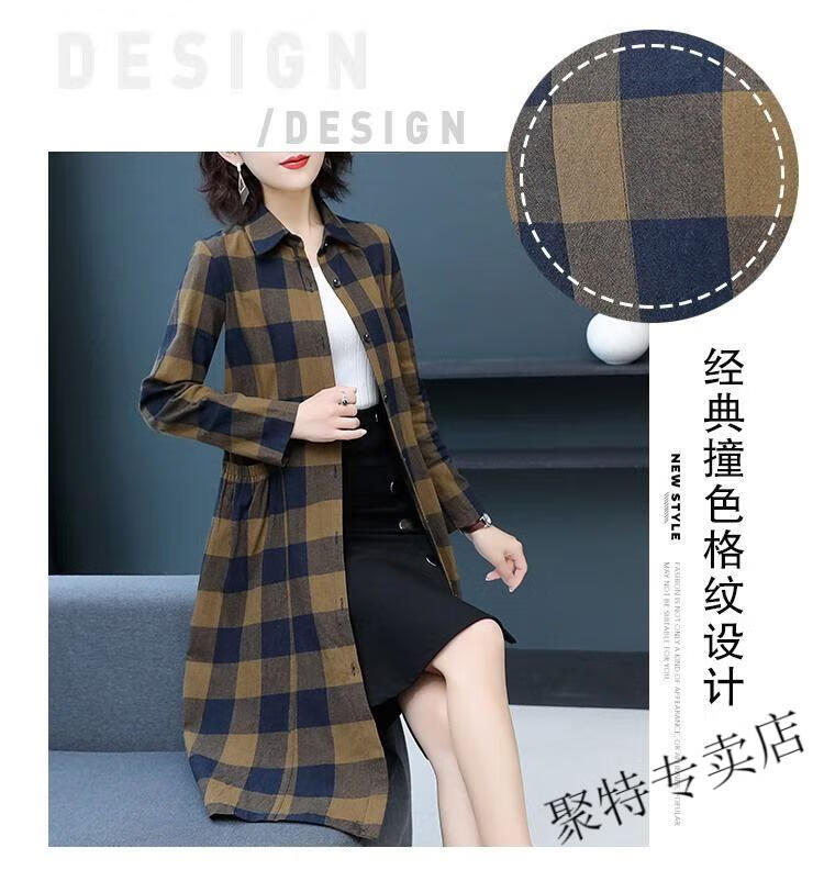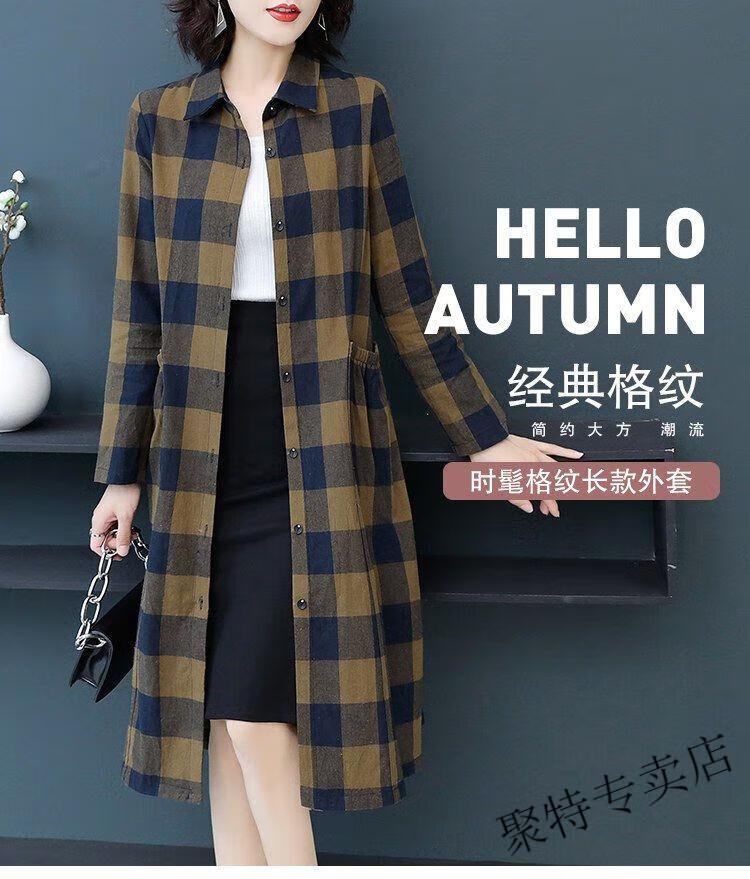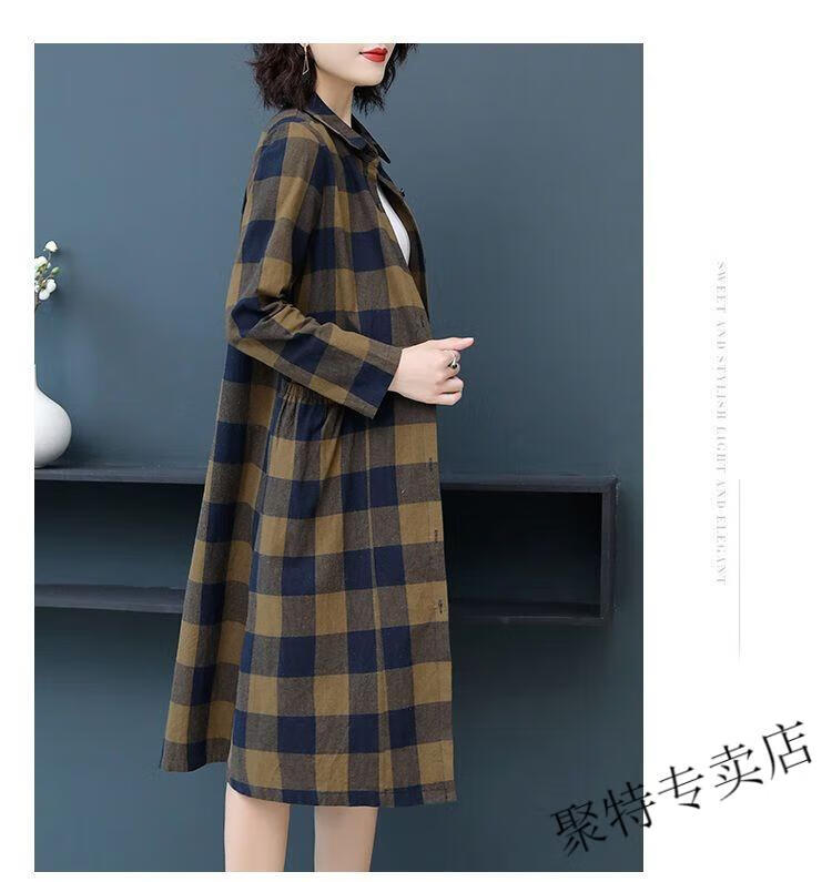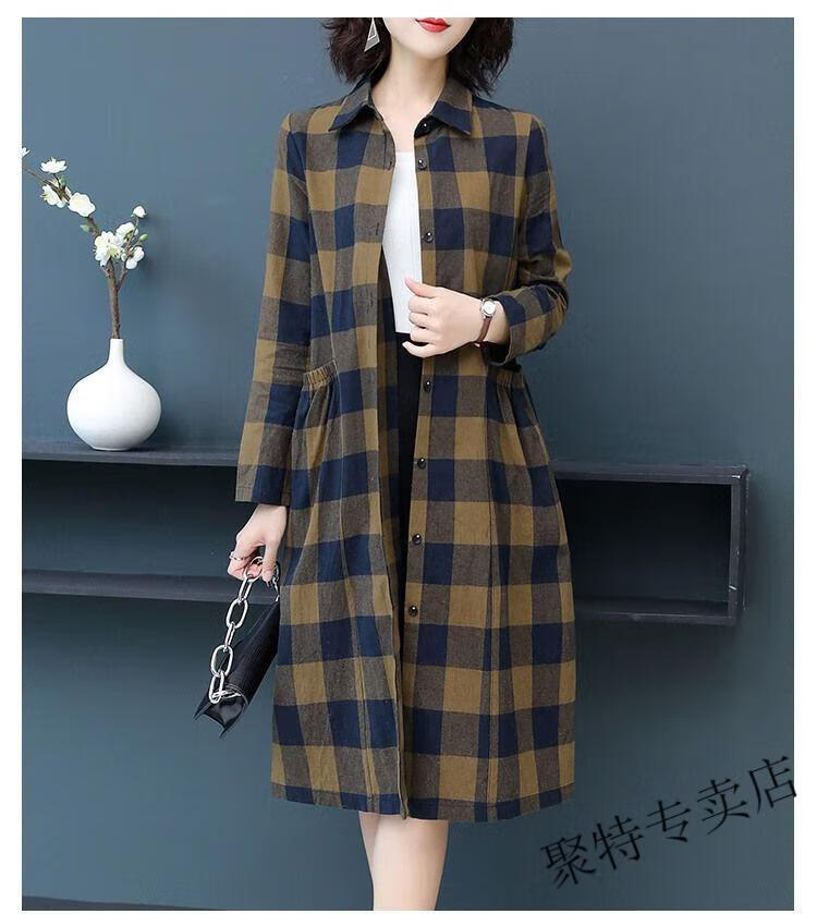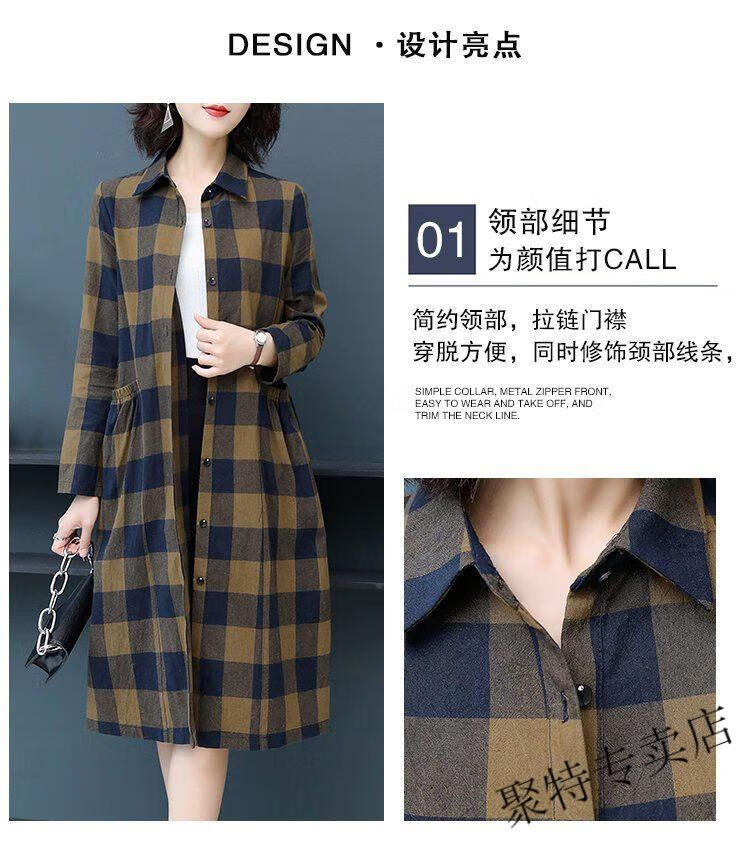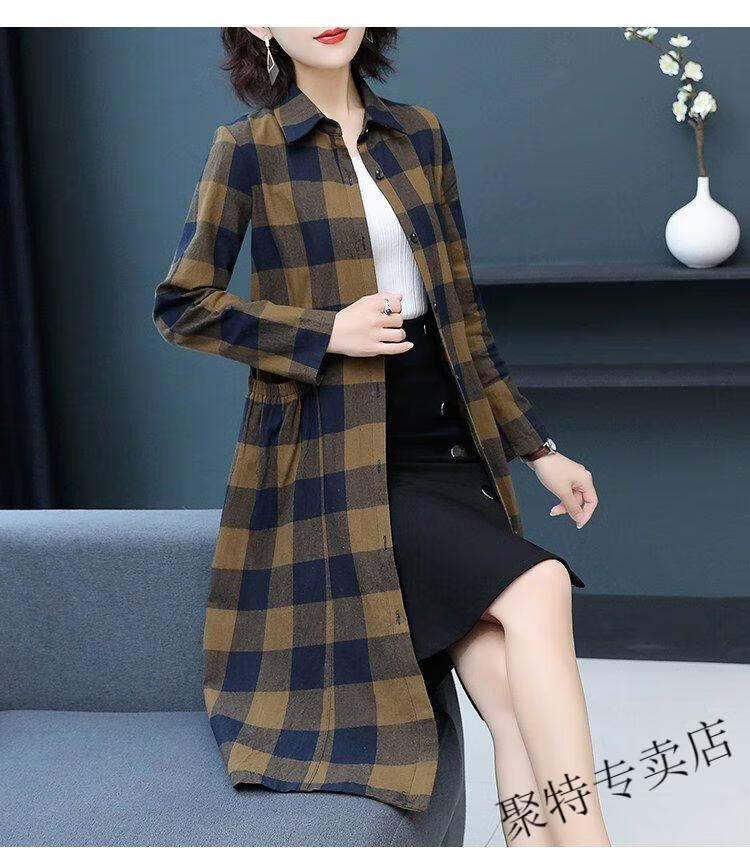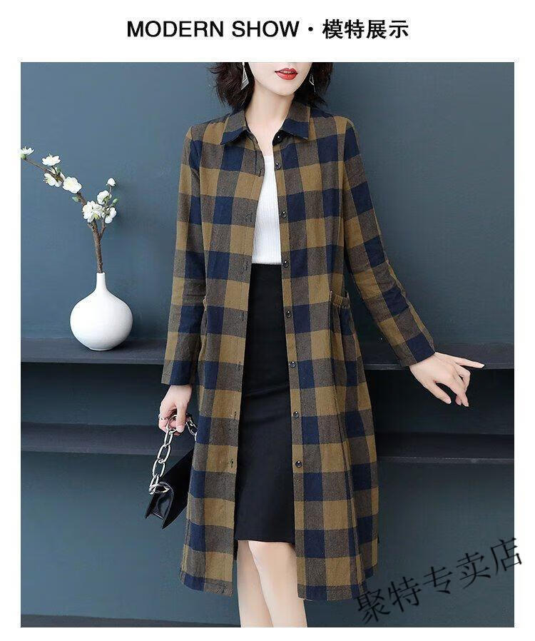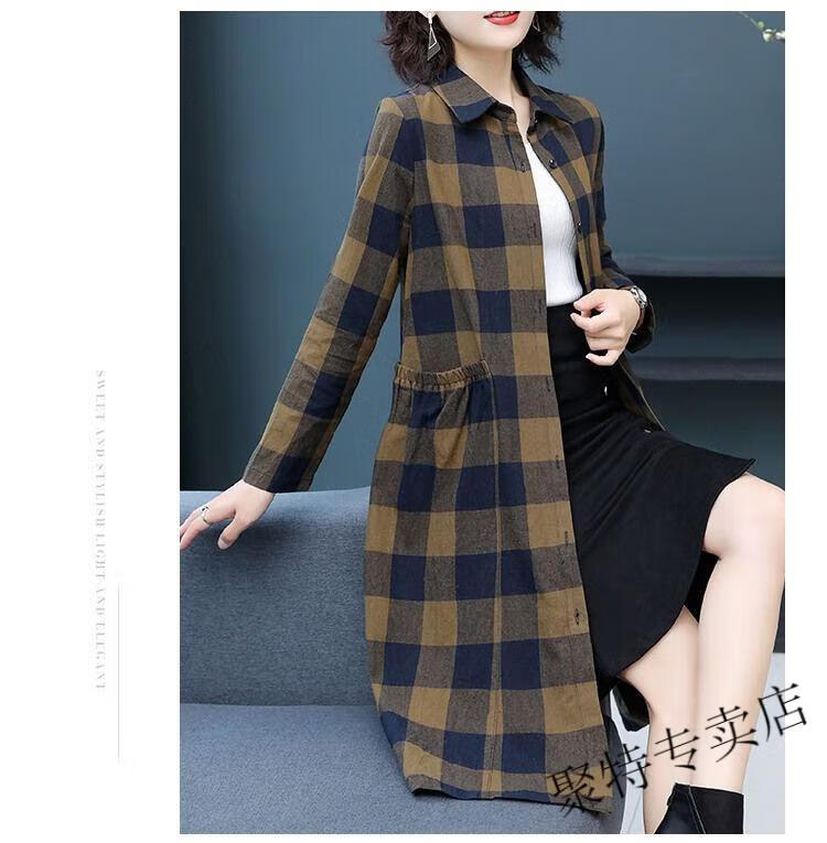 Pierre Cardin pure cotton plaid mid-length shirt for women spring and autumn new style large d size over-the-knee windbreaker loose long-sleeved shirt jacket plaid XL recommended 120-136 Jin Jin equals 0.5 kg