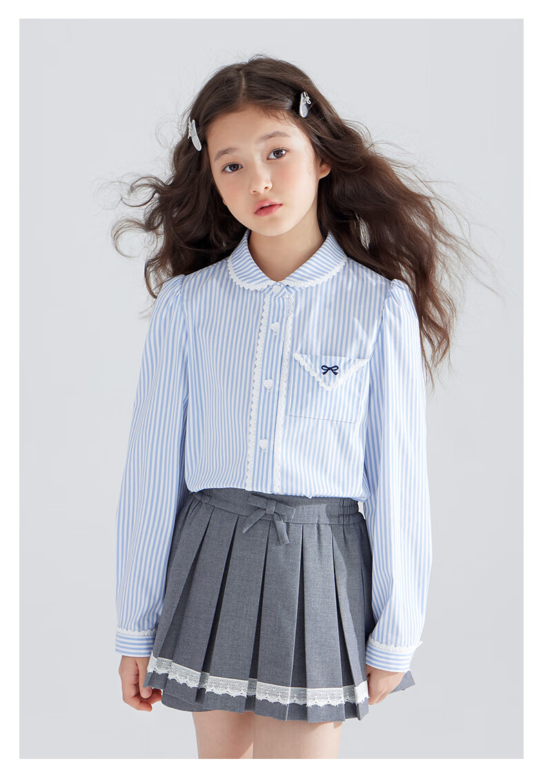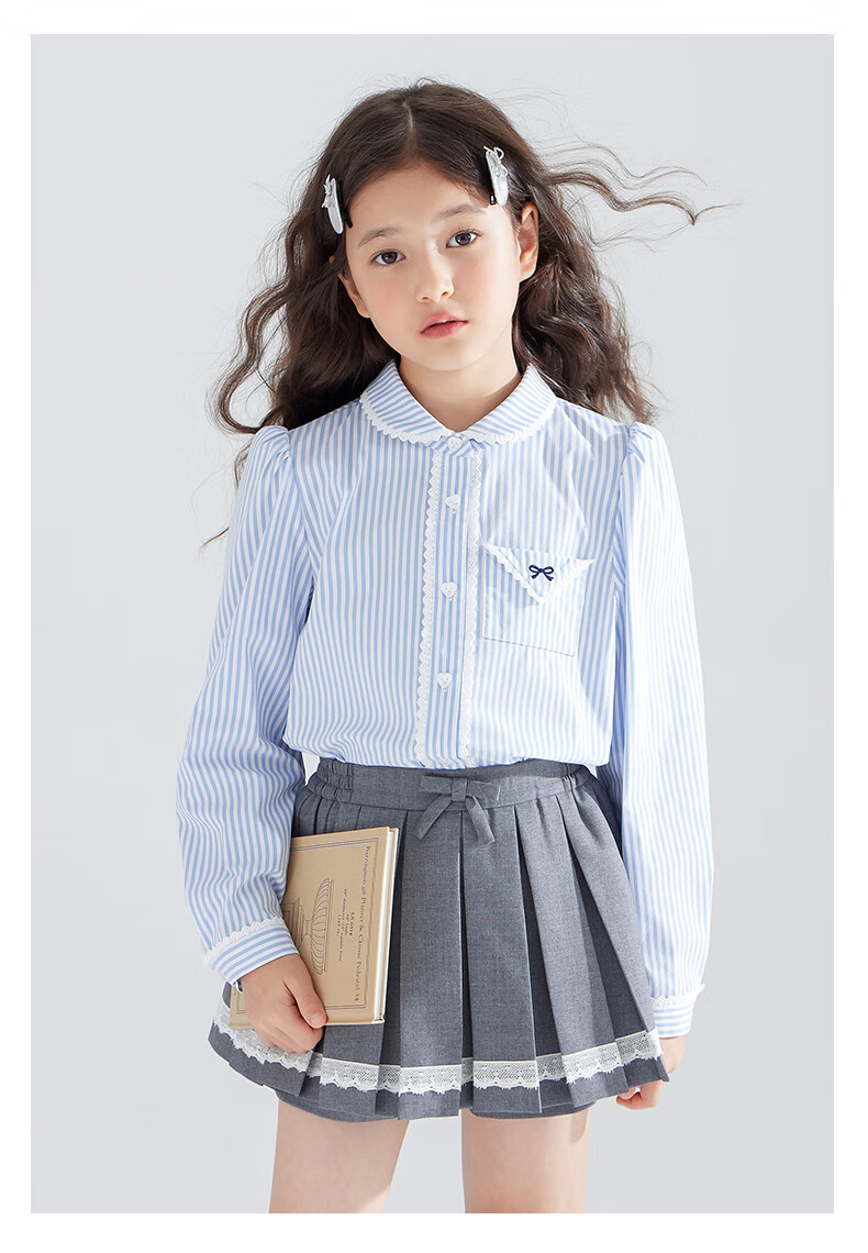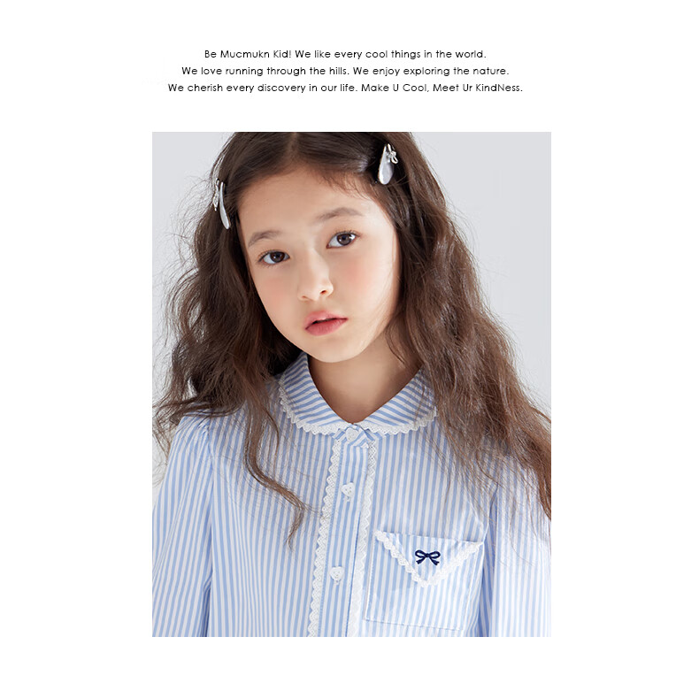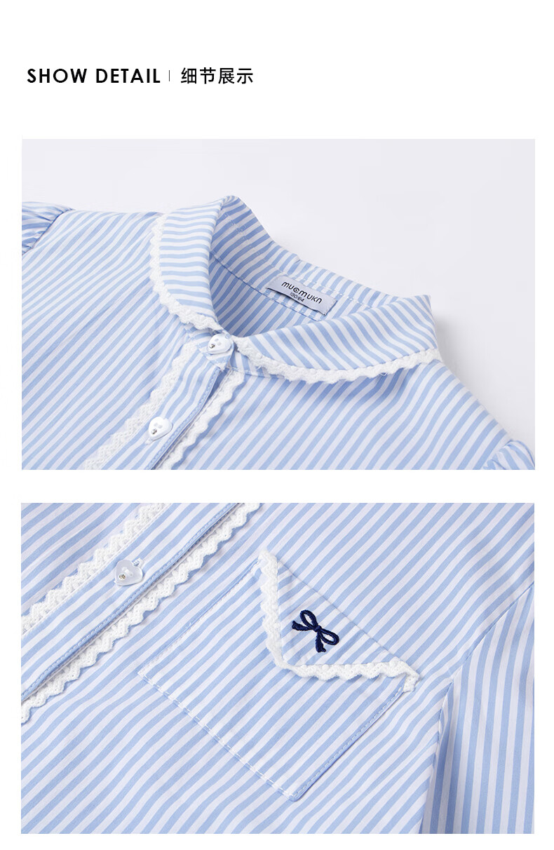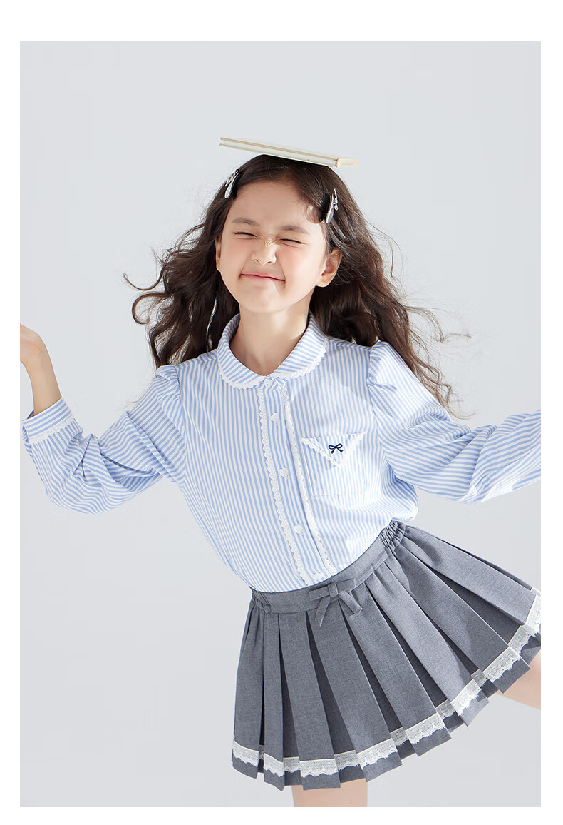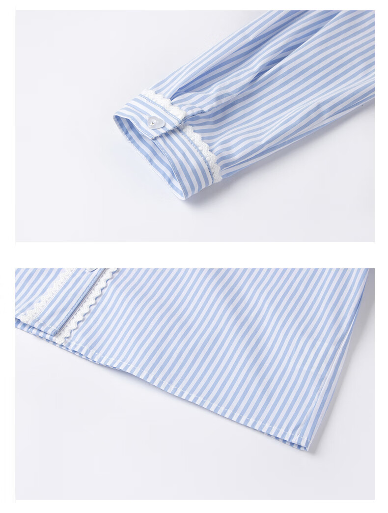 Mucmukn Blues Academy Girls Ballet Academy Style Lace Shirt Medium and Large Children's Blue and White Striped Bow Top Blue and White Strips 120cm
