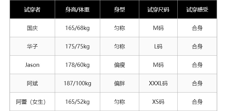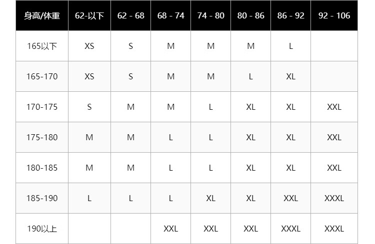 China (cm) 165 / 88-90 170 / 96-98 175 / 108-110 180 / 118-122 185 / 126-130