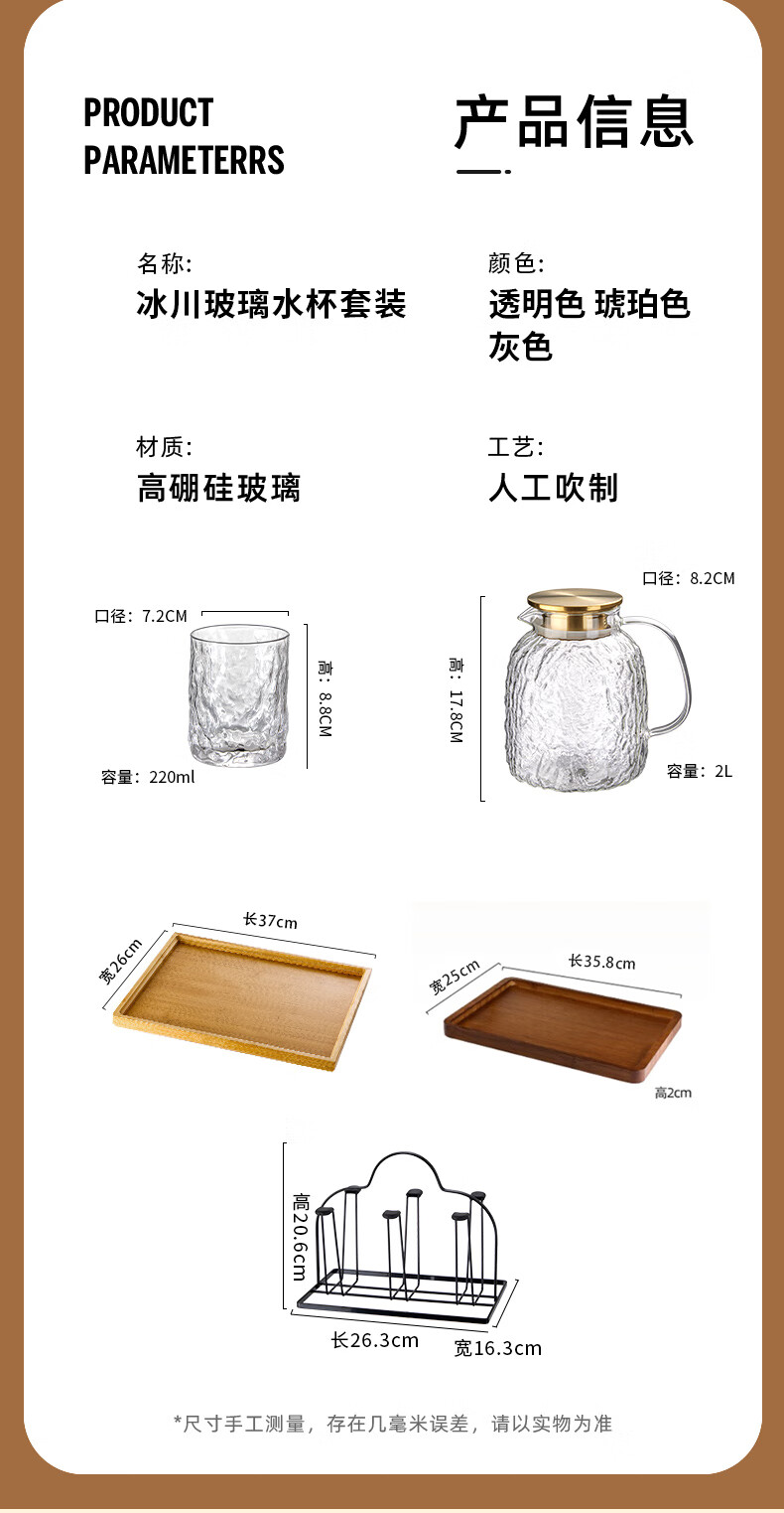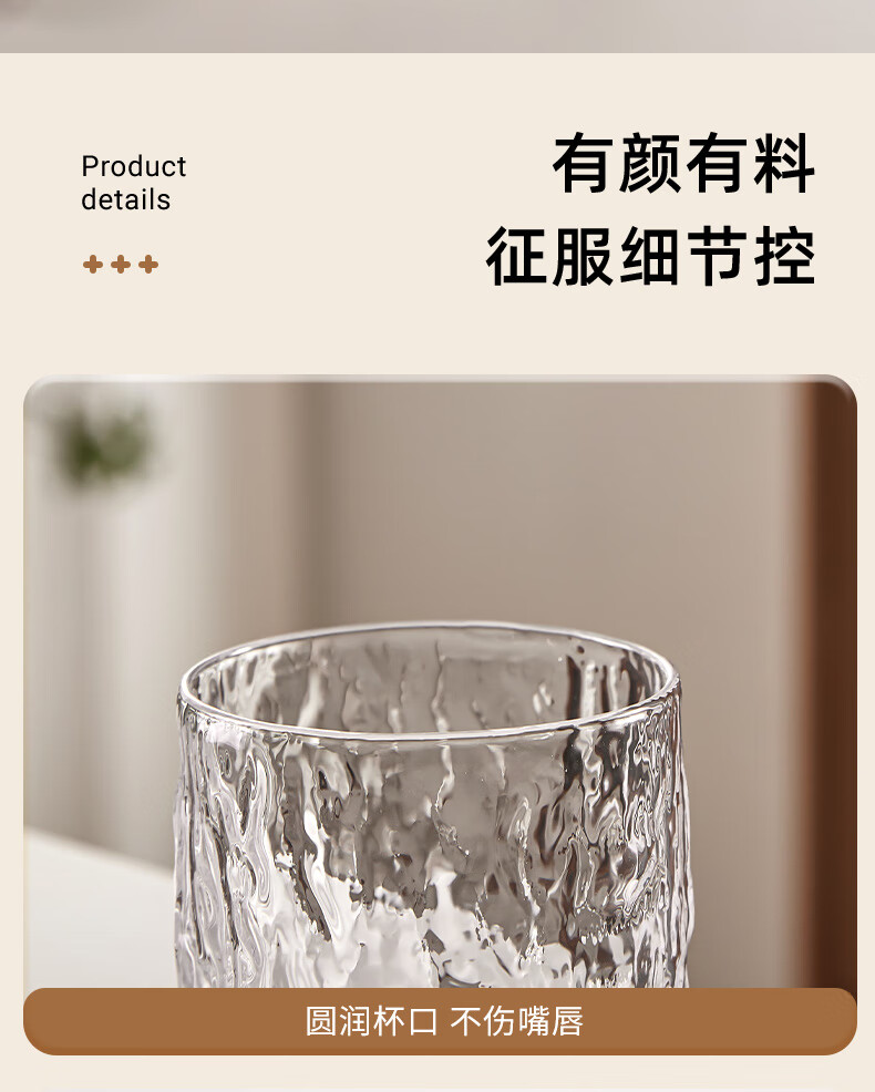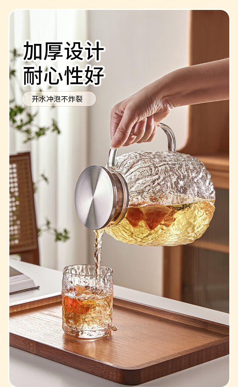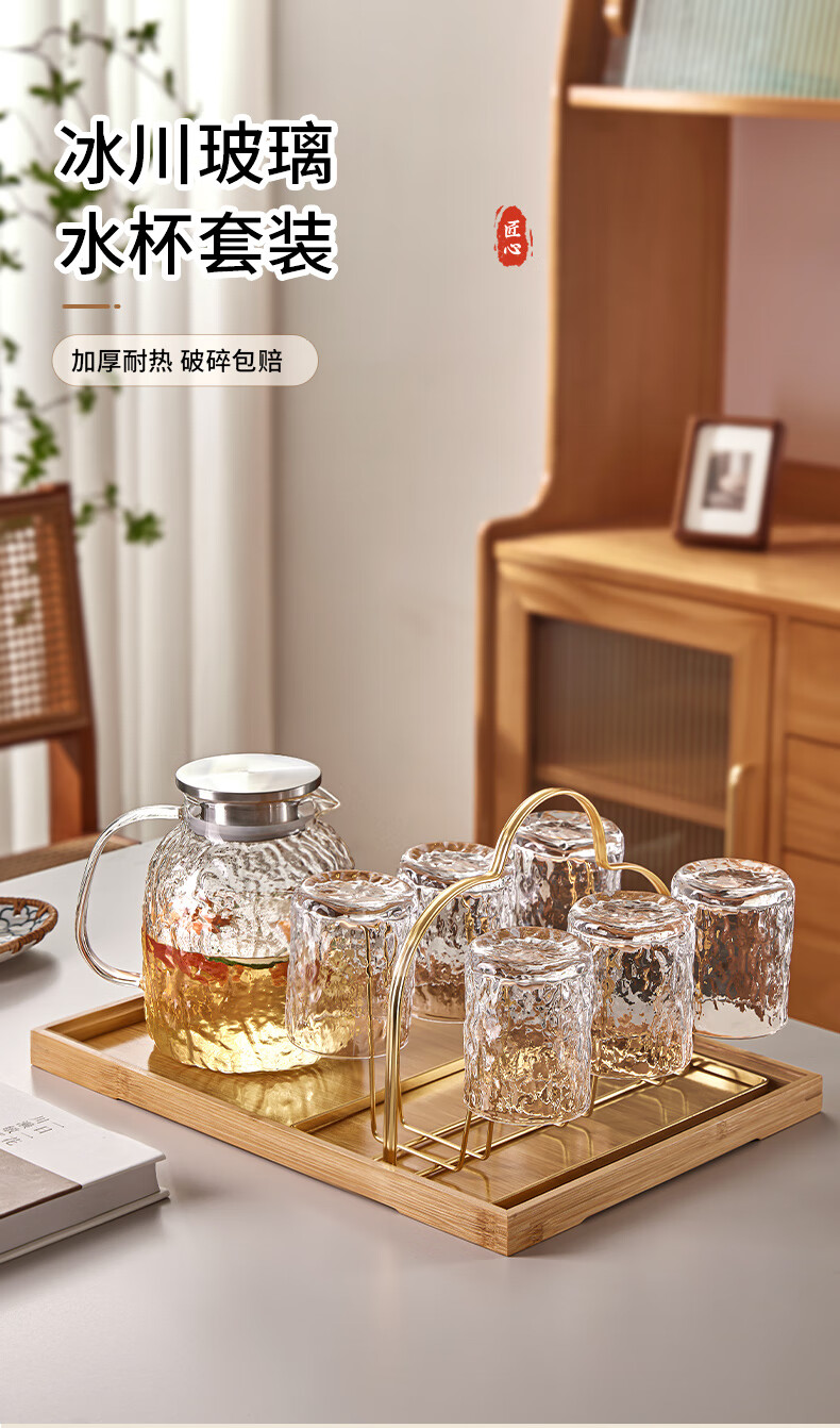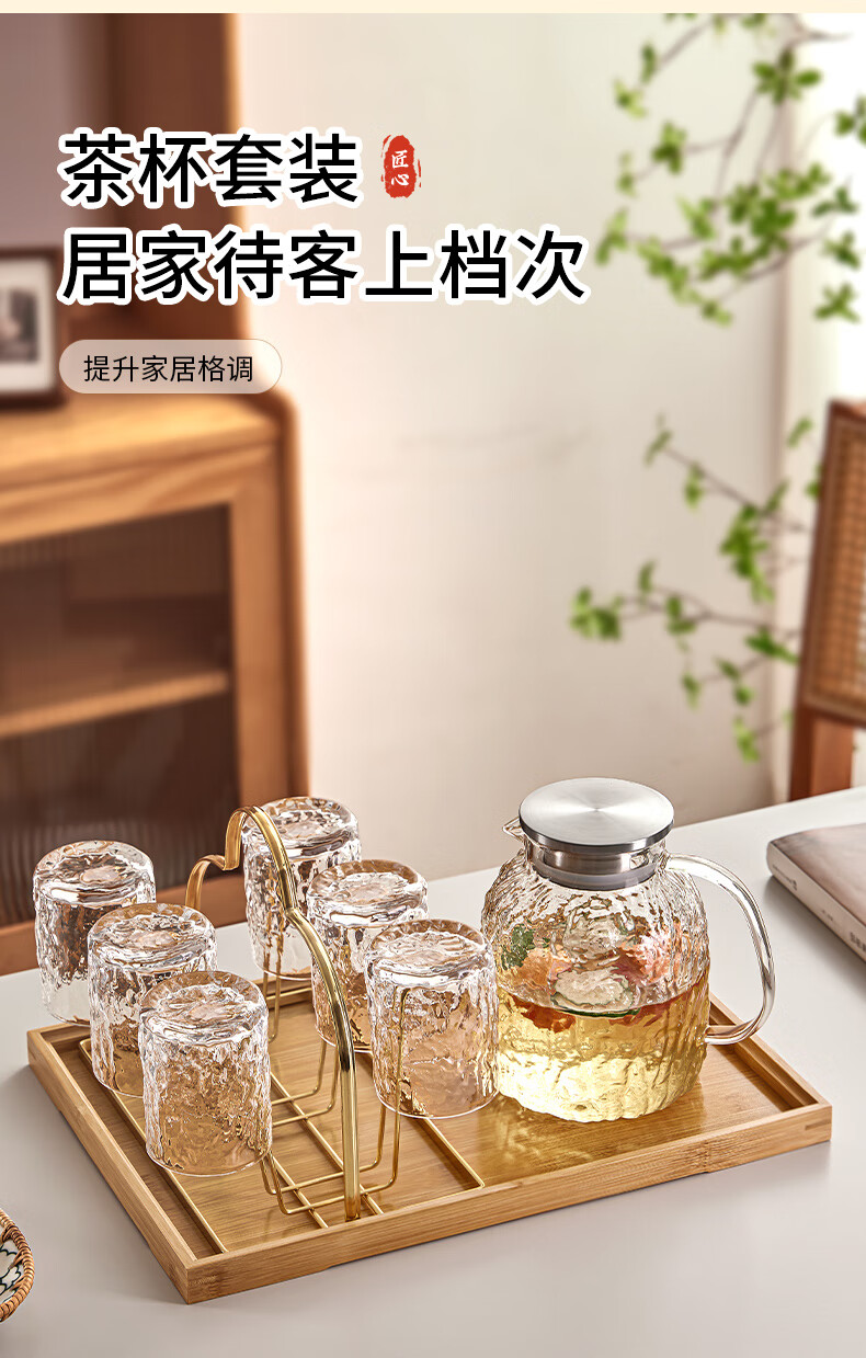 Yagang Light Luxury Glass High Temperature Resistant Household Drinking Water and Tea Cup Set High-Looking Living Room Hospitality Tea Cup Juice Cup Ice Crystal Cup 6 + Cloud Cup Holder + Large Log Tray + Pot