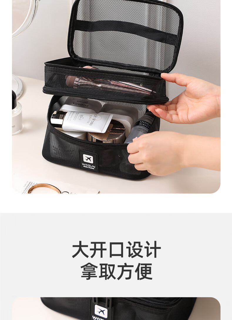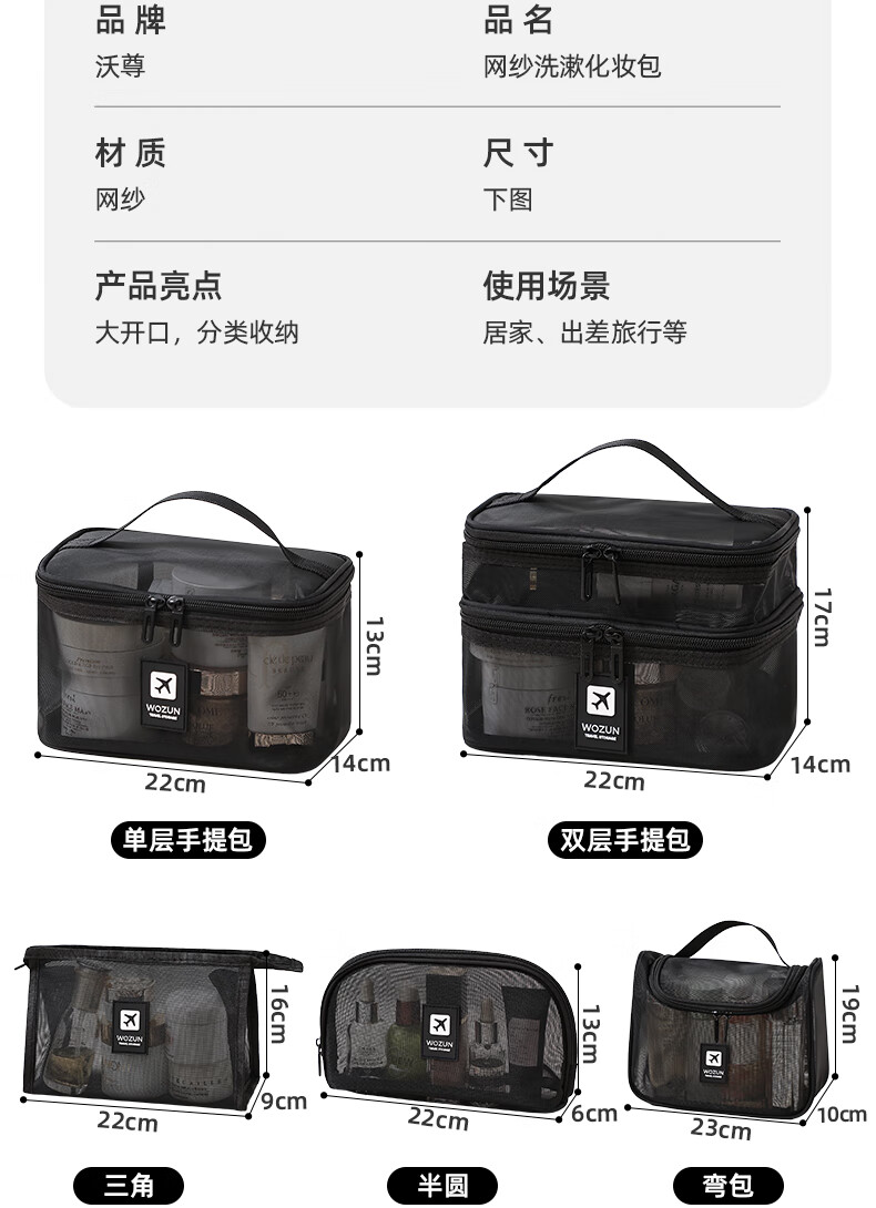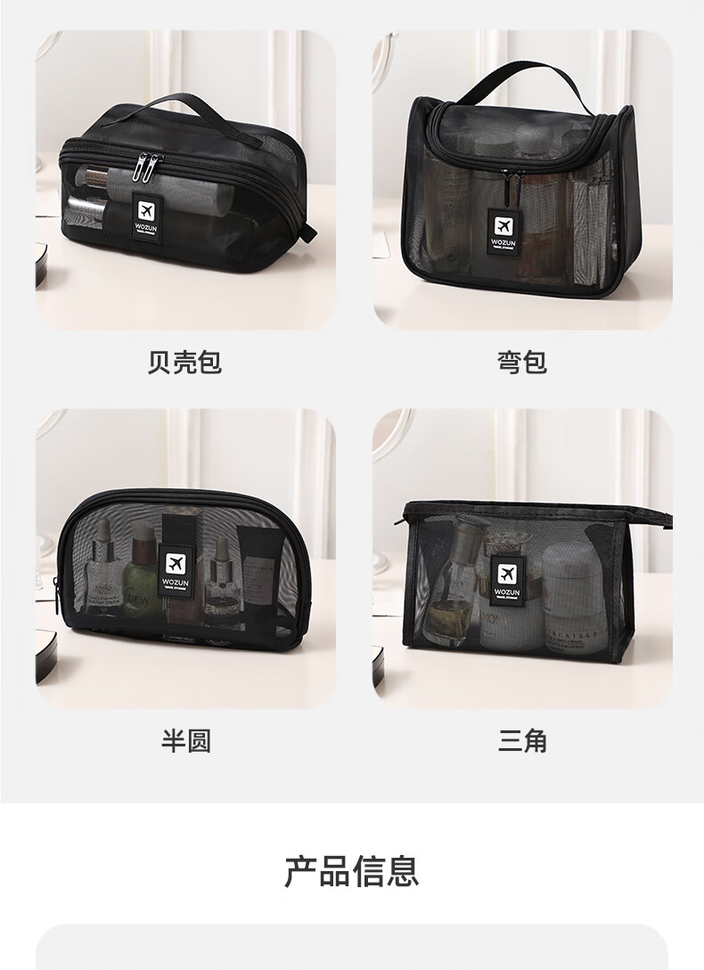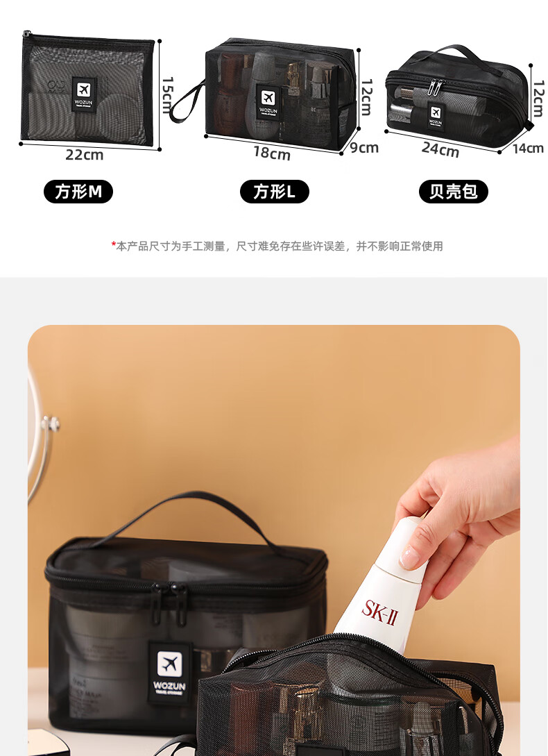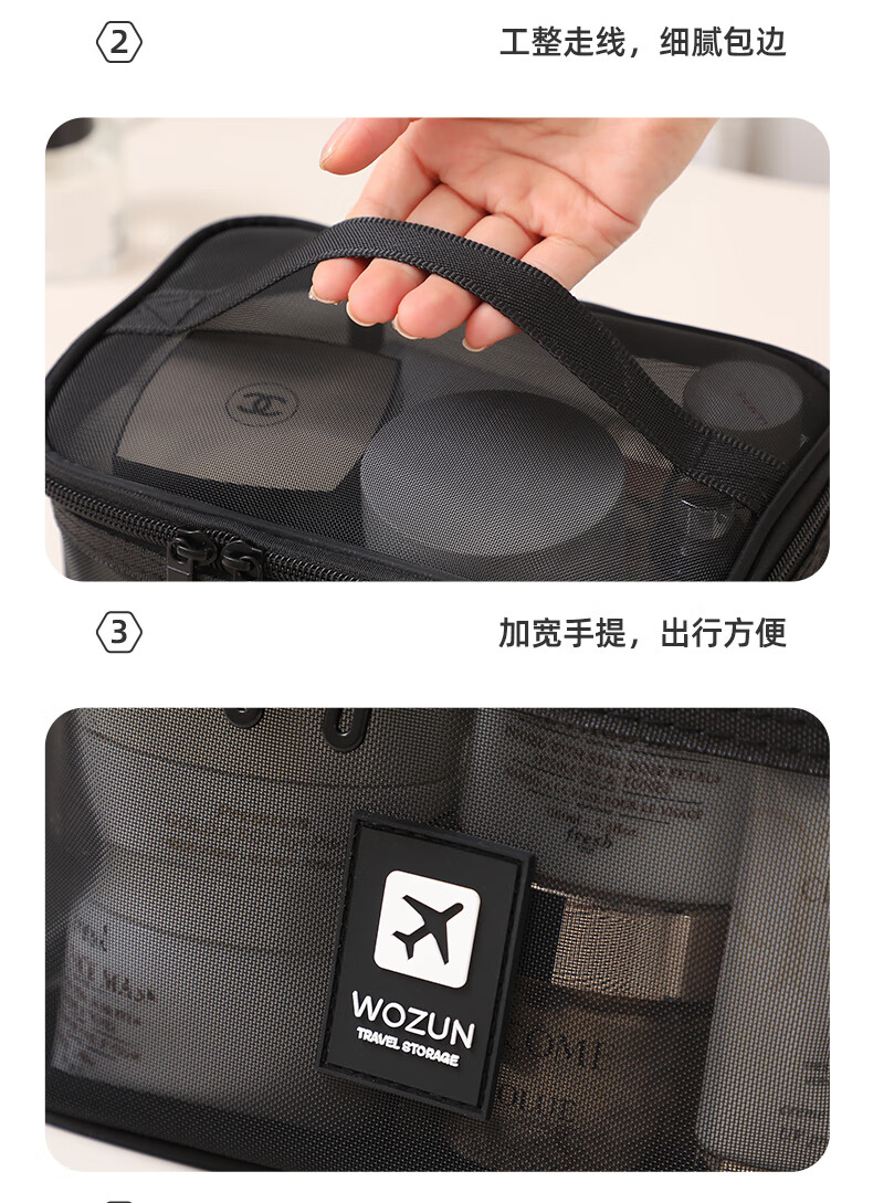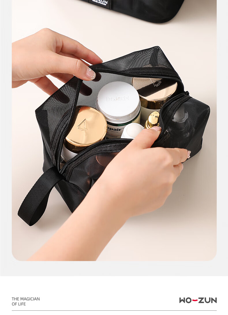 Wozun Mesh Transparent Cosmetic Bag Women's Portable Large Capacity Cosmetic Storage Bag Business Travel Toiletries Bag Storage Bag Black Triangular Thickened Mesh