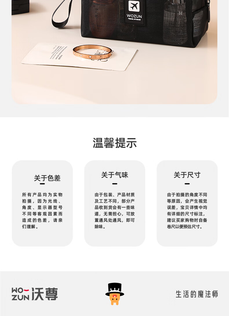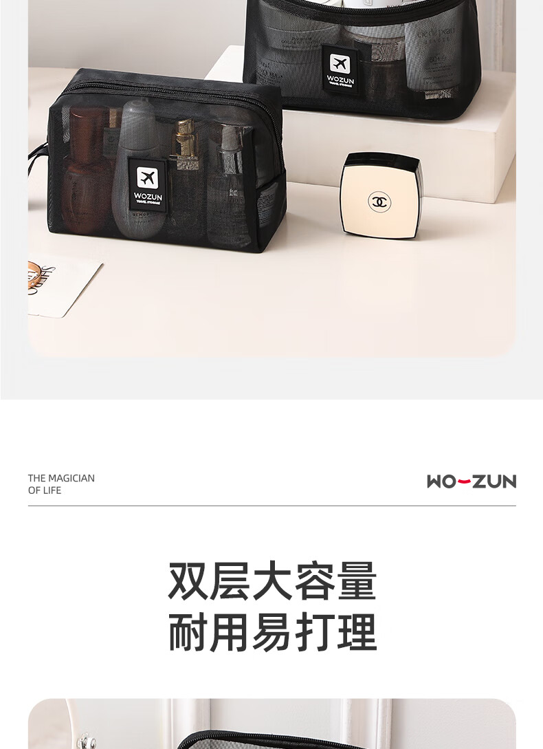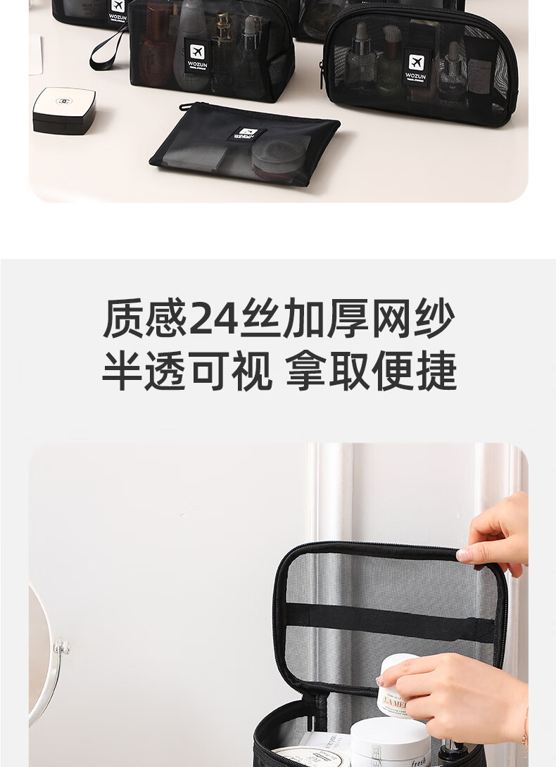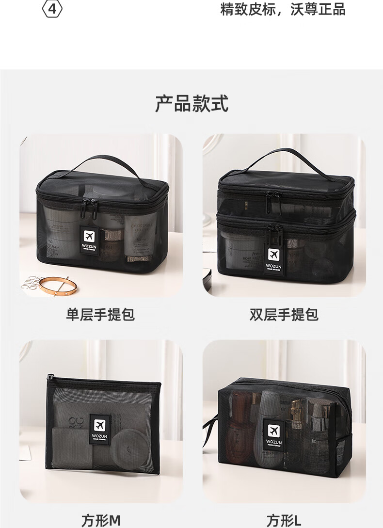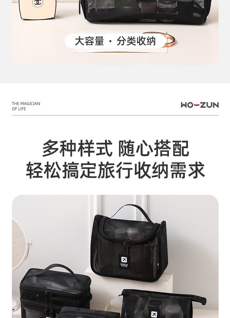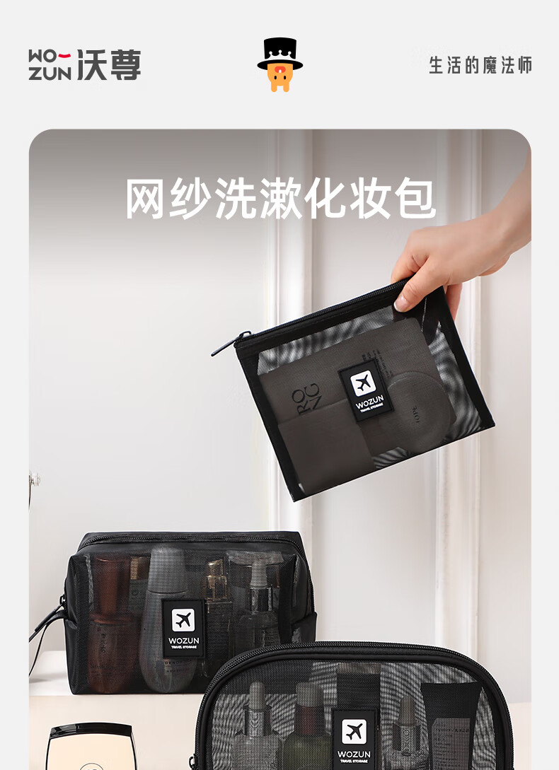 Wozun Mesh Transparent Cosmetic Bag Women's Portable Large Capacity Cosmetic Storage Bag Business Travel Toiletries Bag Storage Bag Black Triangular Thickened Mesh